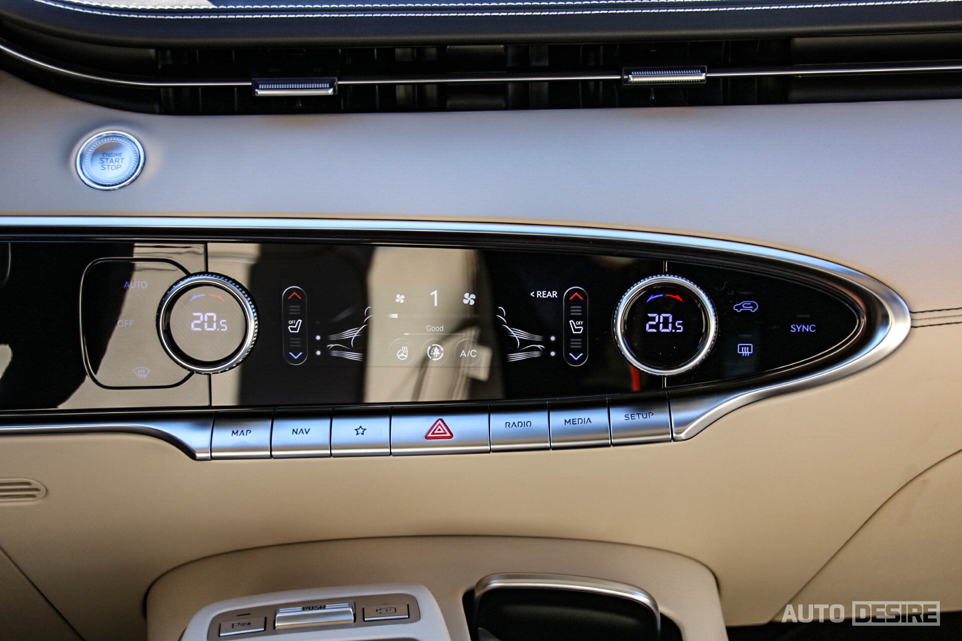 스포츠 패키지 미 적용 시 스티어링 휠의 디자인은 GV80과 동일하게 2-스포크 타입이 적용되며 센터 콘솔의 통합 컨트롤러와 변속 셀렉터는 다이얼 타입으로 적용, 보석처럼 세세한 마감으로 고급감을 높였다. 변속 다이얼은 G80/GV80과 동일한데, 통합 컨트롤러 다이얼은 돌출된 타입으로 미끄럼 적고 사용하기 더 편리해졌다. 두 다이얼 간 사이즈와 마감 패턴이 다르기 때문에 헷갈릴 걱정은 크게 하지 않아도 될 듯.