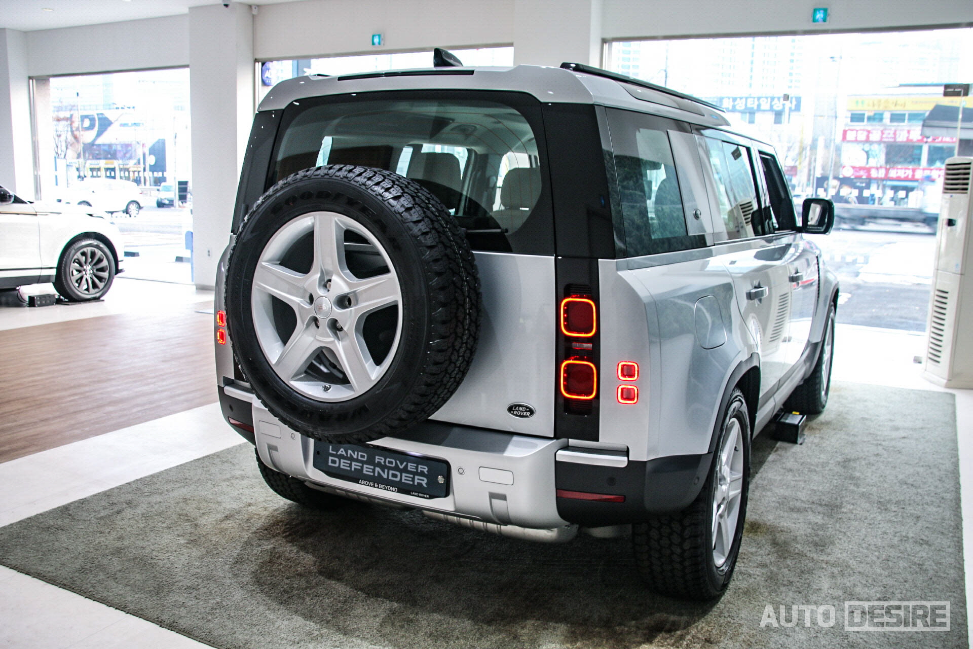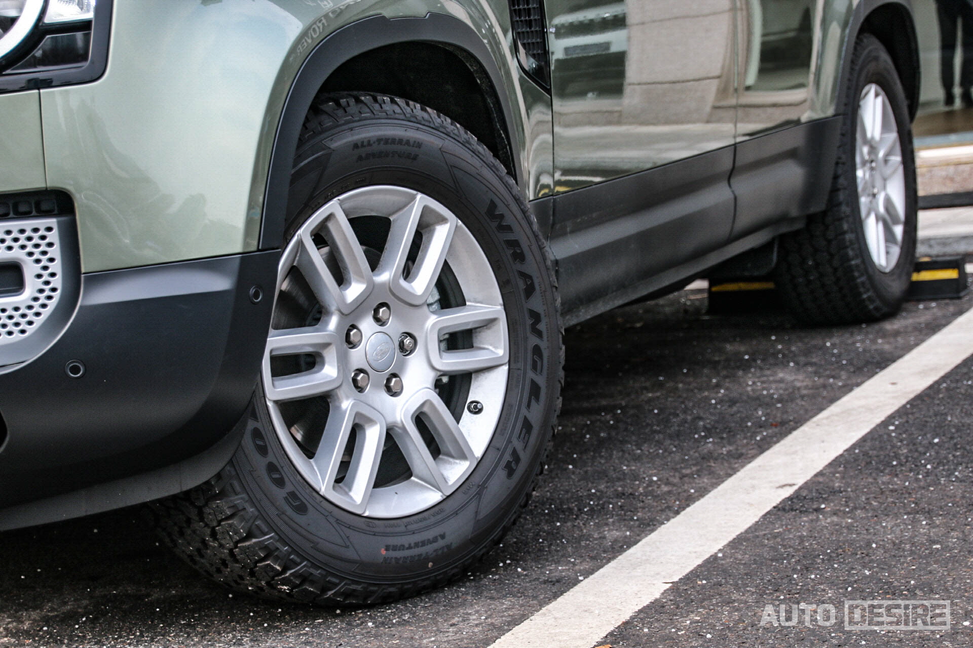 타이어부터 모든 지형에 대응할 수 있게 오프로드용 굿이어 랭글러 올터레인 타이어가 기본 적용되며, 스페어타이어 역시 이와 동일하게 테일게이트에 완전히 노출되어 장착되어있고, 아래에서 위가 아닌 옆으로 열리는 테일게이트, 브레이크등과 후진등, 턴 시그널이 각각 분리되어 있는 리어램프, 큼지막하게 범퍼를 감싸는 스키드플레이트 디자인에서 많은 부분이 현대적으로 바뀌고, 알루미늄 모노코크 바디가 적용되었음에도 이 차가 본격적인 오프로더, 디펜더의 후예라는 것을 전해준다.