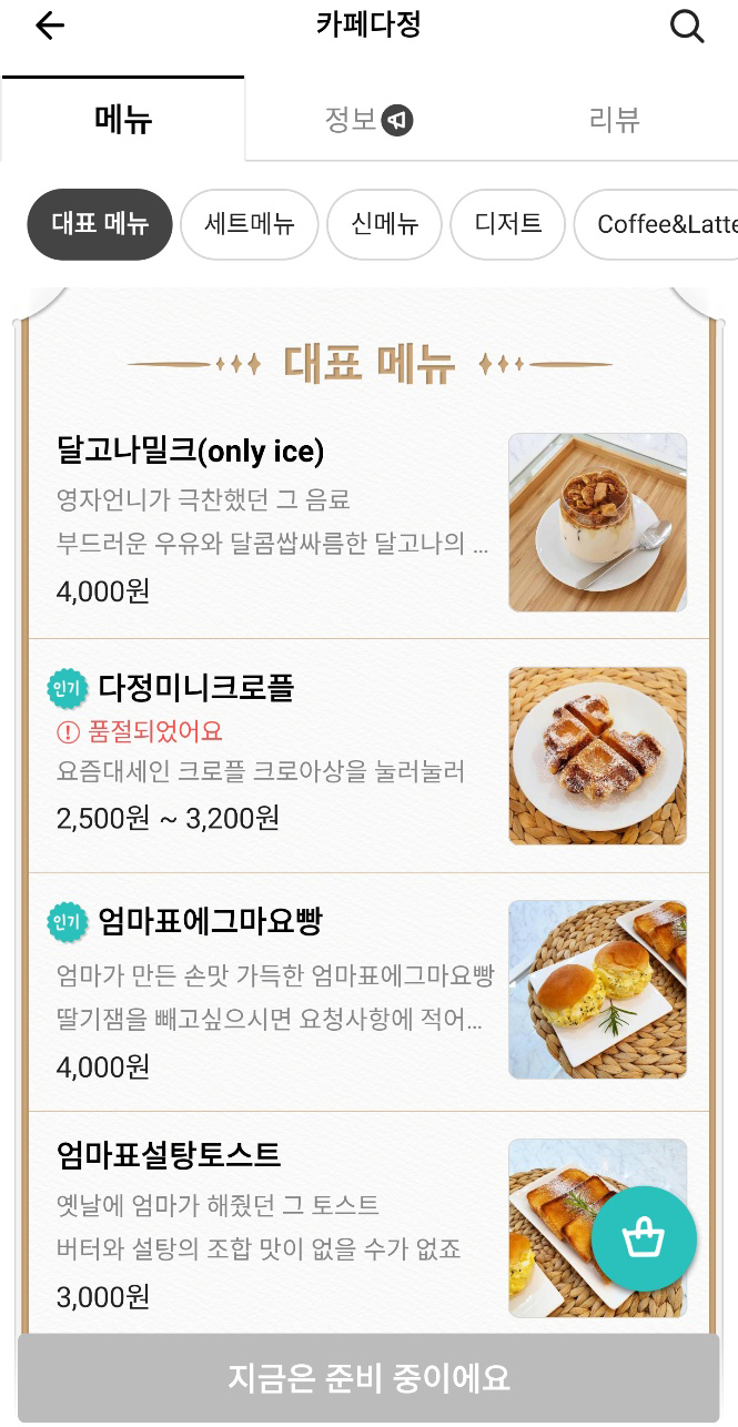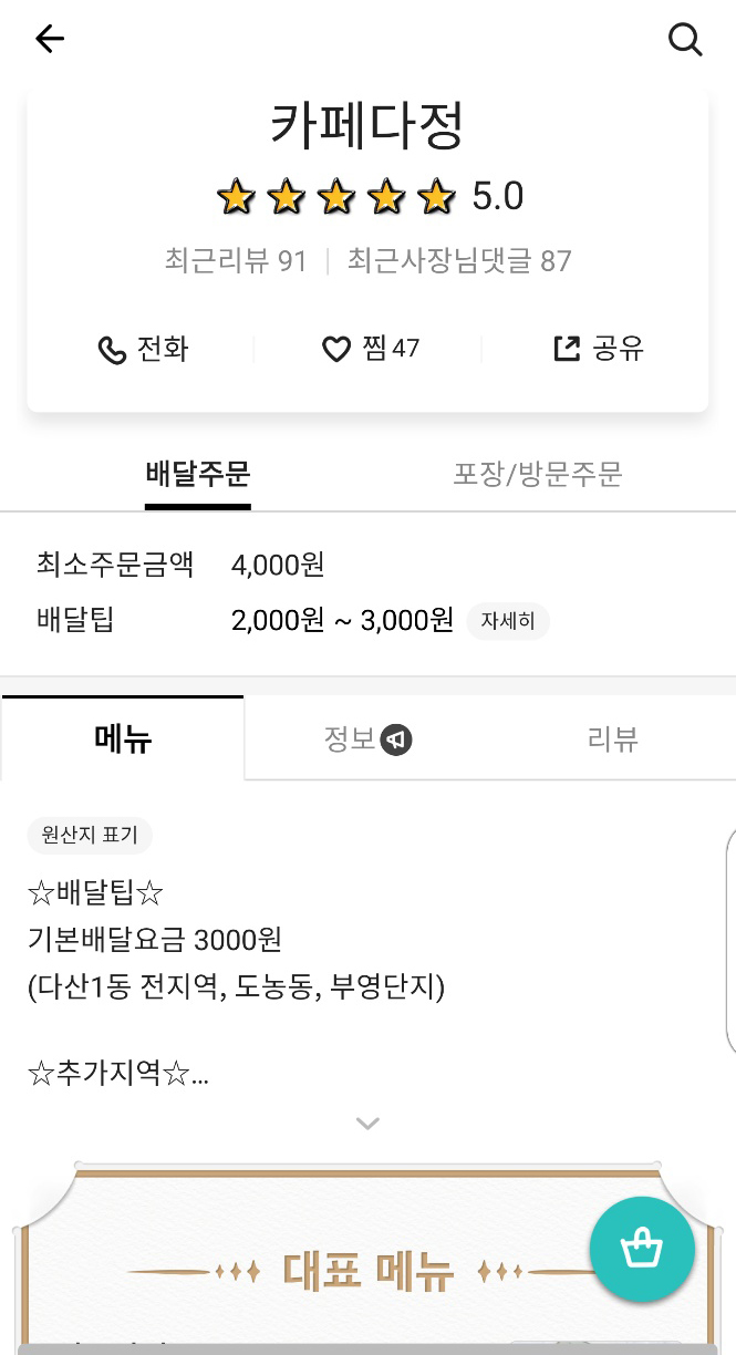 코로나19로 인해 집콕하고 계시는 분들은 남양주 다산신도시 다산1동 전 지역, 도농동 인근에서 배달로 카페 다정을 만나실 수 있고 배달 요금 추가에 따라 다산2동, 가운동, 지금동, 구리 지역까지도 배달의민족, 요기요, 쿠팡이츠 배달앱으로 이용이 가능합니다. 지금도 배달로 많은 분들이 커피와 디저트, 빵, 토스트 주문하시고 만족하고 계시구요.