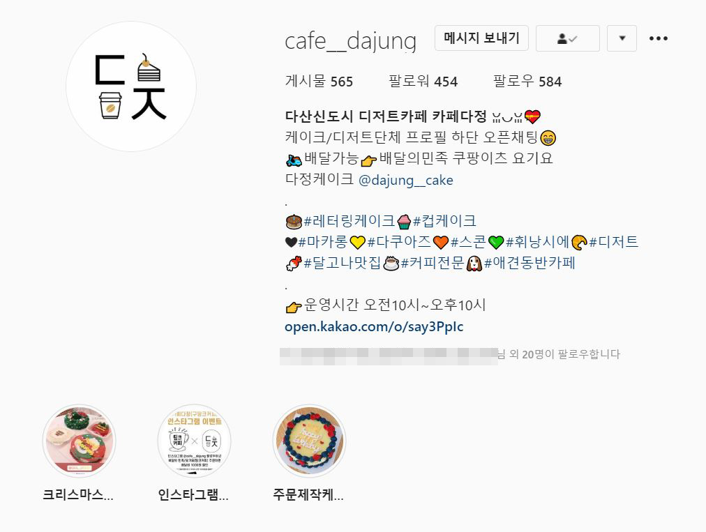 인스타그램 계정 @cafe_dajung 과 @dajung_cake 에서 카페 다정에서 그날 그날 만드는 디저트 정보와 주문 제작으로 만드는 케이크 정보와 이미지도 만나실 수 있습니다. 가족, 친구, 지인 생일 챙기실 때 재밌는 메시지까지 함께 담긴 케이크로 챙겨주면 의미가 또 남다르겠죠?