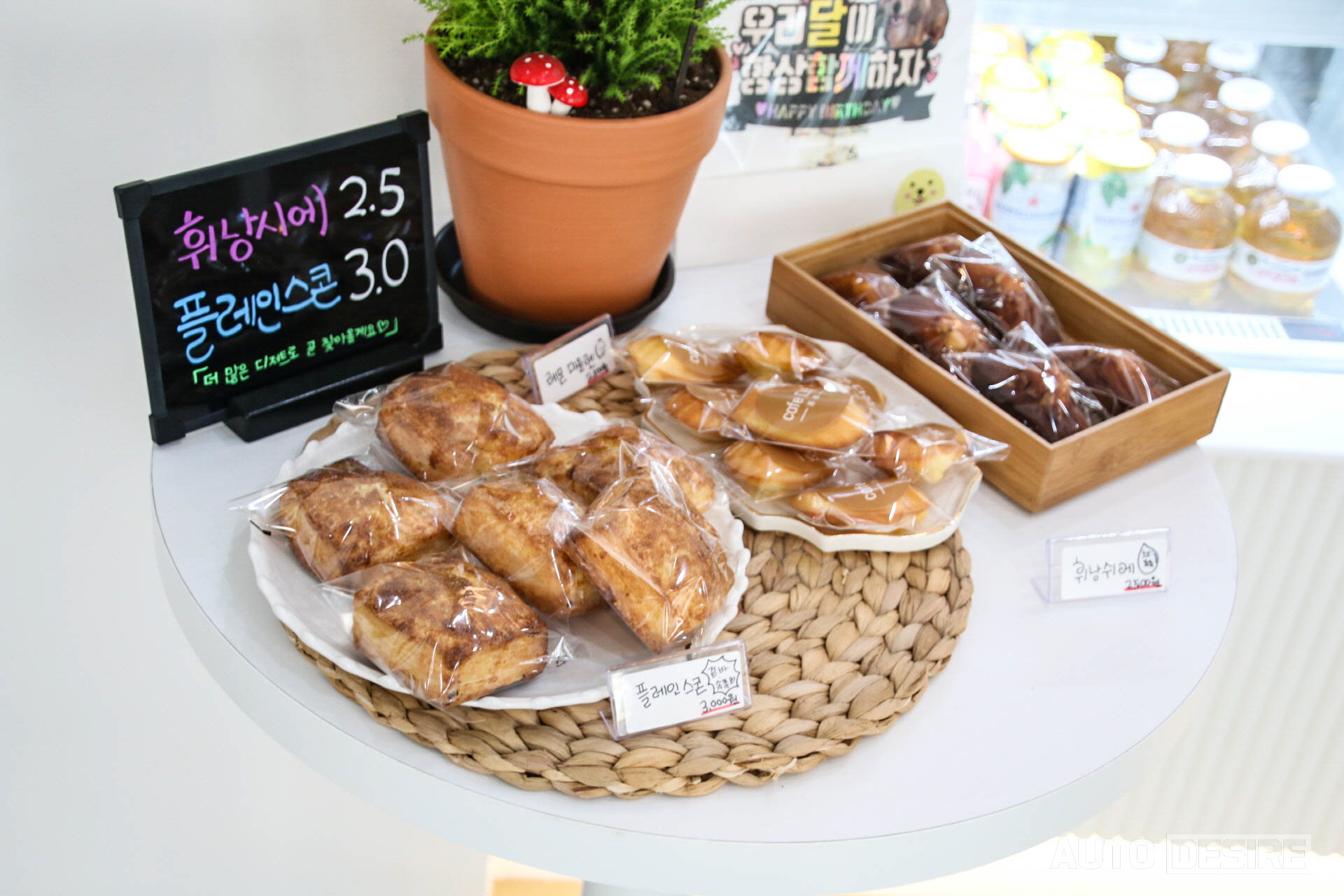 실온 보관 가능한 빵, 디저트류는 완성된 모습으로 진열된 모습을 확인할 수 있는데요, 이날은 플레인 스콘과 레몬 마들렌, 헤이즐넛 휘낭시에가 준비되어 있었고, 케이크, 마카롱 종류는 냉장 보관! 에그마요빵, 설탕토스트, 와플 종류는 주문 시 제조! 물론 다른 디저트와 주문 제작되는 케이크도 카페 다정에서 직접 베이킹을 해서 제공해드리고 있습니다~