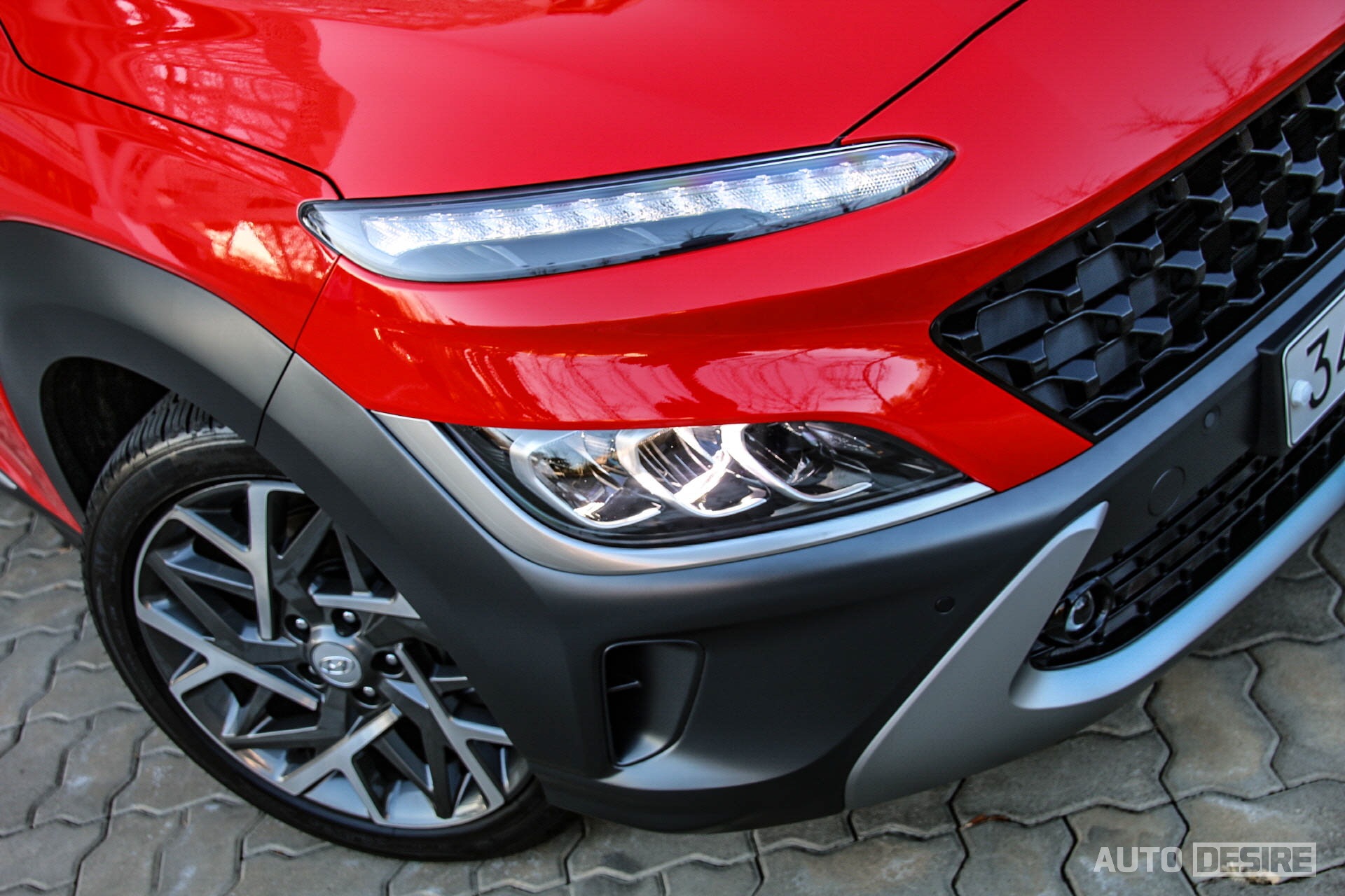 다만 페이스리프트를 거치면서 기존 코나에서 '더 뉴 코나' 자체의 스타일은 비록 그 변화가 대중들에게는 호불호가 많이 갈릴지라도 파격적인 수준으로 많이 달라졌다. 컴포지트 타입 헤드램프를 비롯해, 기본적인 배치는 기존 코나의 흔적이 남아있기는 하지만 더 날카로워진 인상의 LED 헤드램프와 주간주행등, 후드 위쪽으로 옮긴 엠블럼, 테두리를 없애고 더 와이드 해진 느낌을 주는 프런트 그릴, 무광 파츠를 더 확대 적용해 상하 구분이 확실해진 범퍼에 클램프 형태의 두꺼운 가니시까지 전보다 더 날렵하면서, 또 '센슈어스 스포티니스'의 디자인 언어를 적극적으로 반영한 모습이다.