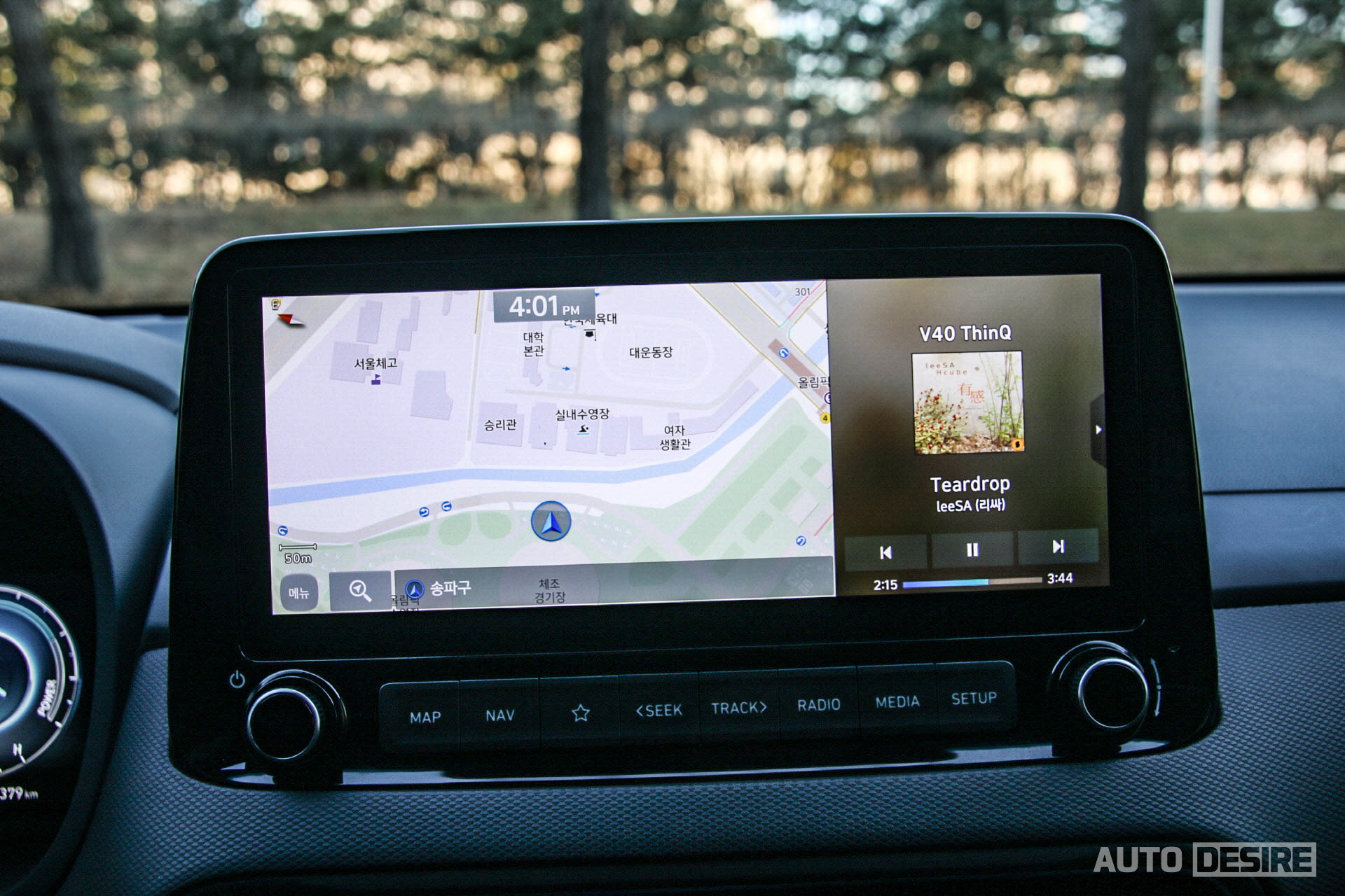 10.25인치 내비게이션 디스플레이의 사이즈는 기존과 동일하지만 인포테인먼트 시스템은 업그레이드, 신규 그래픽과 함께 새로운 편의 기능으로 발레 모드와 현대 카페이, 디지털 키, 내비게이션 무선 업데이트 등을 지원하고 차량 전후방 영상 촬영이 가능한 빌트인 캠(내장형 블랙박스)도 장착되었다. (풀체인지 모델인 올 뉴 아반떼에는 빌트인 캠이 빠지고, 오히려 부분 변경 모델인 더 뉴 코나에는 적용되었는데, 이 역시 구조적인 문제인지 아니면 다른 이유가 있는지 의문이 남는다.) 더 뉴 코나 가솔린 모델과 차이점은 하이브리드 메뉴가 존재한다는 점 정도.