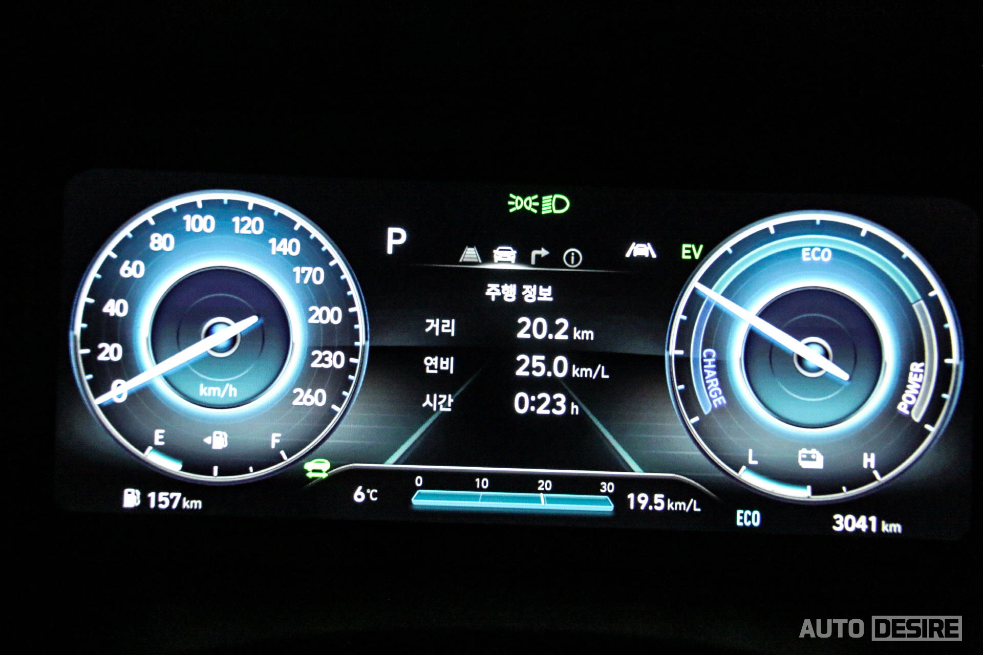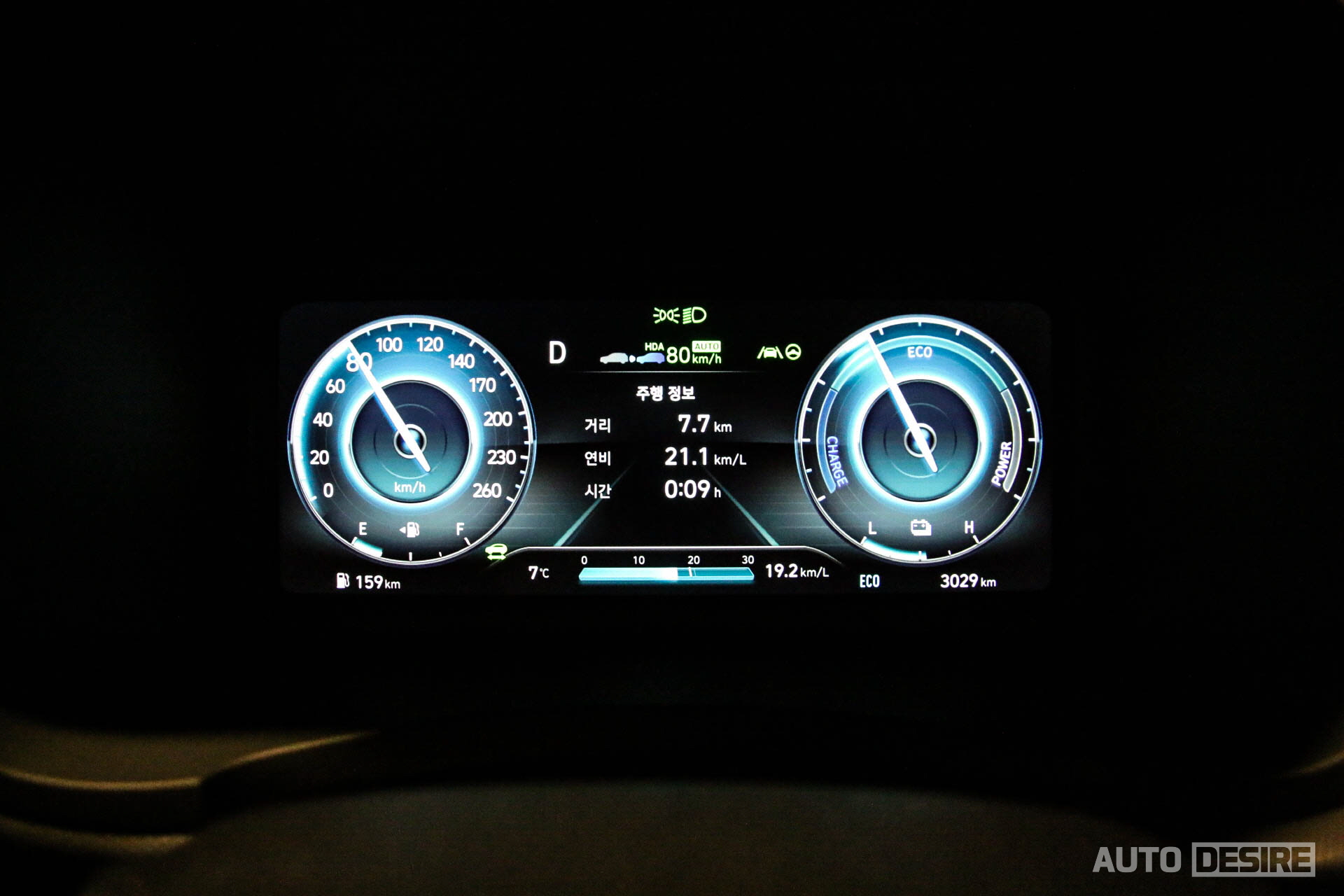 주행 모드에 따라서 그래픽이 변경되는 10.25인치 LCD 클러스터가 적용되어서 이전의 기계식 계기판에 비해 더 고급스럽고 화려한 느낌이 들기는 하는데, 별도 주행모드 변경 버튼은 없으며 친환경 모델이라 그런지 에코 모드가 기본, 수동 변속을 사용하면 스포츠 모드로 변경되어 계기판 그래픽도 같이 변경되는 방식. 같은 파워트레인의 올 뉴 아반떼 하이브리드는 에코 모드가 없었고 노멀 모드가 기본에 스포츠 모드, 스마트 모드를 선택할 수 있던 것과 다른데 그 이유가 무엇인지는 궁금증이 좀 남는다.