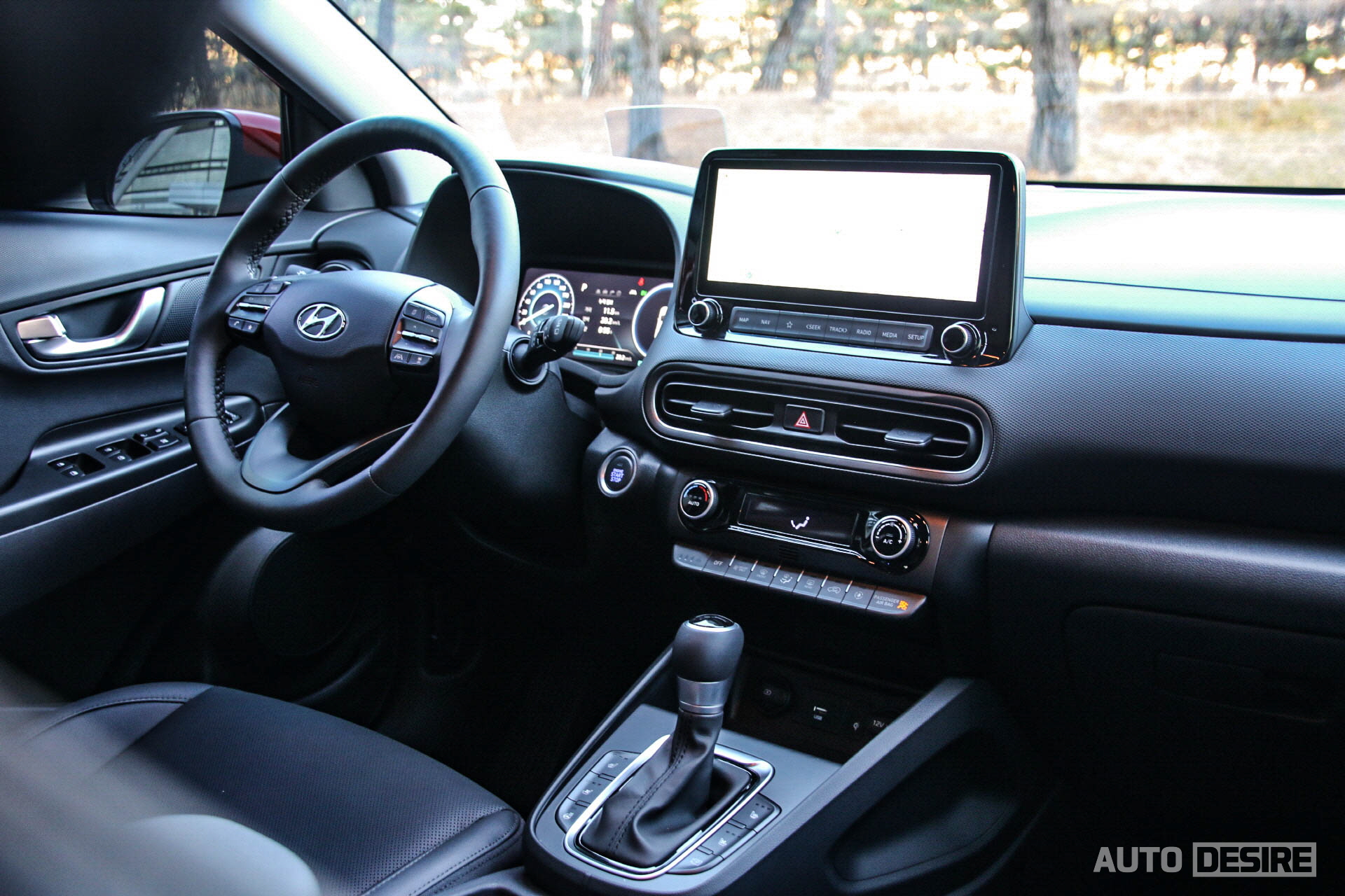 실내는 새로운 스타일의 송풍구와 10.25인치 LCD 클러스터가 적용되고, 공조 컨트롤러와 스티어링 휠의 버튼 배열이 조금 달라진 것 외에는 디자인적인 변화는 거의 없으며, 주로 편의 사양을 더 개선, 추가하는 정도로 변화가 이뤄졌다. 더 뉴 코나 가솔린 모델에 이번에 추가된 10.25인치 내비게이션 역시 코나 하이브리드는 이미 2020년형부터 적용되었던 부분이다.