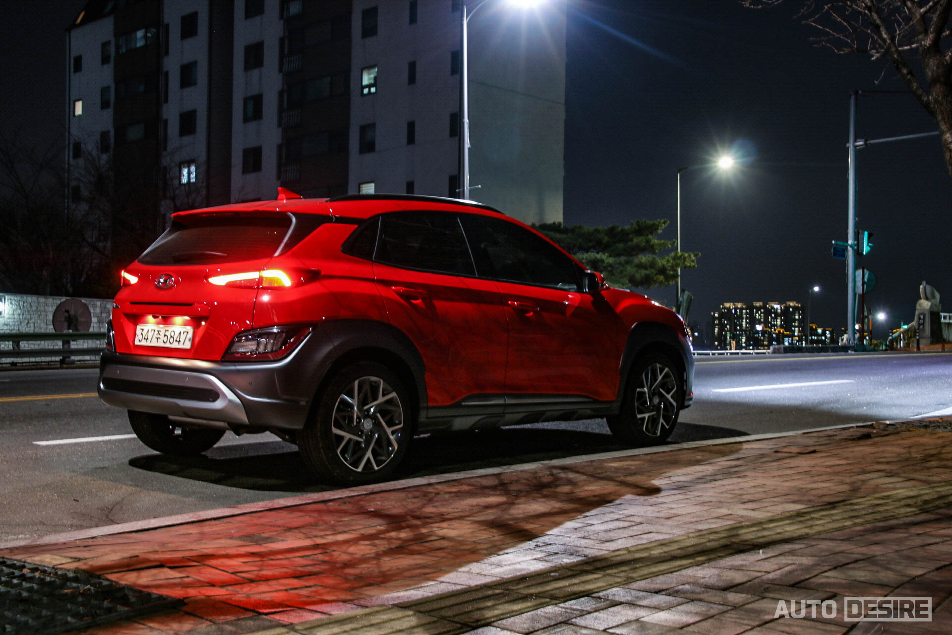 전장이 기존보다 40mm 더 늘어나긴 했지만 육안으로 크게 식별될 정도는 아니며, 측면의 모습은 기존과 크게 다르지는 않다. 다만 뒷모습에서는 리어램프의 그래픽을 변경하고 하단에 신규로 적용한 LED 턴시그널과 후진등, 펜더 라인을 따라 내려오는 리플렉터 디자인으로 이전보다 좀 더 화려한 스타일을 보여준다. 뒤 범퍼 역시 전체에 도색 없이 무광파츠로 변경하고 스키트 플레이트 사이즈를 더 확대했다. 이런 부분들은 더 뉴 코나에 SUV로서 이미지를 좀 더 살리려고 한 것 같은데, 이 부분에 있어서도 역시 소비자들의 호불호는 갈리는 듯하다. 필자 개인적으로는 나쁘지 않게 생각하는데, 색상은 레드보다는 블루 계열이 더 잘 어울리는 것 같다.