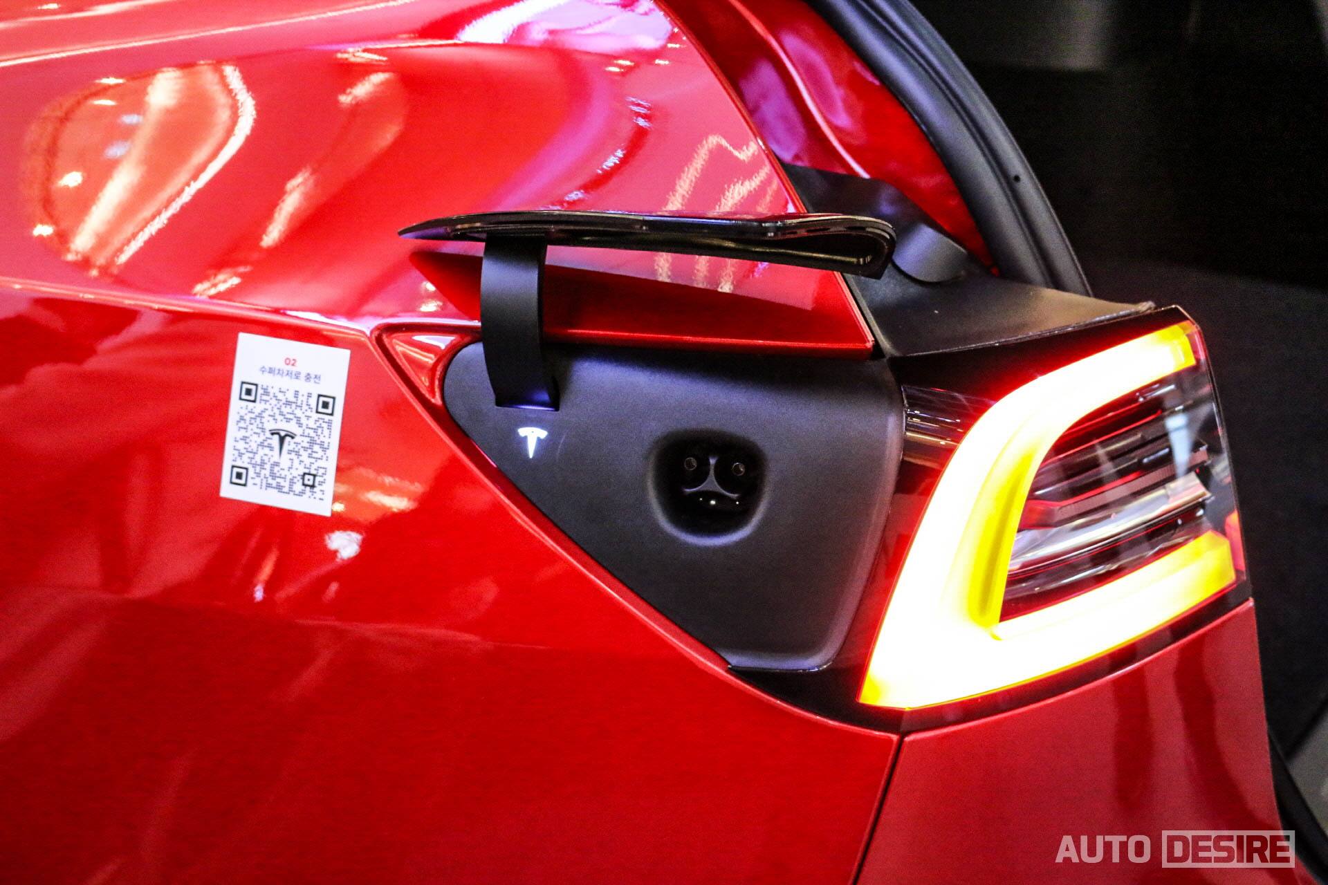 충전 포트 역시 모델 3와 동일하게 운전석 방향 리어램프 측면 커버를 누르면 열리고, 열리면 조명이 같이 들어오게 된다.