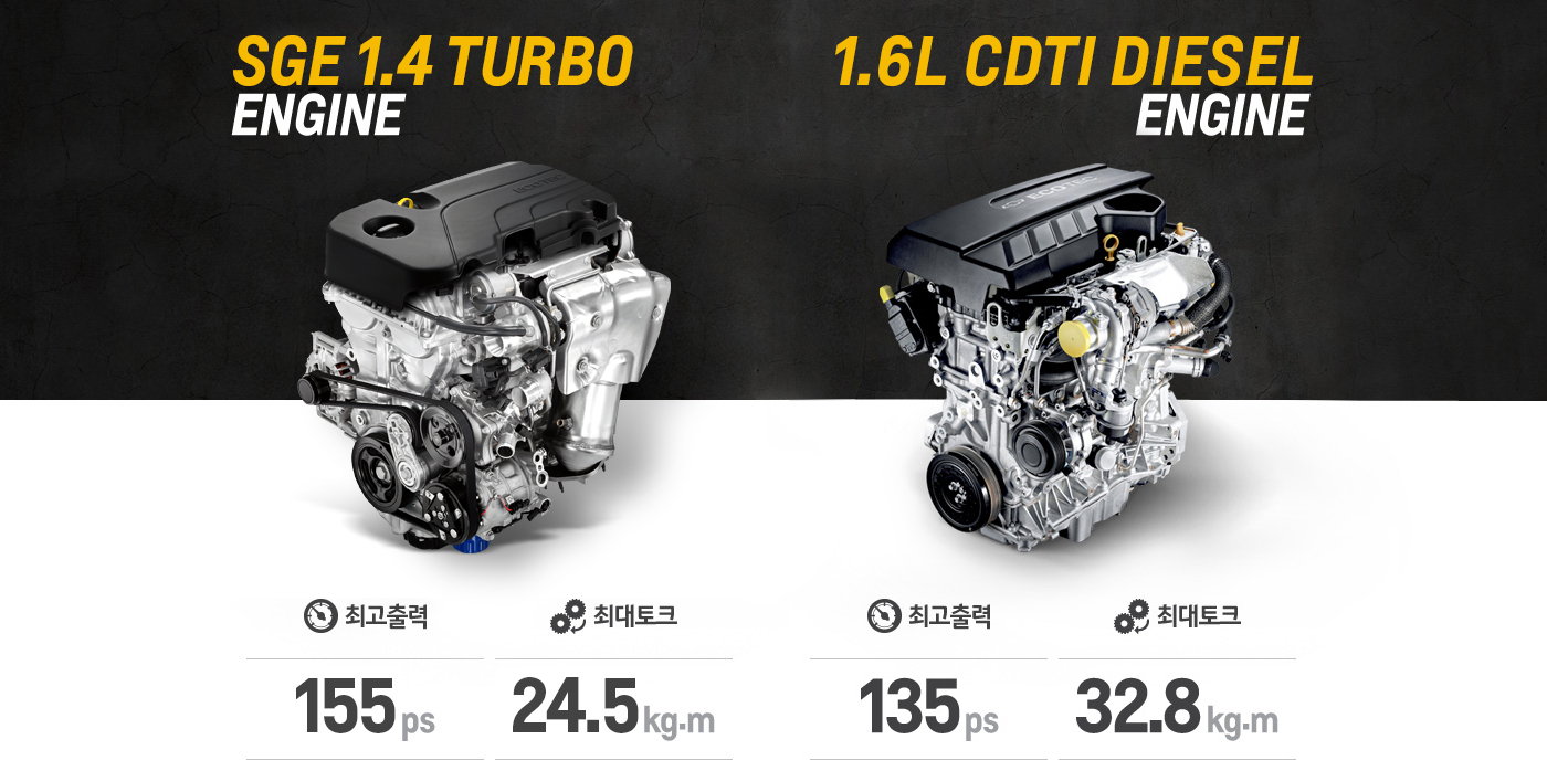 이번 트랙스의 가장 큰 변화는 엔진의 변화로 기존 FAM0 1.4 가솔린 터보 엔진을 SGE(Small Gasoline Engine) 1.4 가솔린 터보 엔진으로 변경해 최고출력 155마력, 최대토크 24.5kg.m을 발휘해 기존 엔진보다 최고출력 10마력, 최대토크 4.1kg.m이 더 높아졌고, 엔진 변경과 함께 제3종 저공해차 인증을 받아 수도권 공영주차장 50% 할인과 전국 14개 공항 주차장 20% 할인 혜택을 받을 수 있다. 변속기는 기존과 동일하게 6단 자동 변속기가 적용되고 공인 연비는 복합 11.4km/L이다.