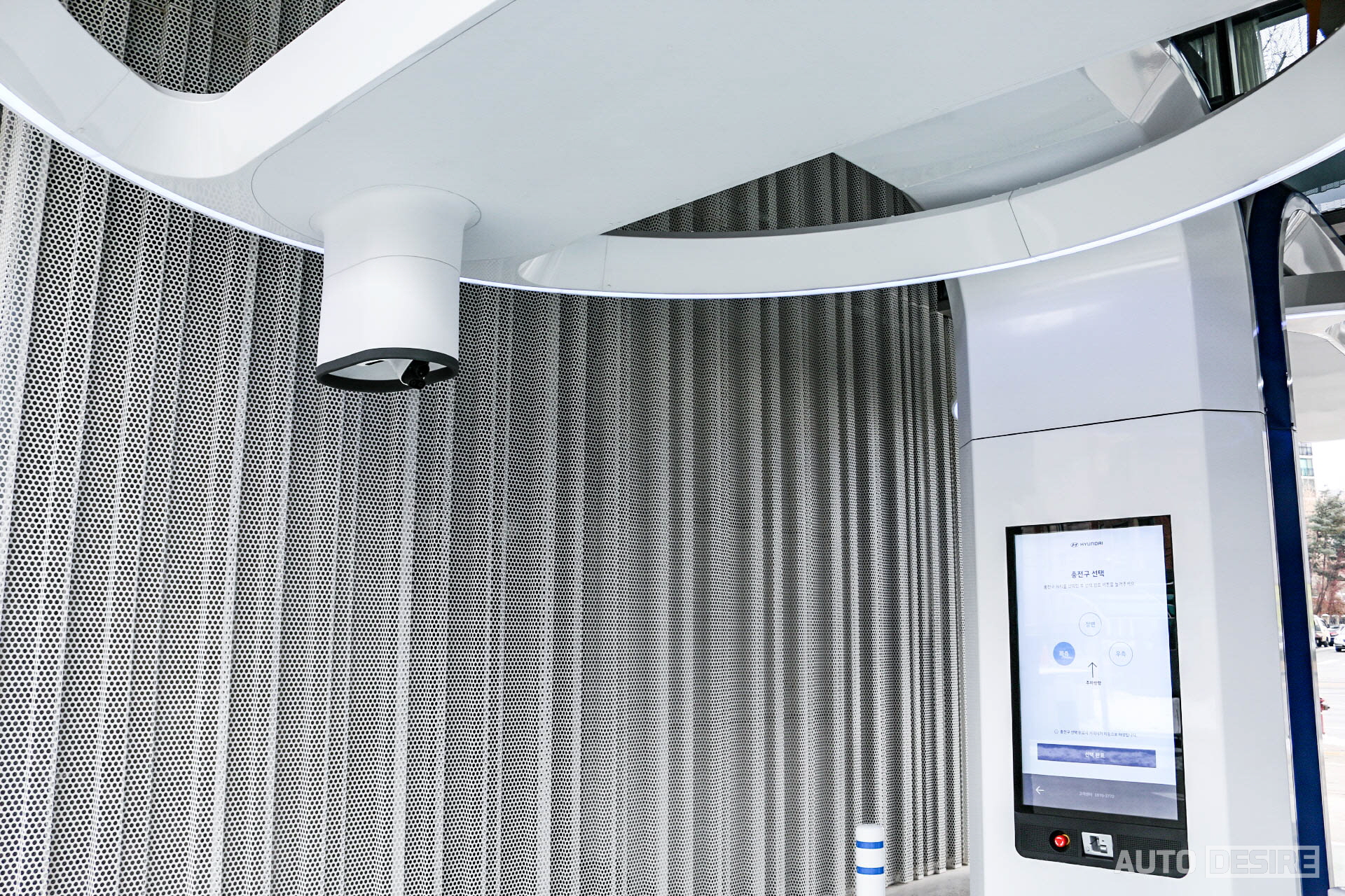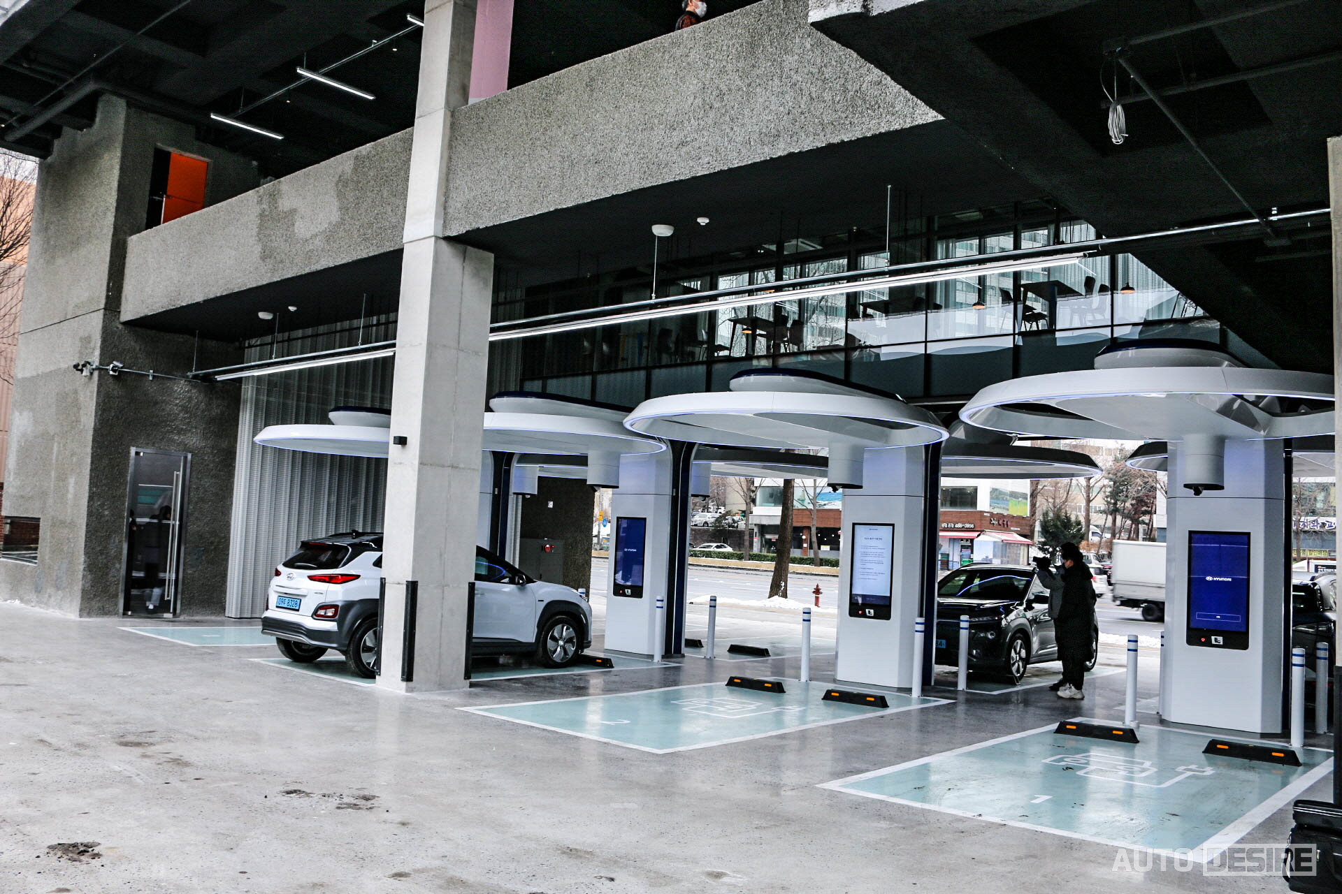 1층 EV Charging Station에 마련된 총 8기의 하이차저 초고속 충전기는 350kW 급 초고속 충전으로 800V 시스템을 사용하는 신형 전기차, 앞으로 출시될 아이오닉 5, eG80의 경우 18분 만에 80%까지 충전이 가능하고, 400V 시스템 전기차에도 물론 사용이 가능해 기존 코나 일렉트릭의 경우에는 80% 충전하는데 54분이 소요된다.