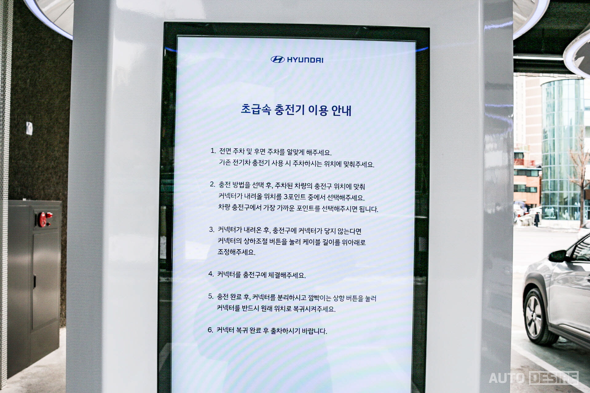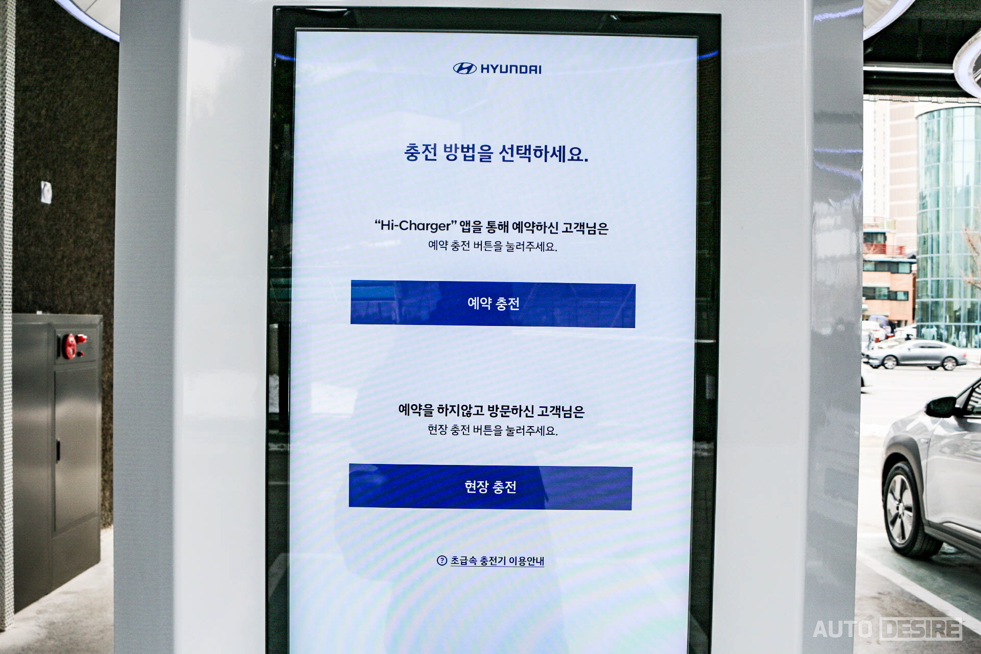 충전하는 방법도 간단해서 충전 구역에 차를 주차한 뒤, 터치스크린의 시작을 누르면 이용 안내 설명도 확인이 가능하고, 현장에서 바로 충전하는 경우 현장 충전을 선택한 뒤 충전할 용량/금액을 선택하고 결제를 하고 안내에 따라 충전을 진행하면 되고, 현대 Hi-Chager 앱을 이용해 미리 예약한 현대 전기차 고객의 경우 예약 충전을 선택해서 이후 안내에 따라 진행하면 된다. 특히 Hi-Charger 앱 현대자동차 전기차 고객의 경우 23% 전기차 충전 요금 할인 혜택도 제공되고, 예약을 통해 다른 차량들보다 우선순위로 대기시간 없이 먼저 충전할 수 있다.