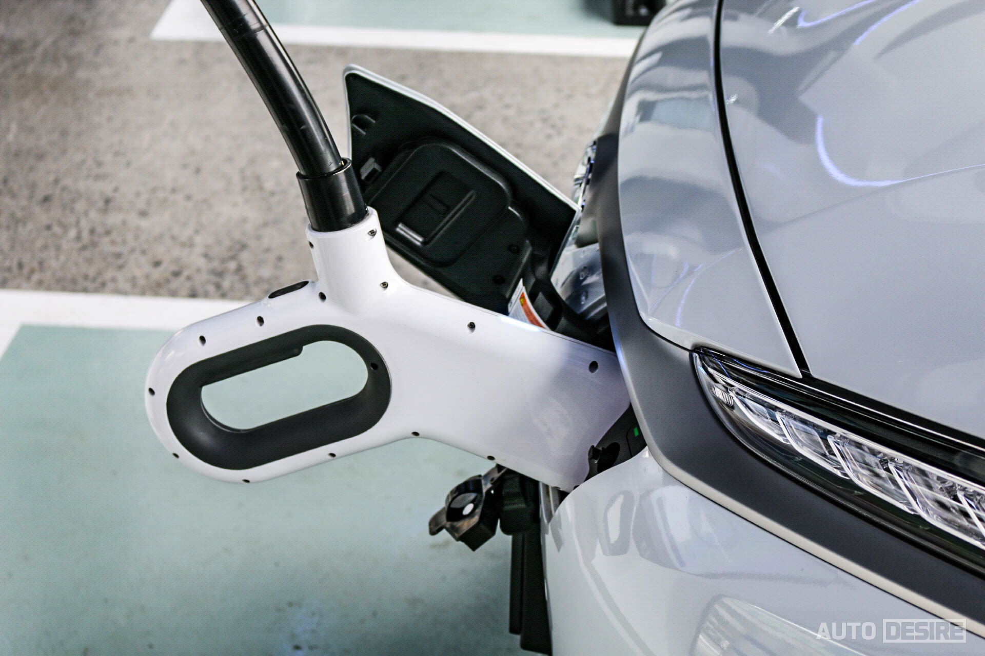 위치 선택을 완료하면 충전기 커넥터가 차의 높이에 맞게 내려오며, 손잡이에 있는 화살표 터치 버튼으로 조절해서 커넥터와 차량을 연결해 충전을 시작하면 된다. (차량의 충전구 위치보다 살짝 아래로 맞춰준 뒤에 위로 올려 끼우는 식으로 하면 더 편하게 연결할 수 있다.) 덕분에 무거운 커넥터, 케이블을 질질 끌고 올 필요가 없다.