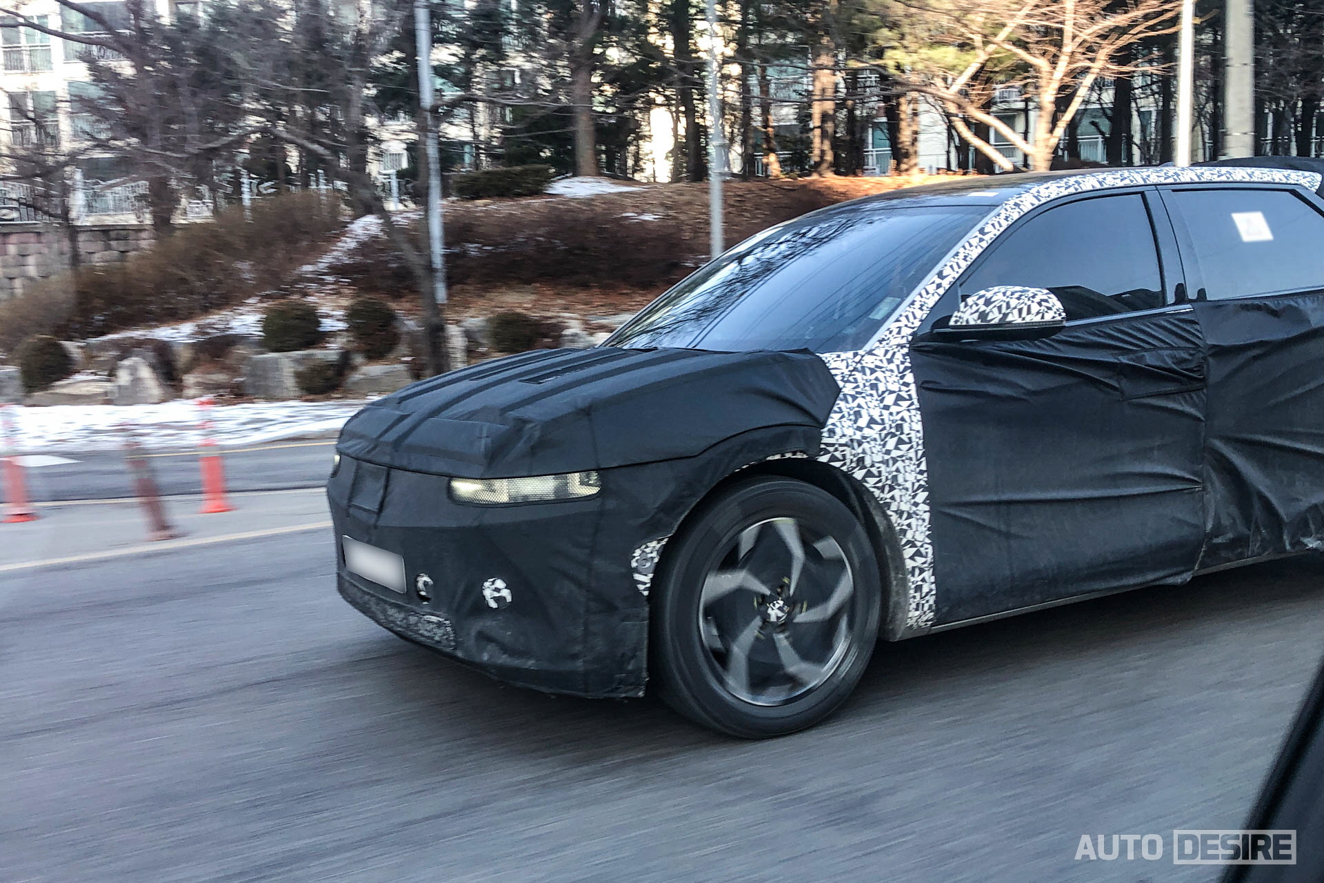 사실 이미 티저 이미지와 티저 영상을 통해 외관의 모습은 거의 다 공개가 되어 있기 때문에, 위장막으로 씌워져 있다고 해서 특별하게 신비하다거나 궁금증이 많이 남지는 않지만 주행하는 모습을 보면서 실제 느낌은 이렇구나, 또 실제 차체 사이즈는 어느 정도 사이즈인지 알기에는 도움이 되었다. 다만 테스트카의 경우 하위등급 모델 구성이라 그런지 사이드 뷰 카메라가 아닌 일반적인 사이드 미러가 장착되어 있고, 휠의 디자인도 티저 샷에서 보여준 것과는 다른 모습.