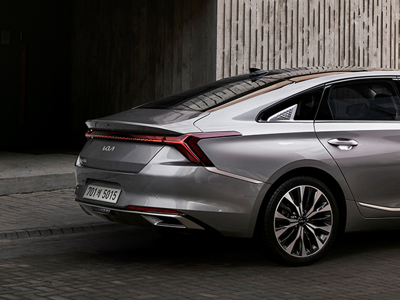 후면부는 미래지향적이면서도 안정감 있는 자세 구현을 위해 좌우가 길게 이어지는 리어램프에 끝은 범퍼와 펜더까지 길게 갈라지는 형태를 적용하고 루프라인을 따라 이어지면서 날렵하고 강한 인상을 만드는 스포일러 형태의 트렁크 리드, 간결하게 배치한 신규 기아 엠블럼과 K8 로고로 넓은 면, 안정감을 부각시켰다.