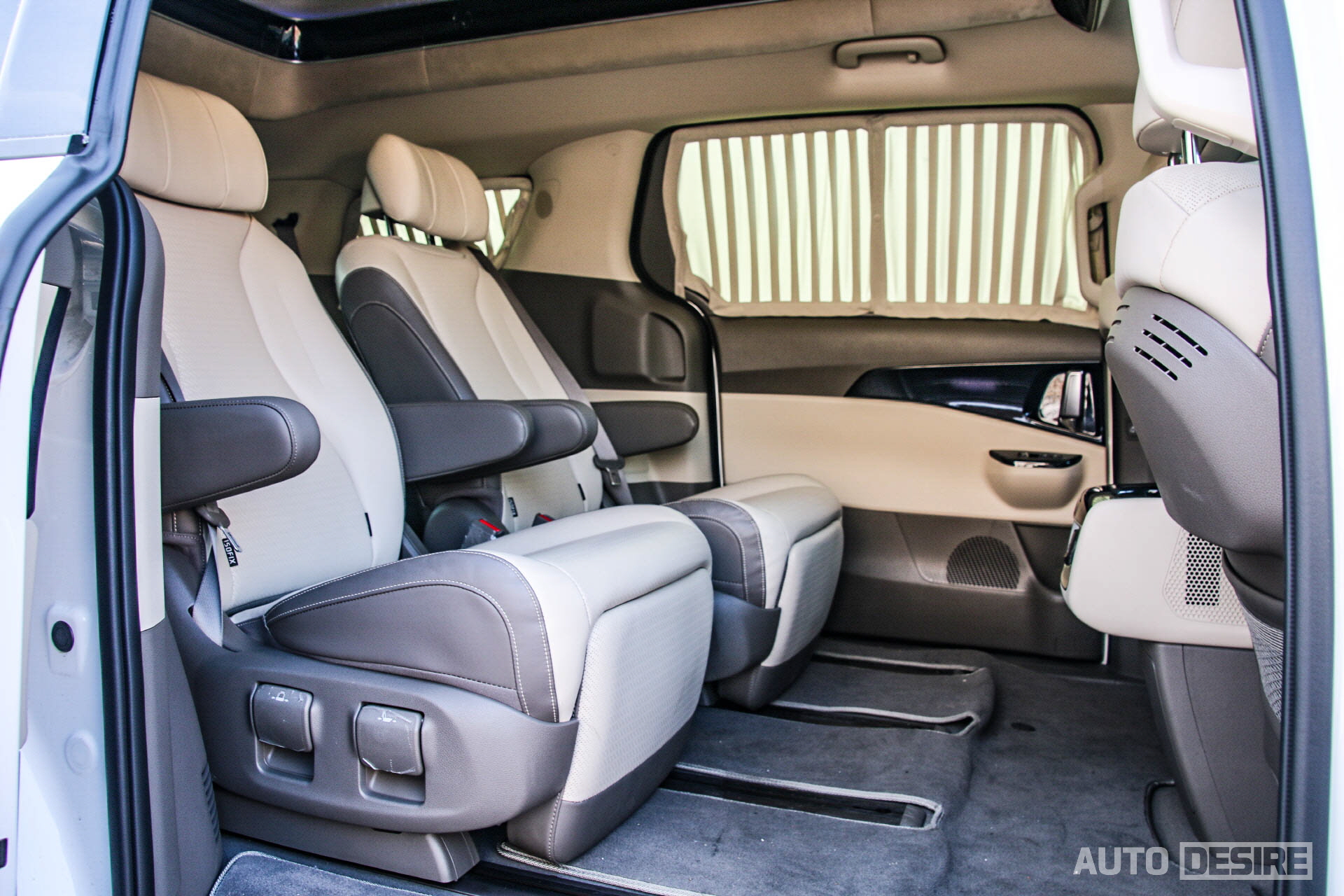 3열 시트를 접고 2열 시트를 가장 뒤쪽으로 쭉 밀어낸 상태에서는 말 그대로 '리무진'이라는 이름에 맞는 엄청나게 여유로운 공간을 제공한다. 후석 창문 전체에 주름식 커튼을 적용해 강한 햇빛 차단과 함께 프라이버시 보호 효과까지 높였다.