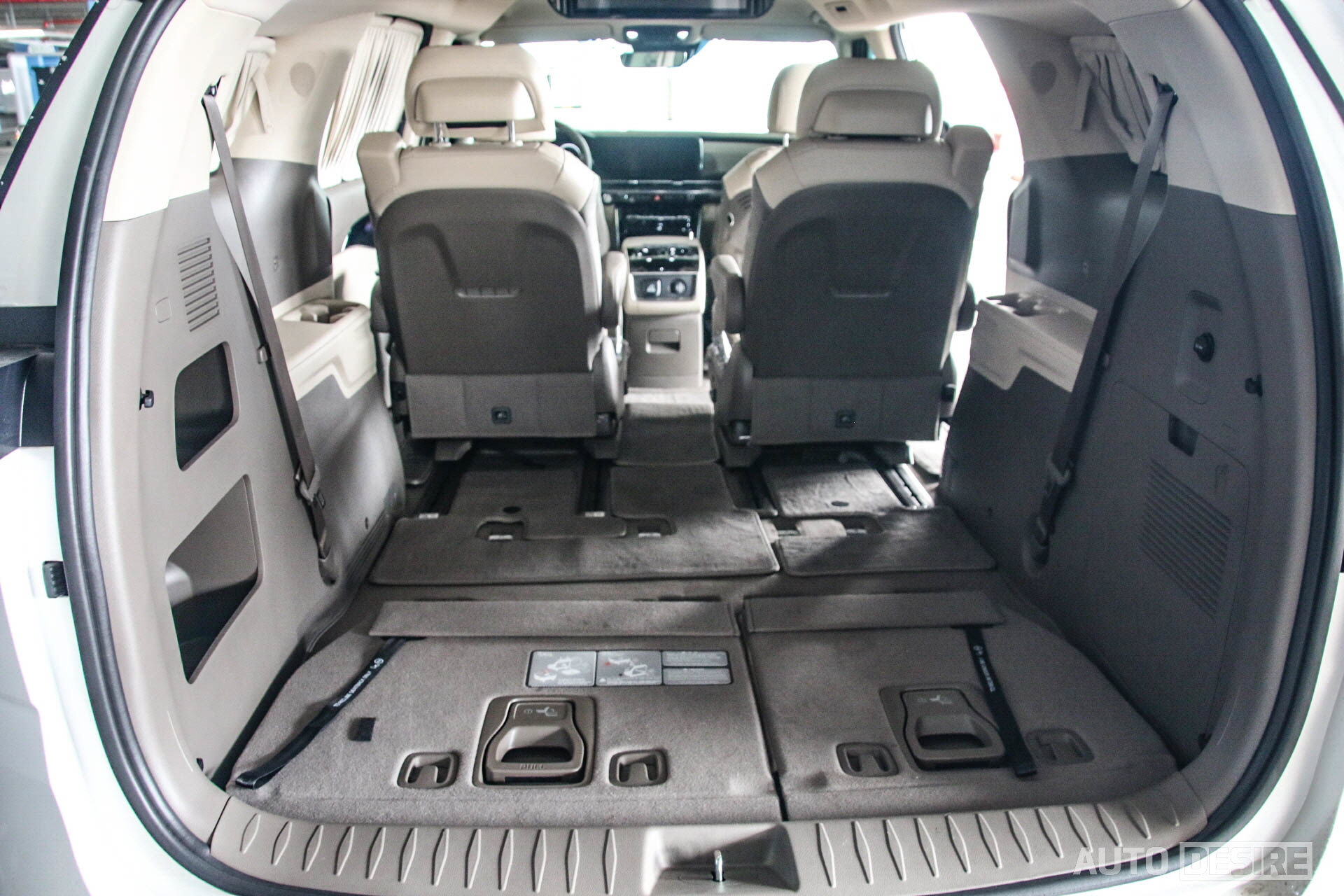 싱킹 방식으로 이렇게 차량 바닥에 쏙 접을 수 있으므로, 굳이 많은 인원이 자주 타는 것이 아니라면 시트를 접어두고 평소에는 골프 백이나 다른 부치 큰 짐을 편하게 넣을 수 있는 적재공간으로 활용하는 편이 더 좋을 것 같다. 여기에 2열 시트를 앞쪽으로 더 밀어낸다면, 차박 캠핑을 하기에도 활용성이 꽤 괜찮아 보인다.