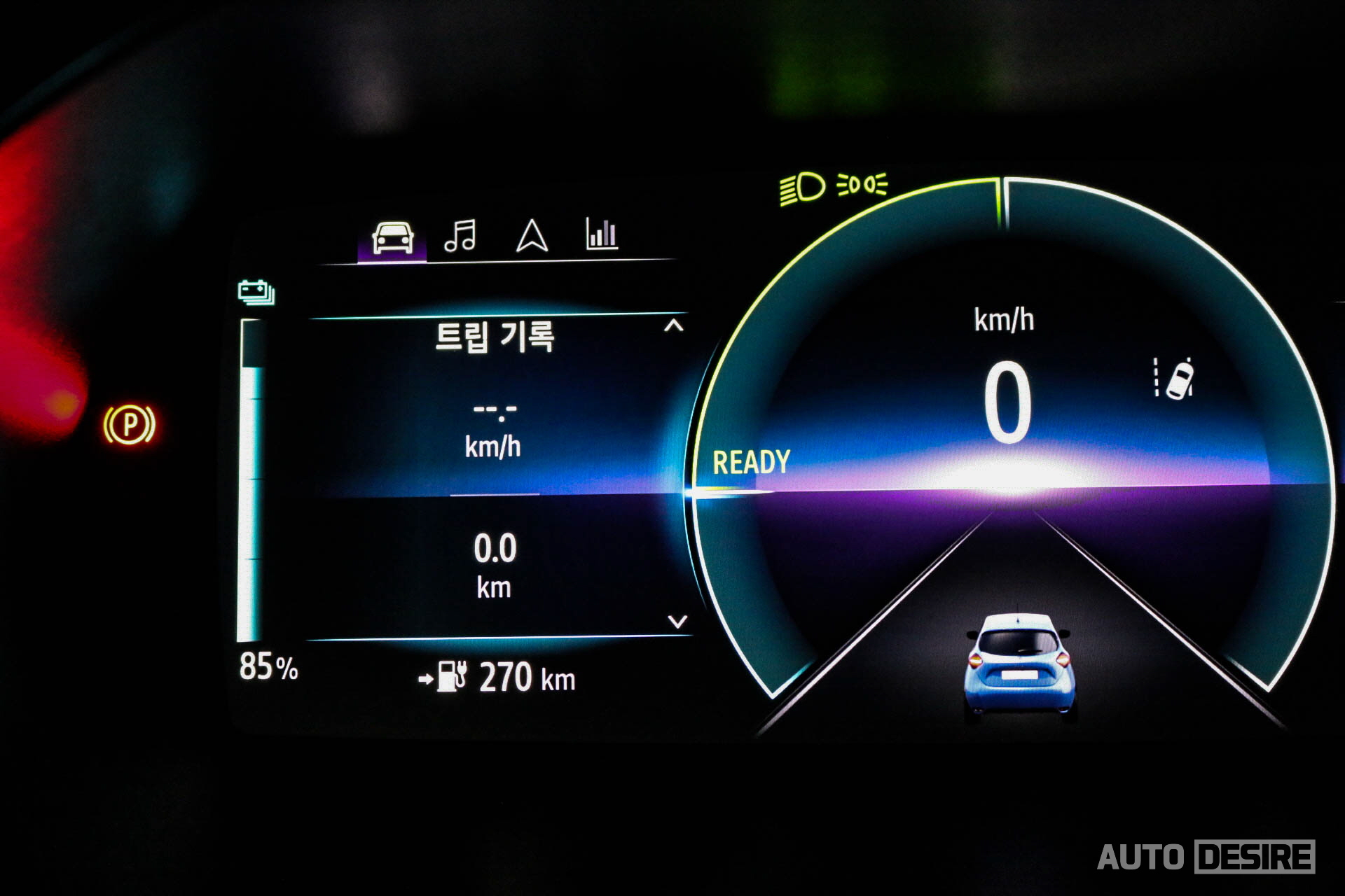 시승차를 인수받은 시점에서의 배터리 잔량은 85%, 주행 가능 거리는 270km까지로 이전 주행 환경에 따른 계산 차이가 있었겠지만, 영하의 기온에서도 생각한 것보다는 주행가능거리 손실이 그렇게 큰 편은 아닌 모습이었다. 배터리가 100% 충전된 상황이었다면 주행 가능한 거리는 310~320km 내외 정도로 표시되었을 것이고, 이 이후에 주행 환경에 따라 실제 주행 가능한 거리에 차이가 생기긴 하겠지만 일단 표시된 상태로는 조에의 인증 최대 주행 가능 거리인 309km까지는 확보를 해준 모습이었고, 지난 9월에 100% 충전했을 때 표시되던 351km와도 30~40km 정도의 차이로 10% 정도 손실에 그쳤다.