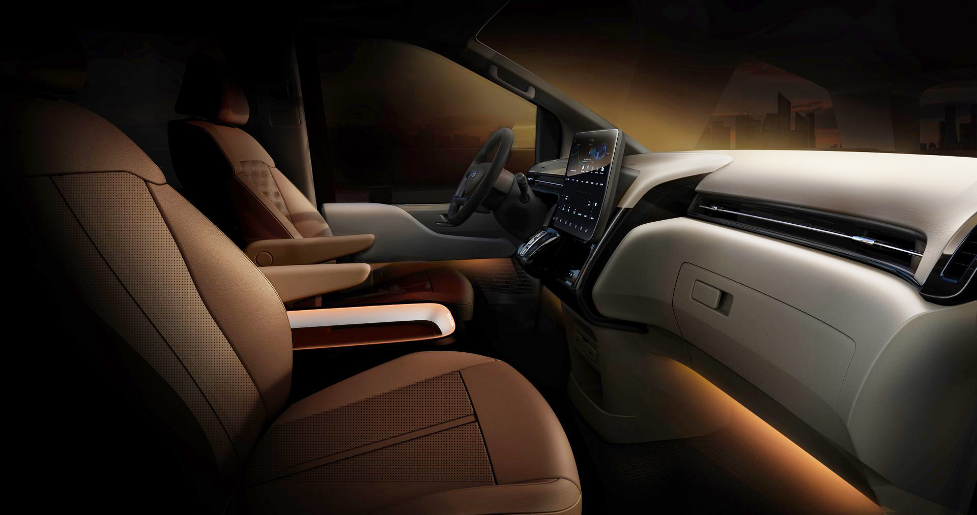 함께 공개된 실내 이미지 내 1열의 모습에서는 운전석과 조수석 모두 암레스트를 적용하고, 실내 소재를 비롯해 무드 램프까지 실내 고급감이 상당히 높아진 것으로 보인다. 센터패시아 중앙 상단에는 12.3인치(혹은 10.25인치) 사이즈로 보이는 내비게이션&인포테인먼트 시스템 디스플레이와, 하단 공조 컨트롤러까지 터치 패널로 적용한 것으로 보이며, 전자식 버튼 변속으로 깔끔하게 구성한 모습. 센터콘솔은 별도로 두지 않아 운전석-조수석 간, 1열과 2열 간의 개방감/이동 편의성도 좋아 보인다.