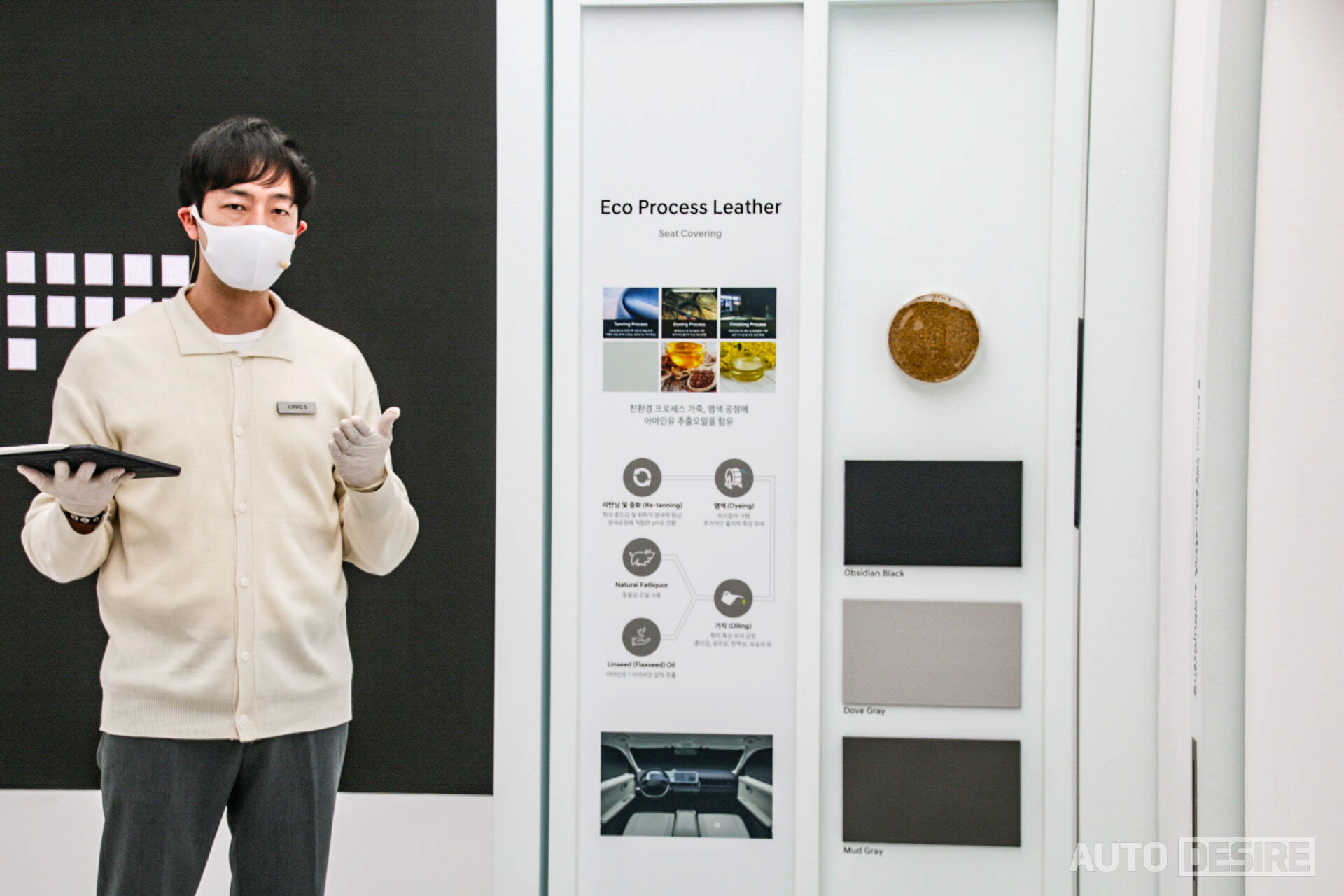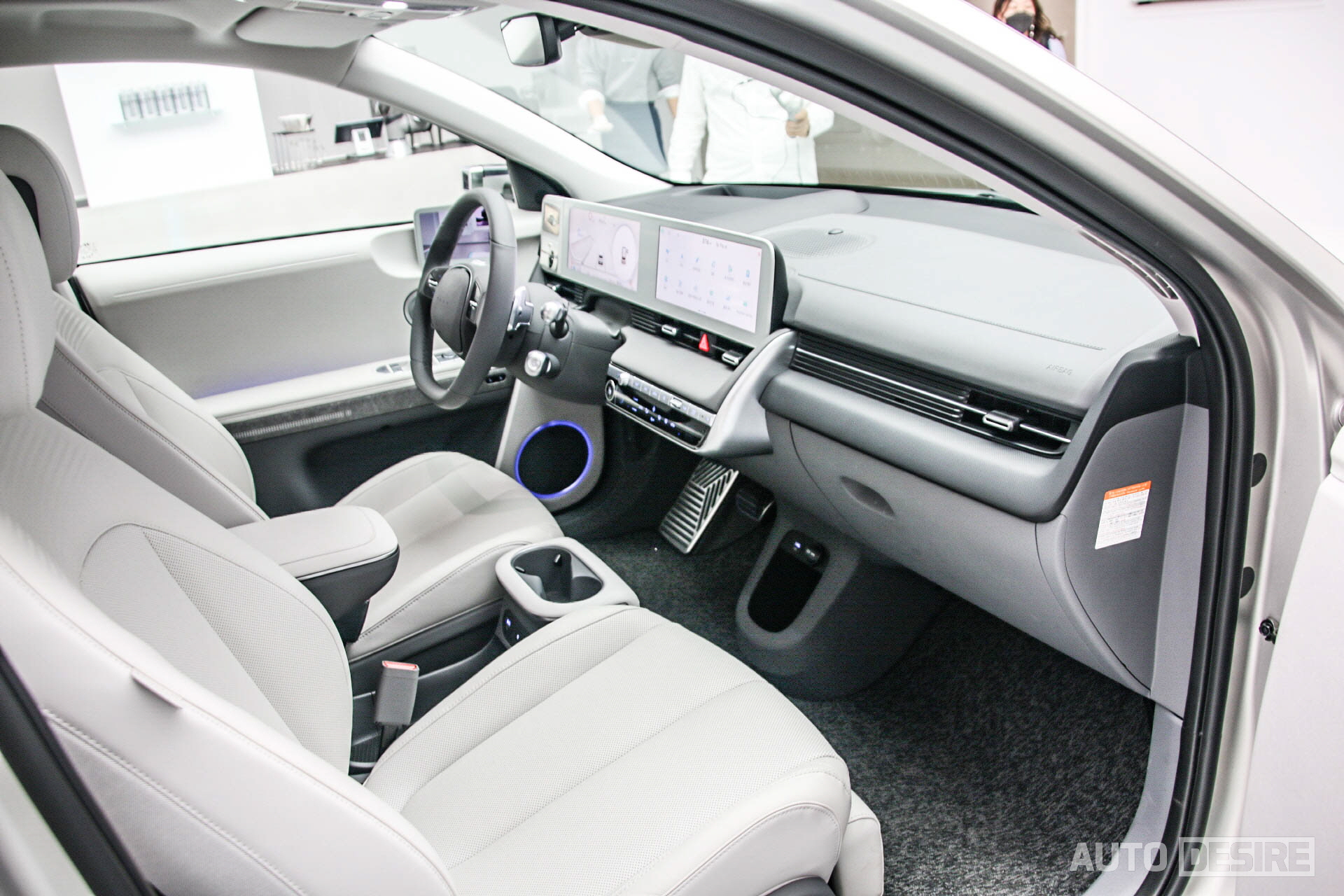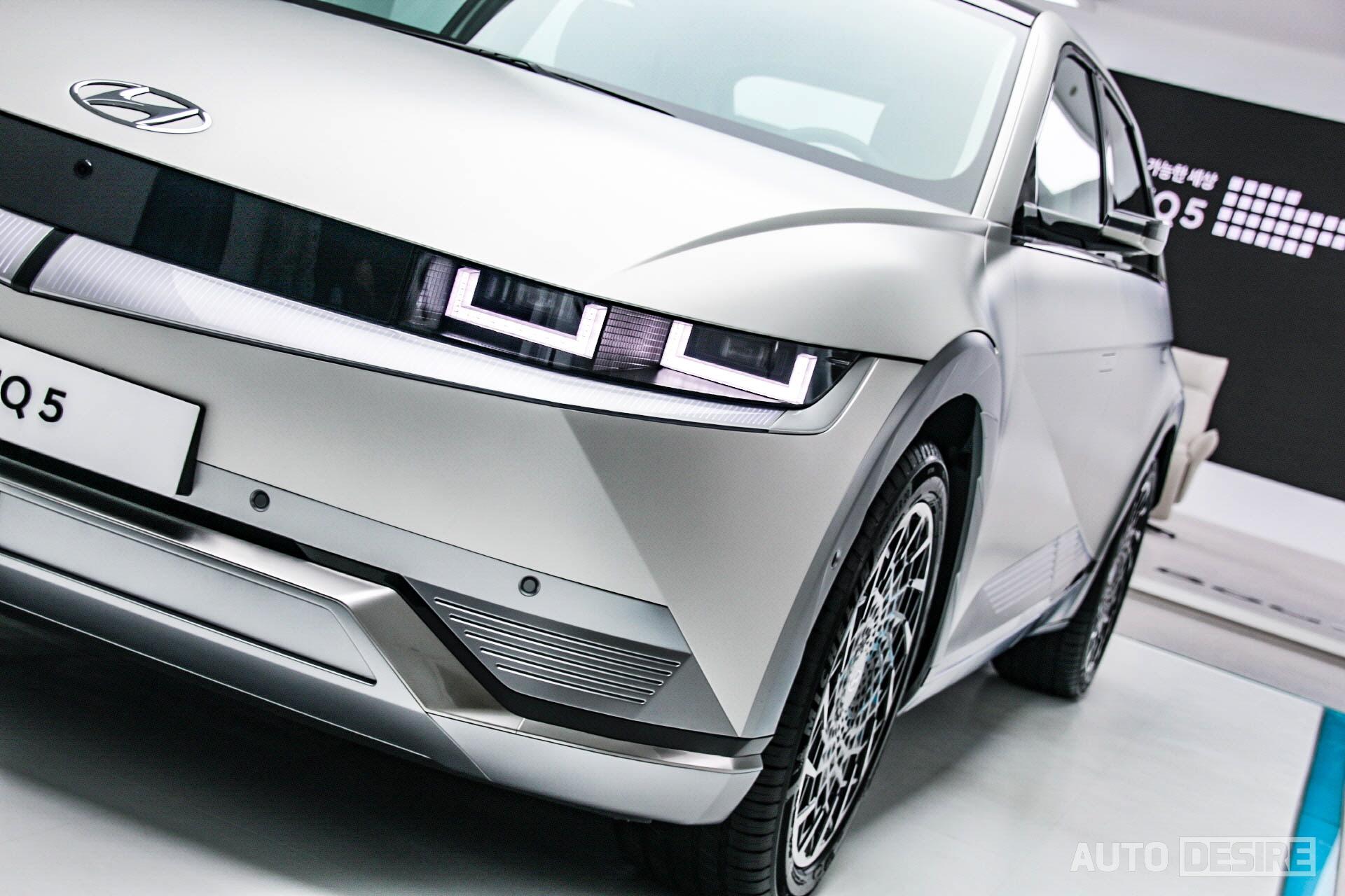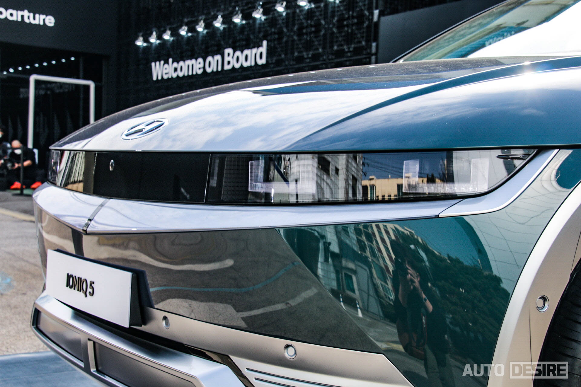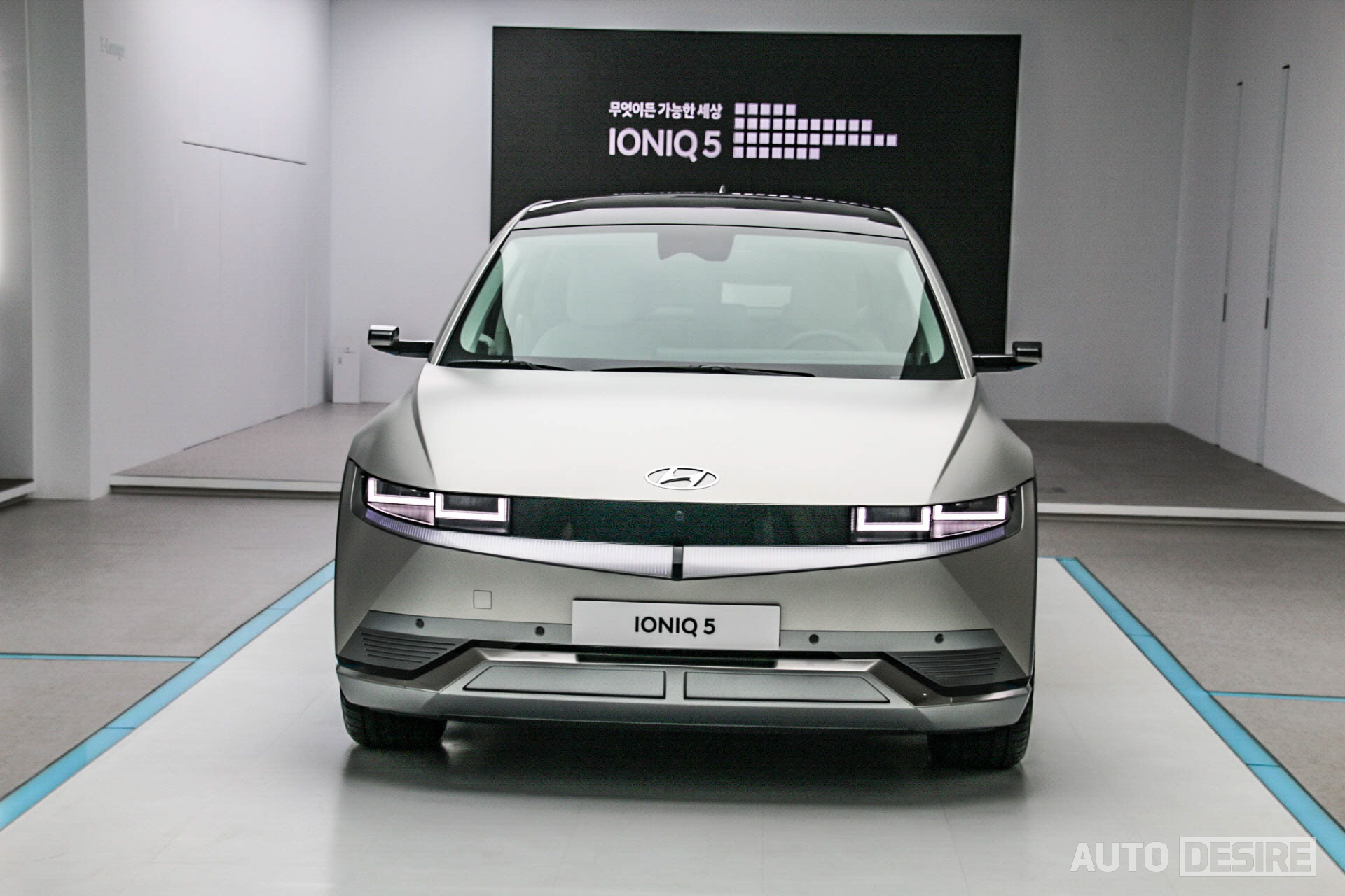 드디어 실물로 마주하게 된 아이오닉 5는 실내에 그래비티 골드 매트, 야외에는 디지털 틸 그린 펄 외장 색상으로 총 2대의 전시 차량이 준비되어 있었다. 출고 색상으로 무광 컬러를 제공하는 차량이 많아졌고, 녹색 계열 색상 역시 최근 들어 많은 차량에 적용하는 추세라 이제 크게 어색하다거나 낯설 정도는 아니지만, 기존의 현대차 스타일과는 완전히 다른, 미래적인 스타일의 아이오닉 5에 더해지니 그 독특함이 더 강하게 드러나는 느낌이다.