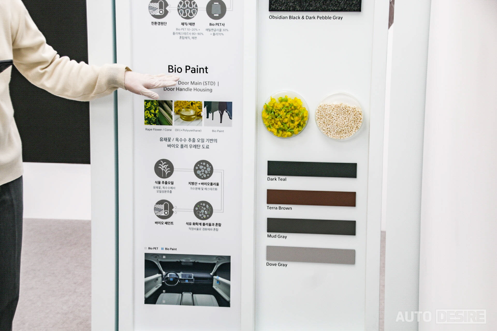 더불어 실내 소재 역시 환경 영향을 덜기 위해 시트 및 헤드라이너, 암레스트, 플로어 카펫/매트 등에 PET 병을 재사용해 만든 원사를 적용하고, 페인트도 천연 오일이 적용된 BIO 페인트를 도어 가니시, 크래시 패드, 혼 커버 등에 사용했다고 한다. 물론 현대뿐만 아니라 많은 메이커들이 친환경 차량에 시도하고 있는 부분 중 하나로 단순히 주행뿐만 아니라, 생산 과정과 차후 처리까지 생각하고 있는 부분.