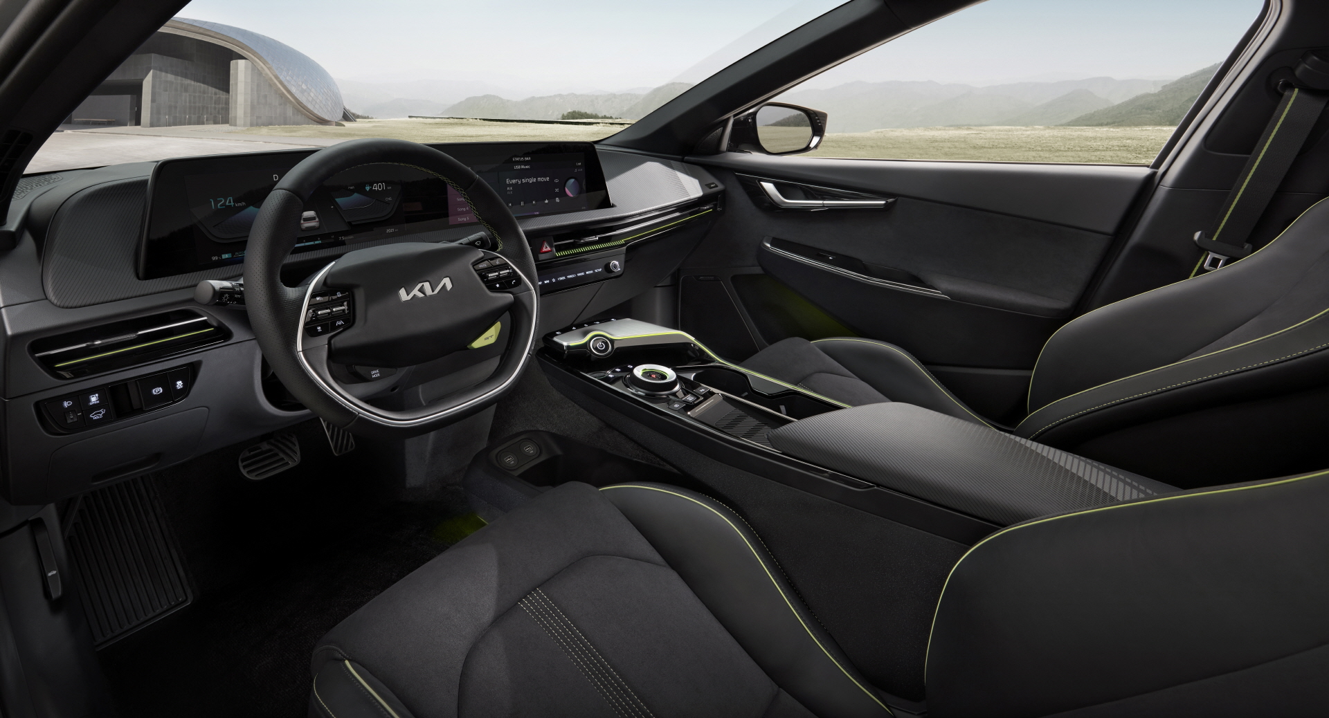 특히 고성능 GT 모델의 겨우 버킷 타입의 스웨이드 스포츠 시트를 적용해 운전자를 더 안정적으로 지지할 수 있도록 만든 모습이 돋보이며, 친환경의 이미지를 부여하는 밝은 네온 그린 색상의 스티치, 포인트 컬러가 적용되었다. 그 외 EV6의 실내 소재에서는 도어 포켓, 크래시패드 무드조명 가니시, 보조 매트, 친환경 공정 나파 가죽 시트 등 폐 플라스틱 재활용 소재와 친환경 오일, 추출물 등을 사용했다. 2,900mm의 긴 휠베이스와 함께 차체 아래에 낮고 넓게 자리한 고전압 배터리 구조를 통해 실내 공간의 거주성도 크게 높였으며, 트렁크 적재 공간은 VDA 기준 520리터에 2열 시트를 접을 경우 최대 1,300리터까지 확보가 가능하고, 프론트 후드 안쪽으로도 추가 트렁크가 마련되었다.