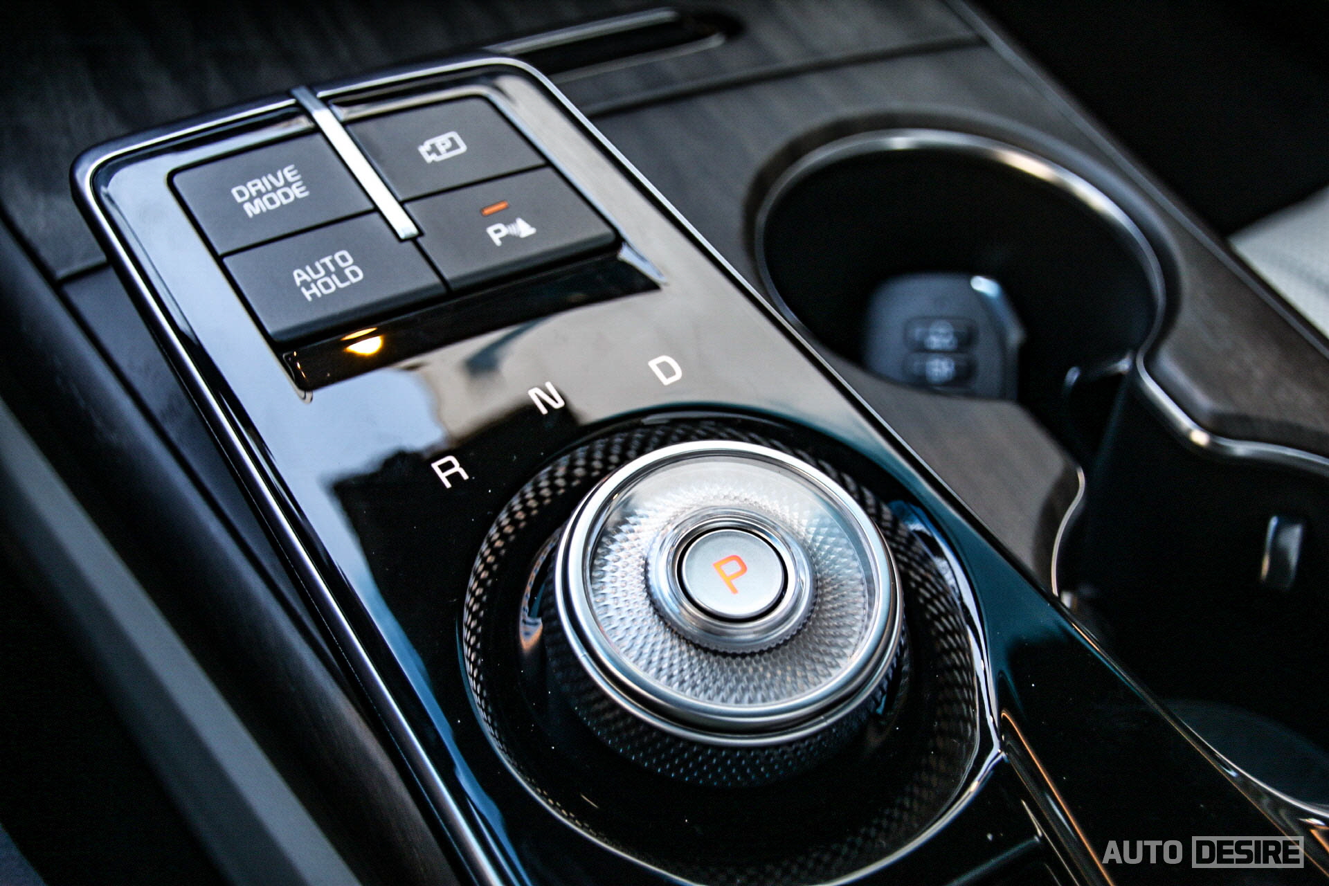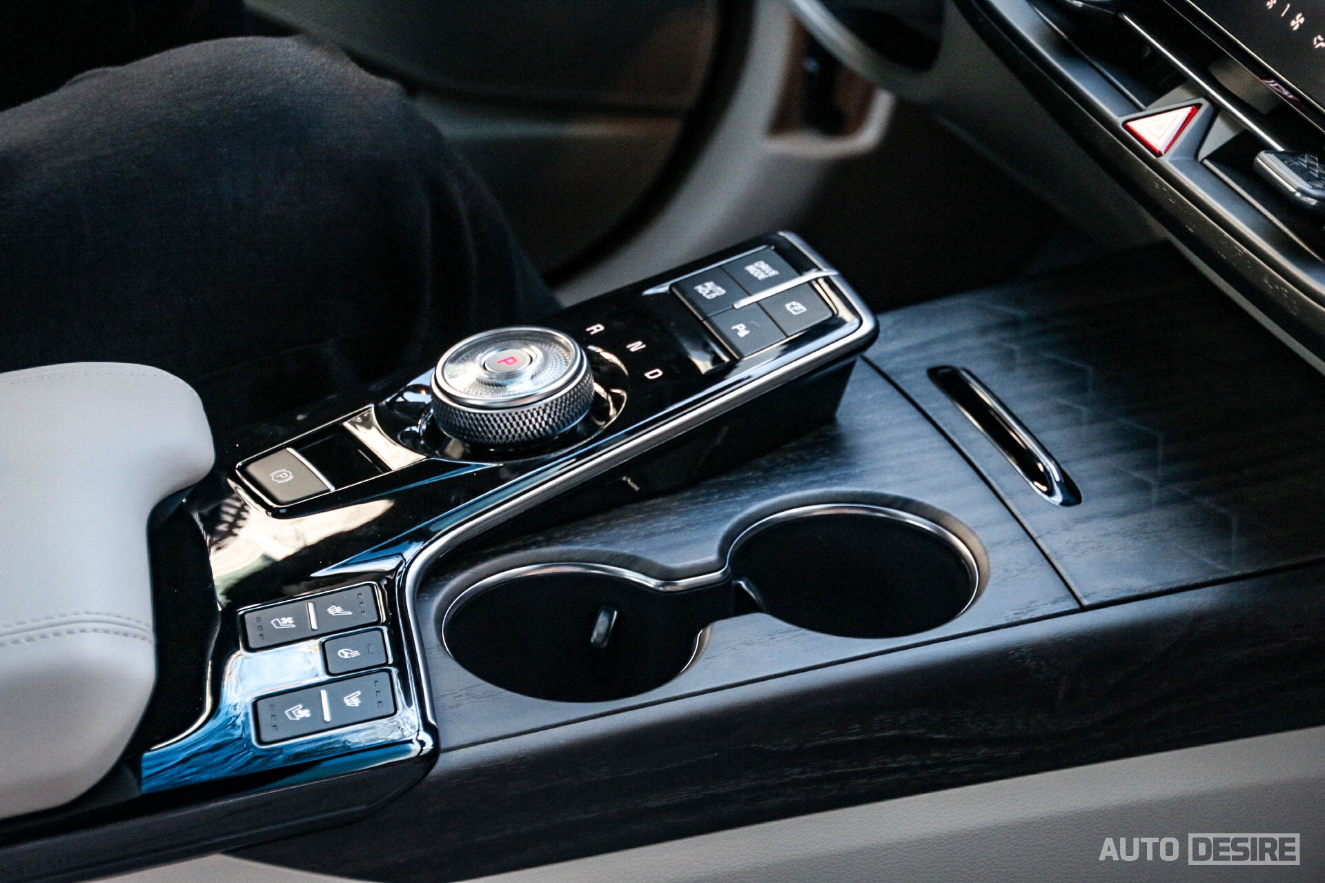 전자식 변속 다이얼은 4세대 카니발의 것을 공유하는 걸로 보이며, 센터 콘솔이 앞으로 갈수록 점점 높아지는 방식이라 운전자가 앞쪽의 버튼을 누르는데 편리하도록 설계된 모습. 역시나 드라이브 모드 변경, 오토홀드, 주차 센서와 서라운드 뷰 모니터 버튼, 컵홀더 뒤편으로 열선/통풍 버튼 정도만 남겨두어 깔끔한 구성을 보여준다. 개인적인 아쉬움으론 이곳의 버튼들을 센터 콘솔과 동일하게 블랙 하이그로시나, 아니면 반광 크롬 도금으로 마감했다면 조금 더 고급스러워 보였을 것 같다.