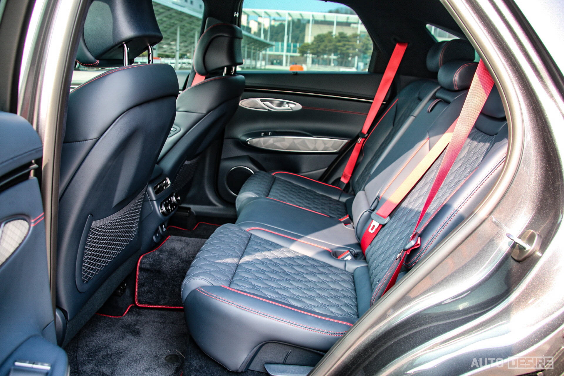 2열에도 적용된 레이어드 엣지 무드 라이팅과 안전벨트와 시트, 심지어 매트까지 적용된 레드 포인트 컬러가 강한 존재감을 보여준다. 1열과 마찬가지로 스포츠 패키지 2열에도 측면 유리 선 커튼과 2열 공조 컨트롤러, 2열 열선/통풍 시트, USB 포트와 220V 소켓까지 적용된다.
