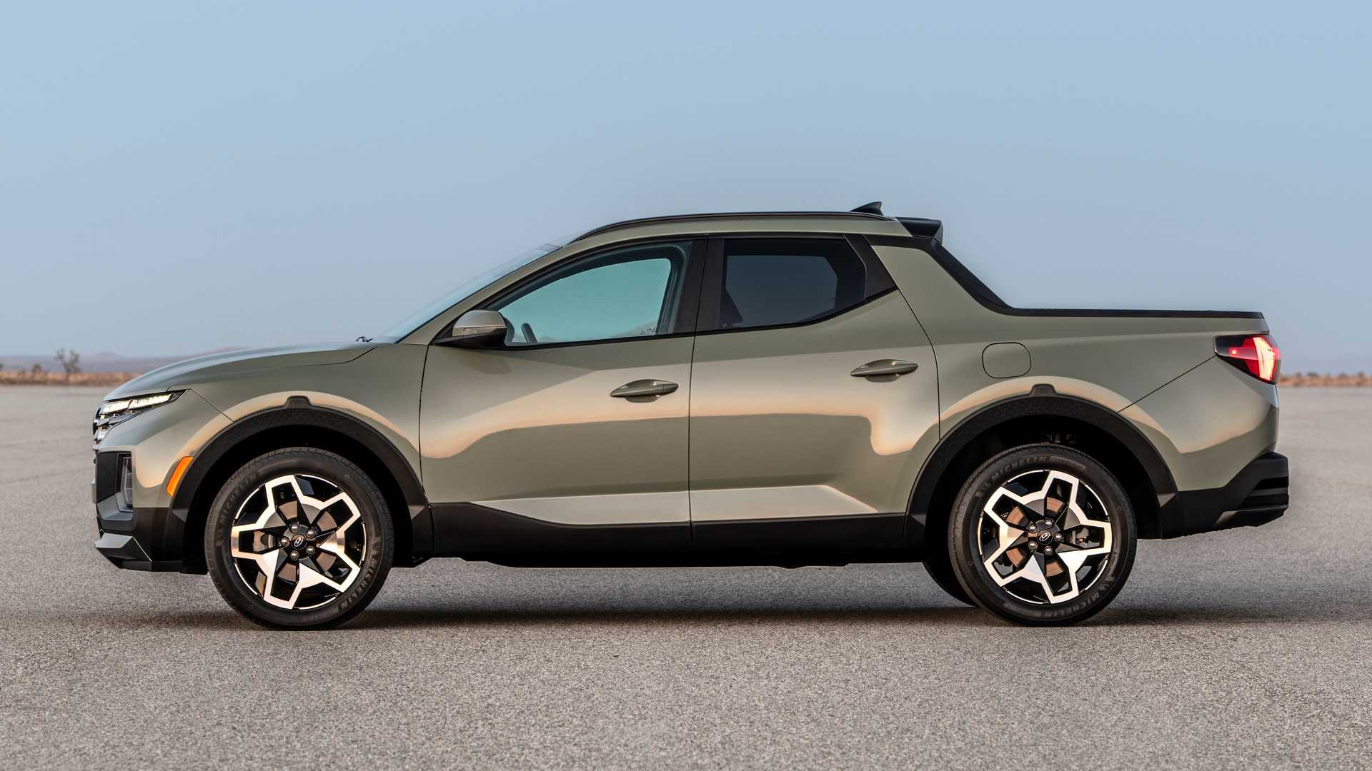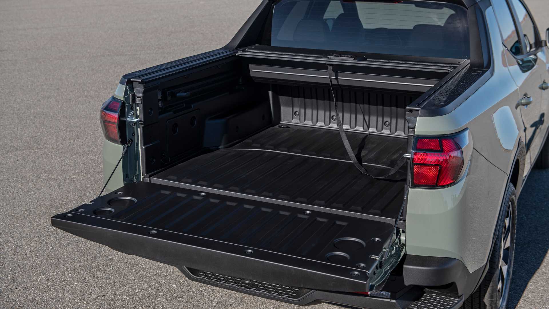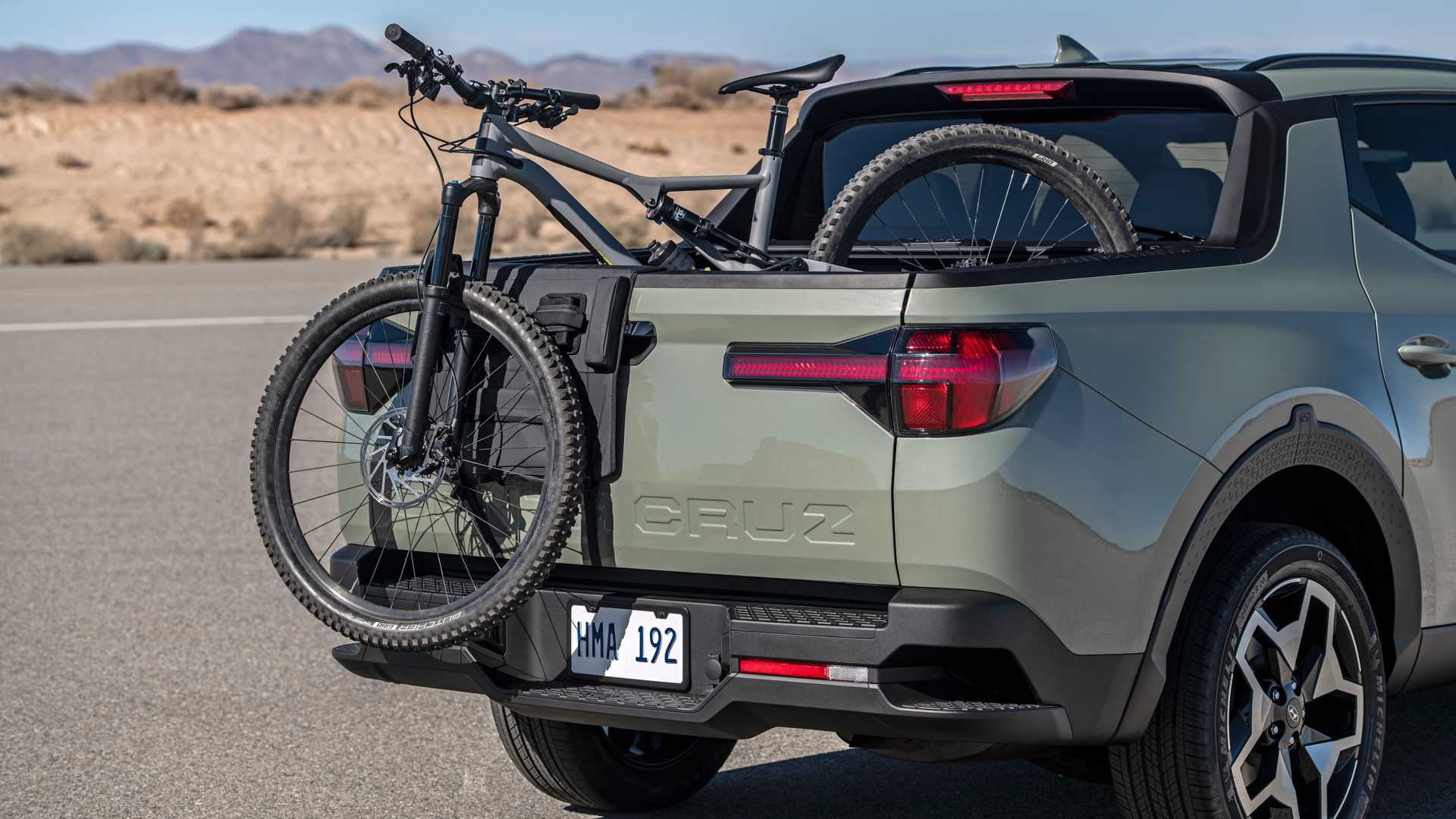 측면의 라인은 콘셉트카의 형태를 계승했고, 후면부는 완전히 이어지지는 않았지만 수평 형태의 리어램프를 적용하고, 적재함 게이트에 SANTA CRUZ 레터링을 음각으로 새겨놓아 픽업트럭 특유의 감성을 살렸다. 뒤 범퍼에는 적재함 승하차가 용이하도록 코너에도 사이드 스텝을 적용했다. 휠 사이즈는 18인치가 기본, 옵션으로 20인치 휠이 제공된다.