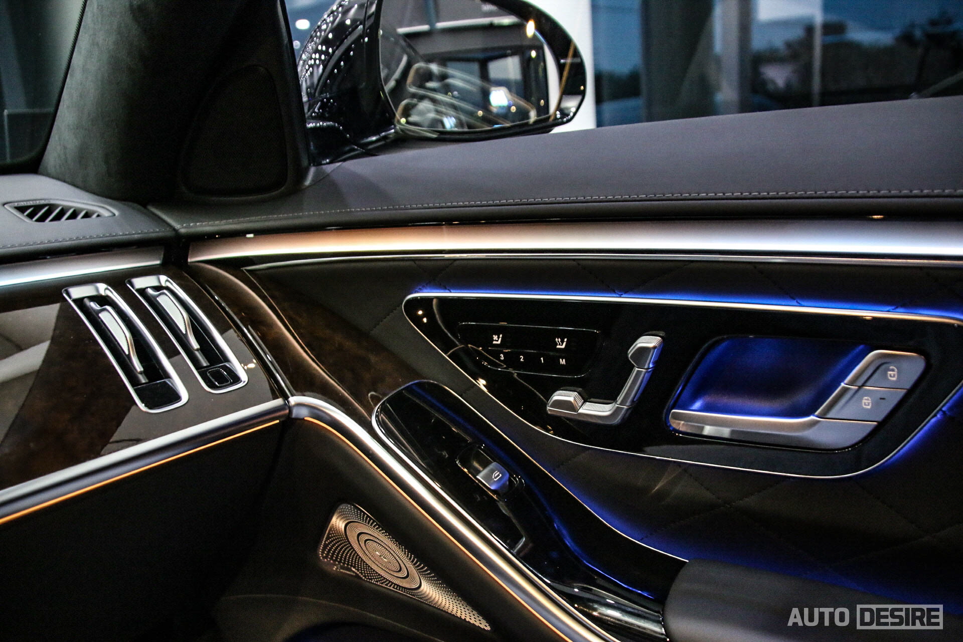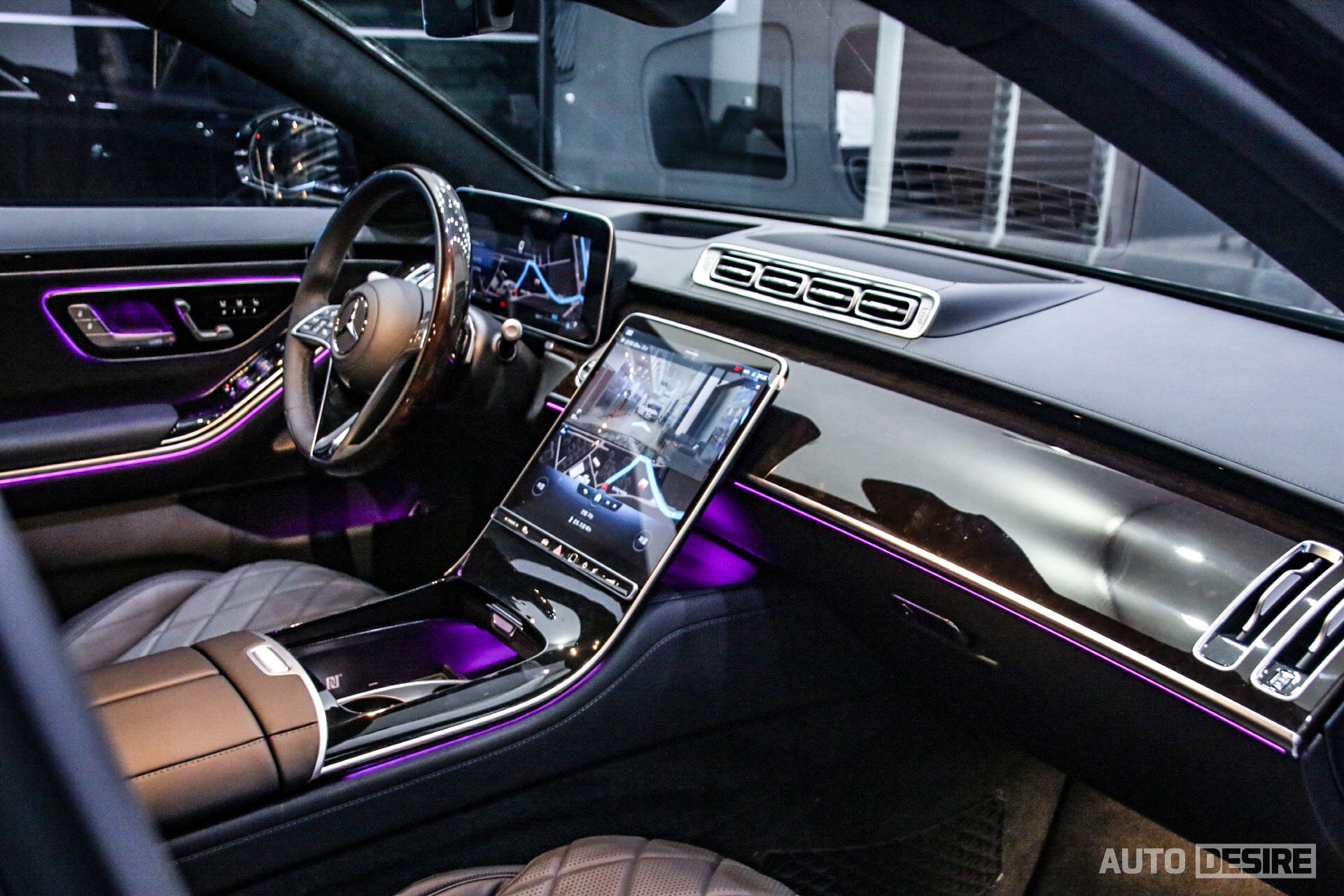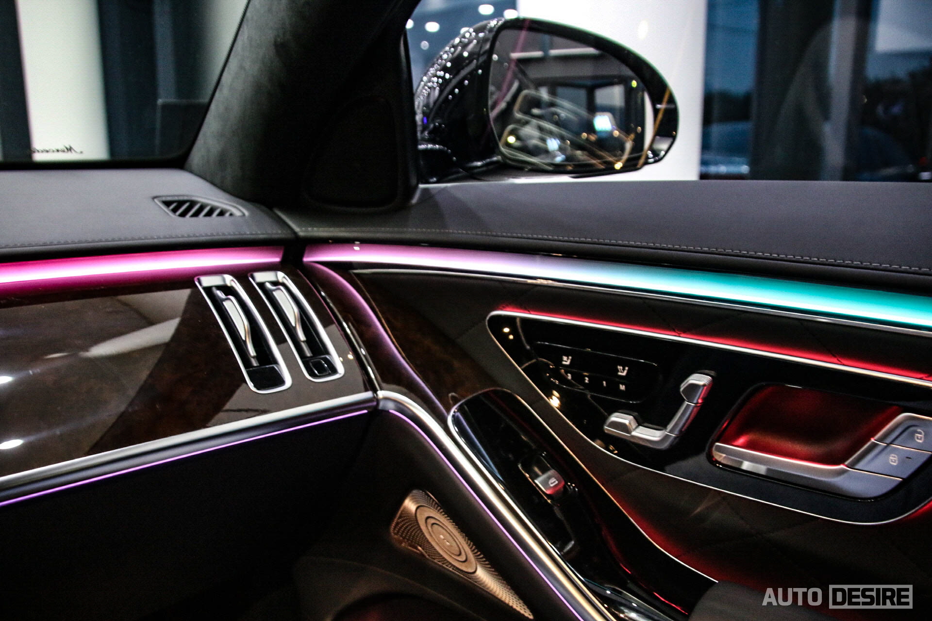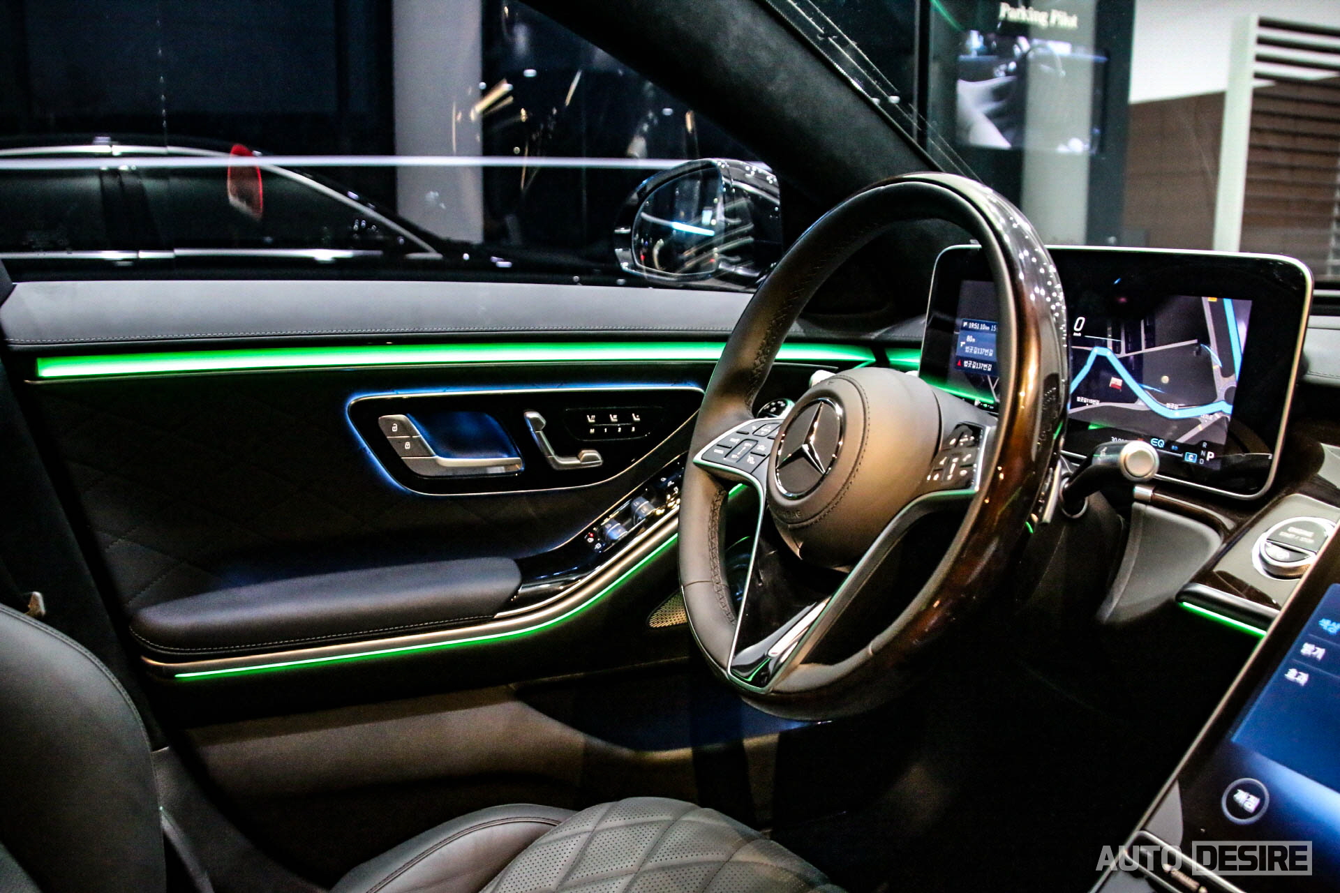 단색뿐만 아니라 멀티컬러까지 10가지 선택이 가능해 운전자, 탑승객의 취향에 맞는 정말 다양한 선택이 가능하다. 전시차의 경우 실내에 블랙 나파 가죽 시트와 함께 옵션인 브라운 유광 월넛 우드 트림이 적용되었다. S580에는 기본으로 블랙 유광 월넛 우드 트림이 적용되며, 브라운 월넛 외에도 디지뇨 플로잉 라인 피아노 라커 트림을 선택할 수도 있다.