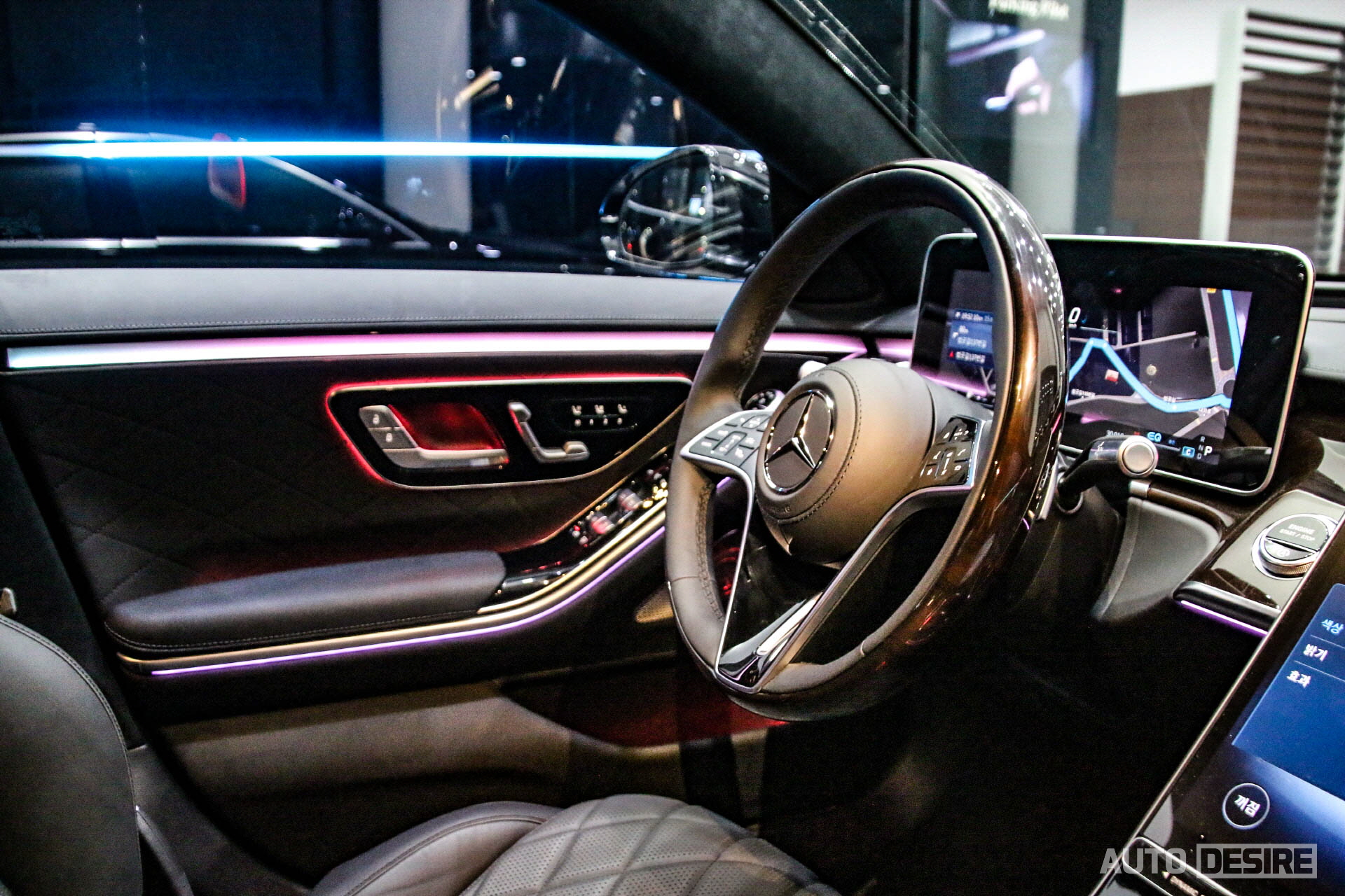 실내의 문을 열면 가장 먼저 시선을 사로잡는 건 말 그대로 휘황찬란하다는 말이 어울리는 액티브 앰비언트 라이트. 도어 트림부부터 크래시 패드 하단, 센터콘솔까지 실내를 감싸는 앰비언트 라이트가 실내를 더 화려하고 고급스럽게 만들어주는데,