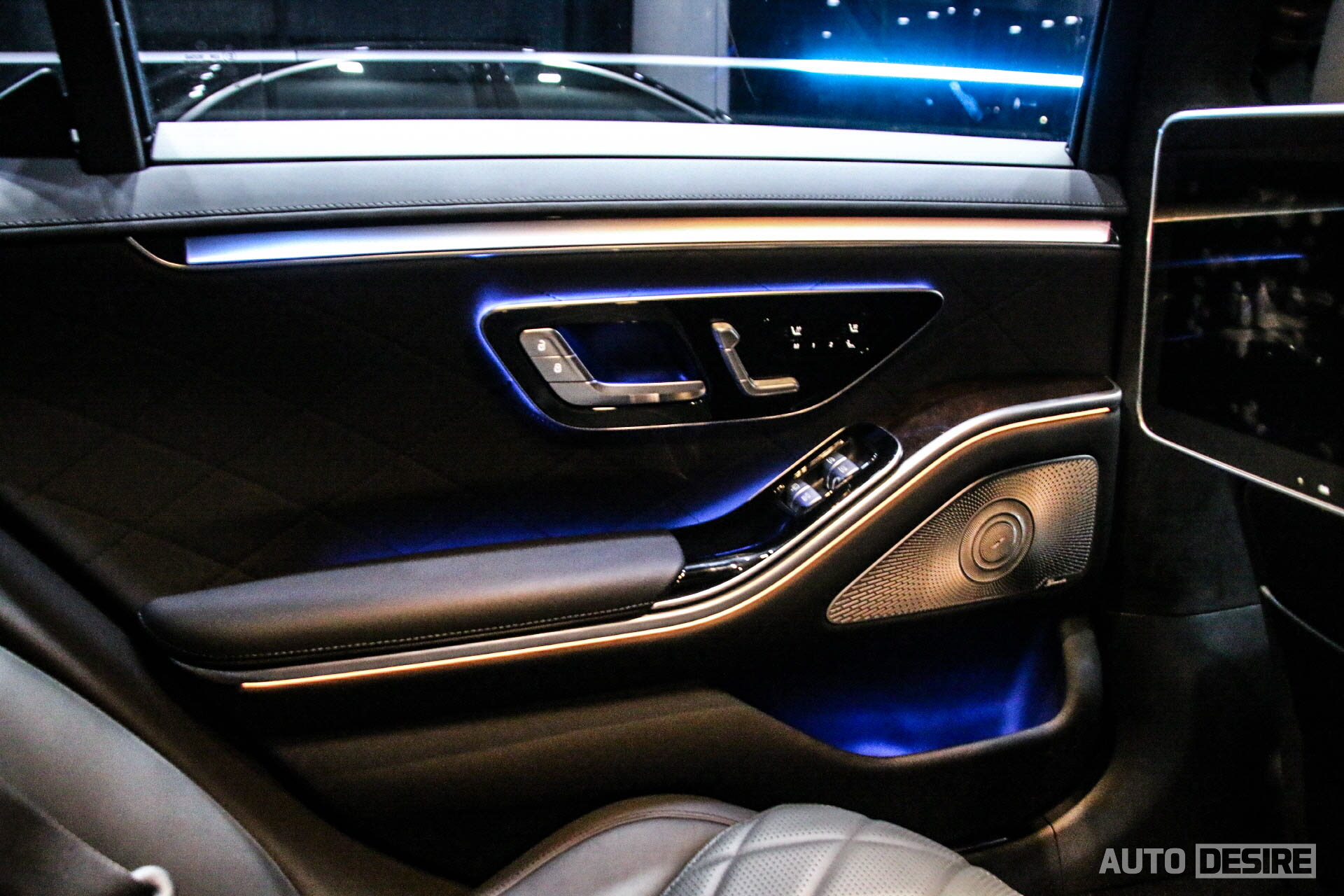 2열의 도어 트림에도 앰비언트 라이트를 적용해 화려한 분위기는 계속 이어가며, 이그제큐티브 시트(S580 기본, S500 선택사양)가 적용되어서 버튼 한 번만 누르면 기대 누울 수 있는 가장 편한 자세를 만들어주고, 등받이 각도는 최대 43.5도까지 조정이 된다고 한다. 쇼퍼 드리븐의 목적에 맞게 2열 시트에는 열선, 통풍과 함께 마사지, 메모리 기능도 제공되고, 승객 편의를 위해 11.6인치 엔터테인먼트 시스템과 센터 콘솔에 7인치 MBUX 태블릿이 제공되어 뒷좌석에서 편하게 차량 내 편의 기능들을 제어할 수 있다.