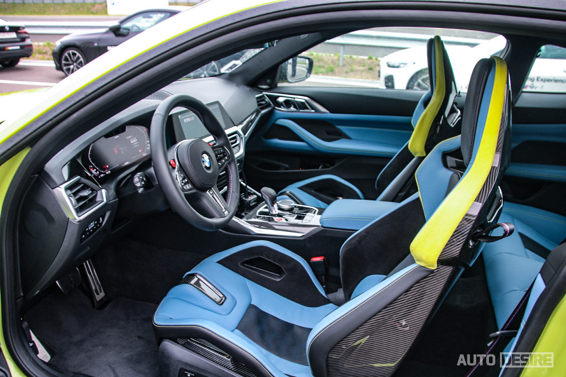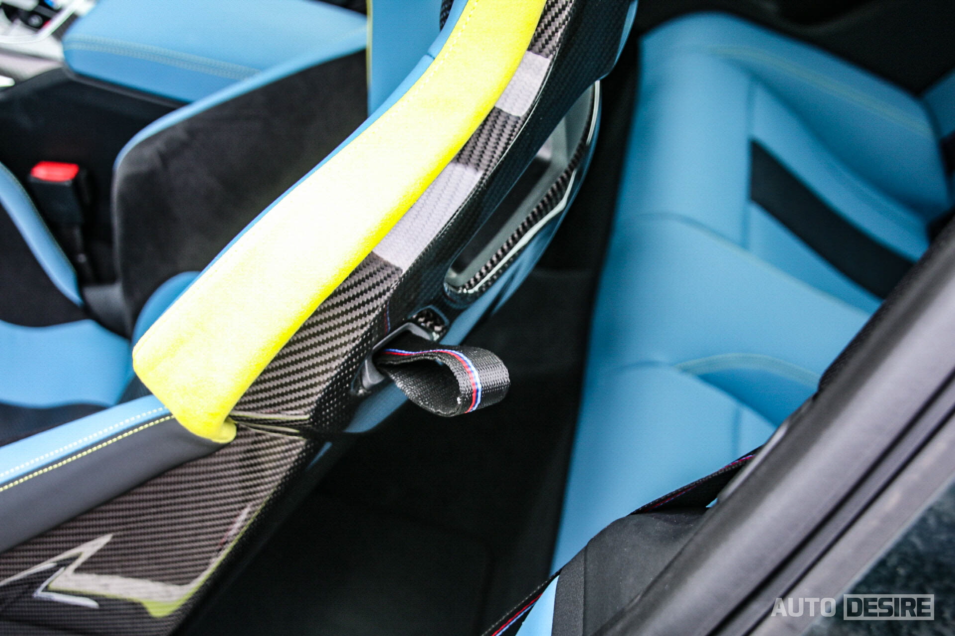 가장 인상적이었던 것은 헤드레스트 일체형의 스포츠 버킷 시트! 고급스러운 색감의 메리노 가죽으로 마감되어 있으면서도 몸을 깊숙하게 폭 감싸주어서 트랙 주행에서도 몸이 쏠리지 않도록 잘 잡아주며, 6점식 벨트도 장착해서 바로 사용이 가능하게 만들어서 별도로 버킷 시트를 장착할 필요가 없을 것 같다. 시트 백 패널은 풀 카본으로 되어 있어 경량화까지 신경 썼고, M4의 시트 폴딩 손잡이 부분도 3색 스티치가 적용된 모습!