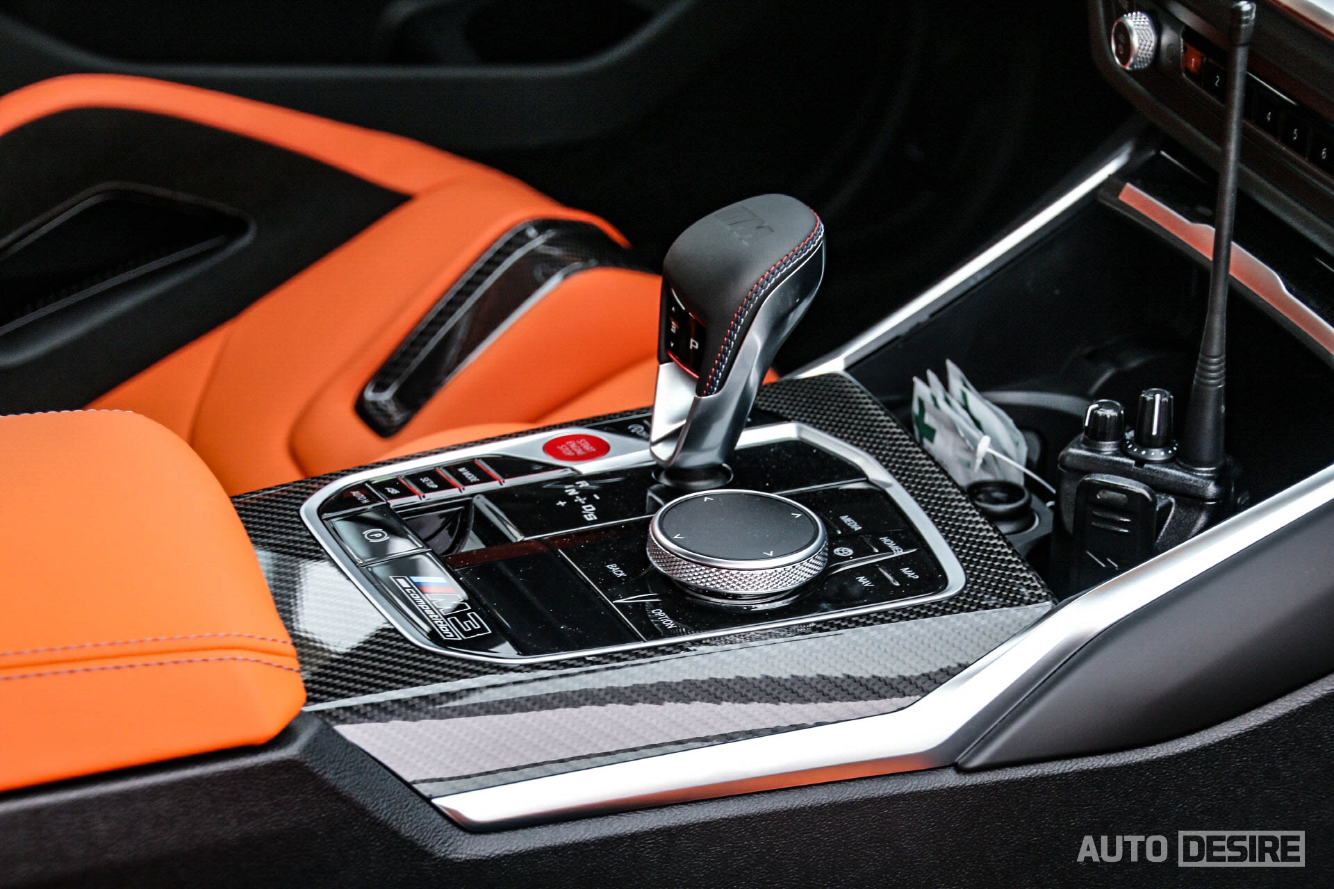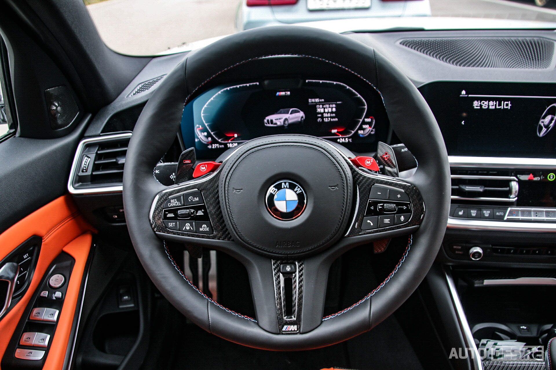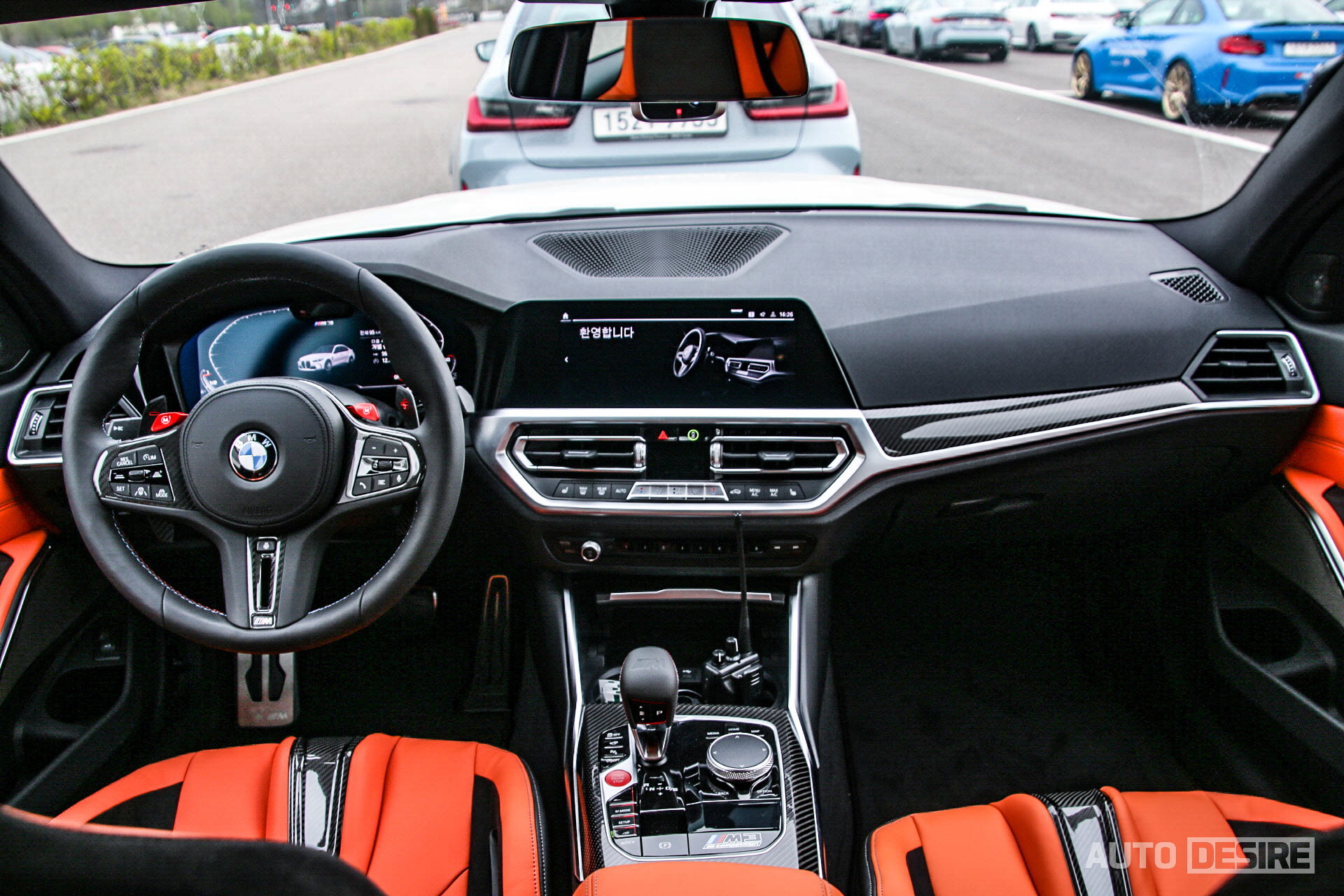 실내에서도 빨간색 M 버튼이 박힌 M 스포츠 스티어링 휠에 카본 가니시와 카본 패들 시프트가 적용되고, M 3색 스티치가 박힌 전자식 기어 노브에는 변속 감도 조정도 가능하며, 시동 버튼 역시 빨간색! 센터 콘솔을 비롯해 크래시 패드, 실내 곳곳의 마감재 역시 카본으로 되어있다.