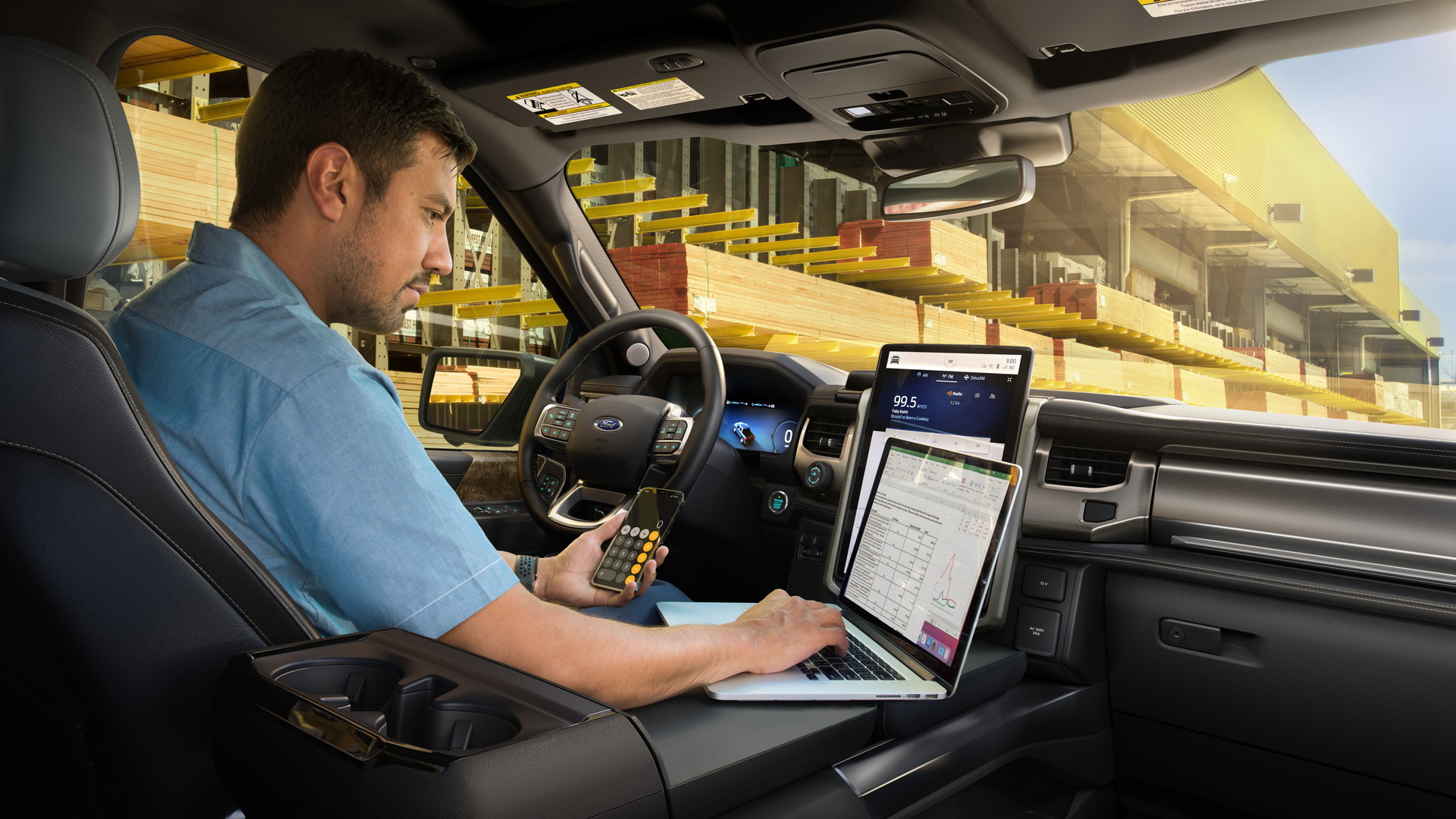 실내에서는 12인치 디지털 계기판과 머스탱 마하 E와 동일하게 거대한 15.5인치 센터 터치스크린에 싱크 4A 인포테인먼트 시스템이 적용되며, 포드 패스 앱과 연동해 차량 실내 공조장치 컨트롤과 프렁크를 열고 닫기, 또 충전 및 주행 경로 설정도 할 수 있다.