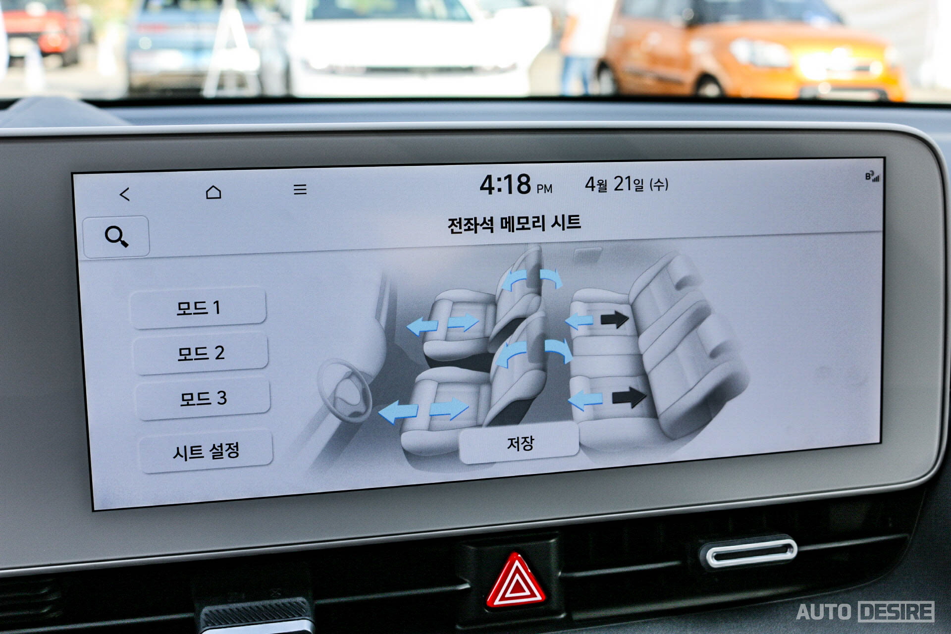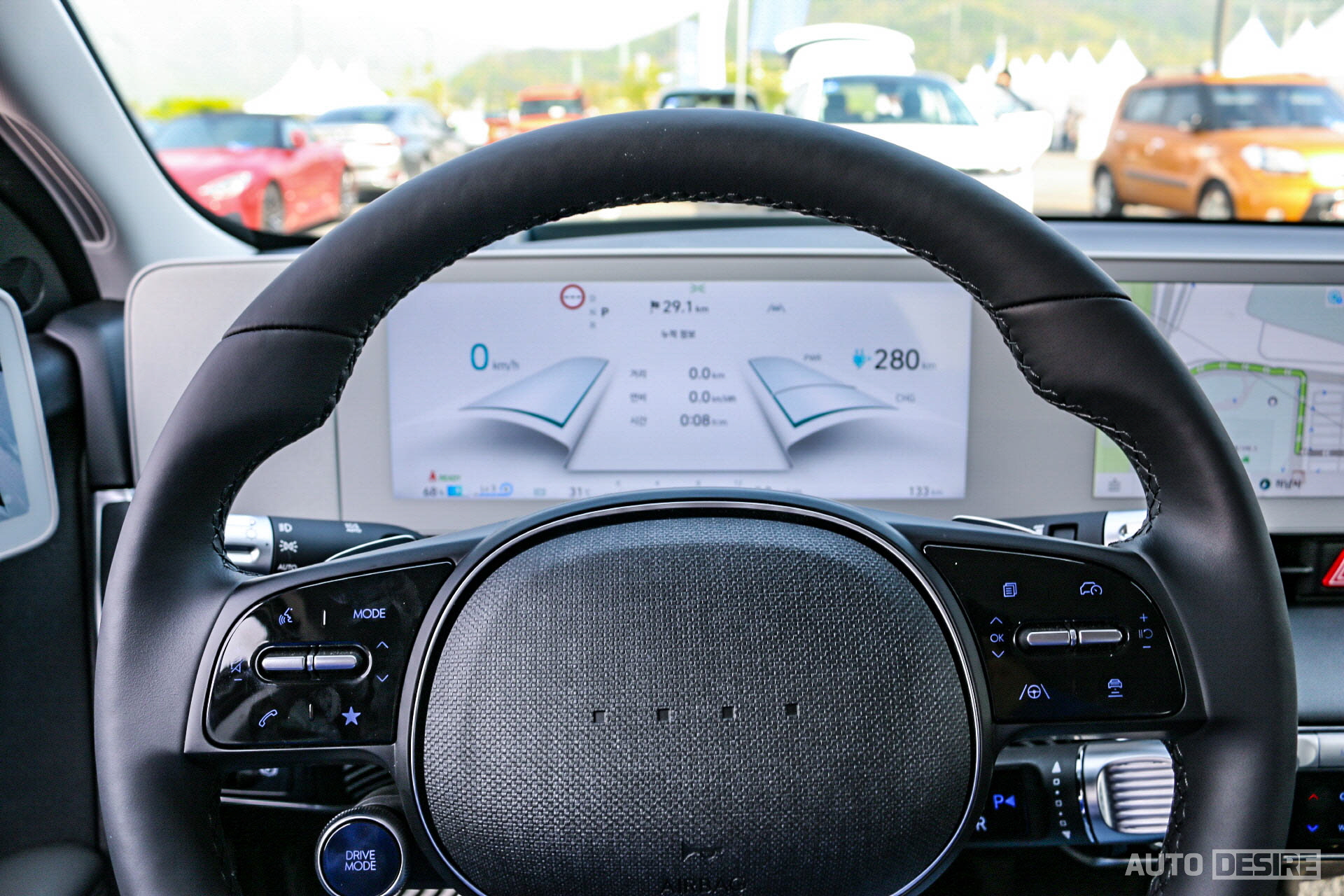 스티어링 휠 왼쪽 하단에 위치한 드라이브 모드 변경 버튼은 다이얼 타입으로 생겼지만 버튼 방식이라 처음 사용할 때는 헷갈릴 수도...? 또 버튼을 최소화하고 간결하게 정리된 센터패시아 조작부는 보기에도 깔끔하고 꼭 필요한 기능들을 사용하는 데는 큰 지장이 없지만, 시트 열선/통풍 기능을 사용하려면 클라이밋 버튼을 누르고 인포 시스템 내에서 추가 조작을 해야 하고, 내비/미디어를 제외한 기타 차량 설정을 위한 셋업 메뉴 버튼도 삭제되어서 다른 현대차들과 비교 시 직관성이 조금 떨어지는 부분을 감안해야 한다. 크게 불편을 초래할 정도는 아니더라도 아쉬움이 남는 부분들이다.