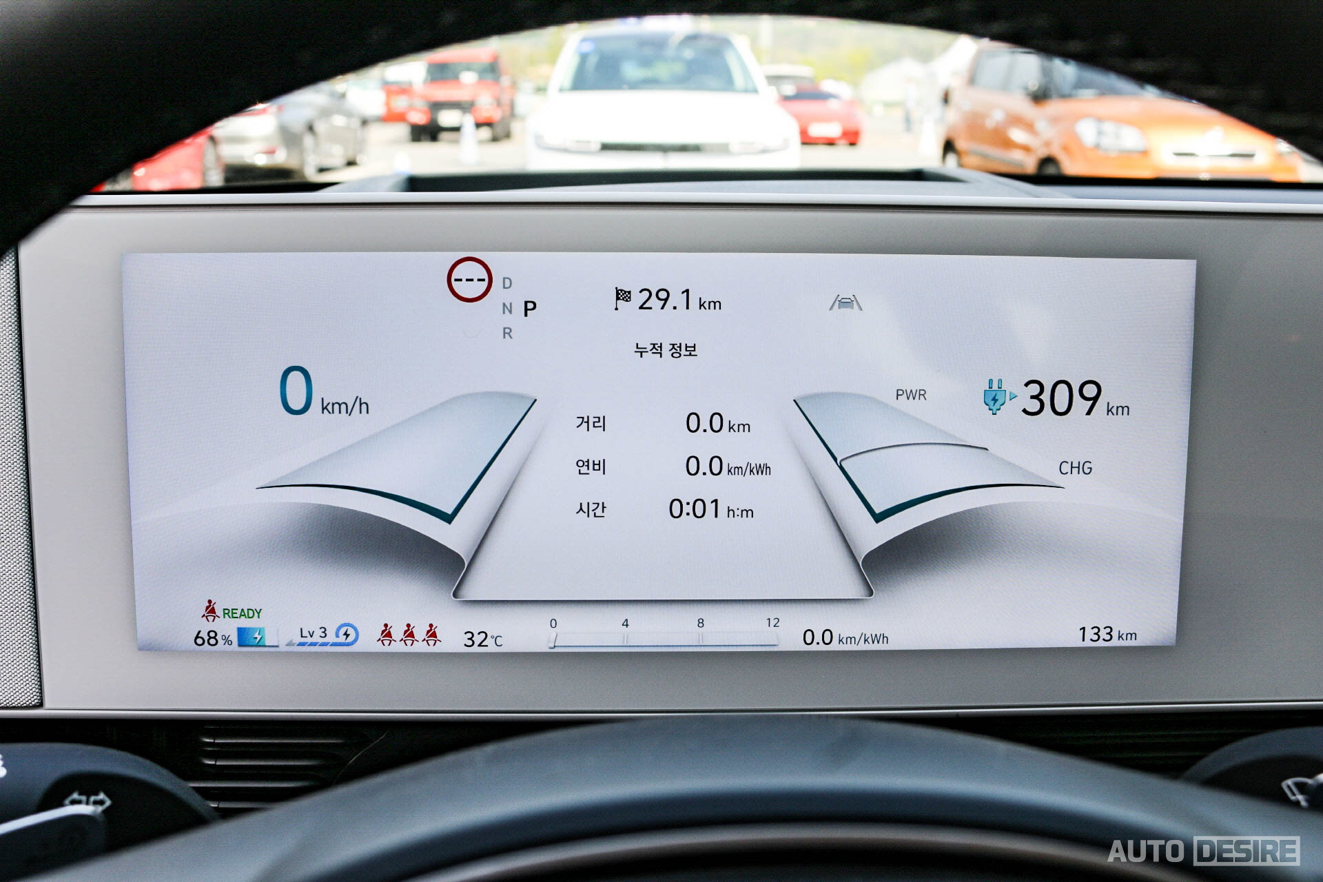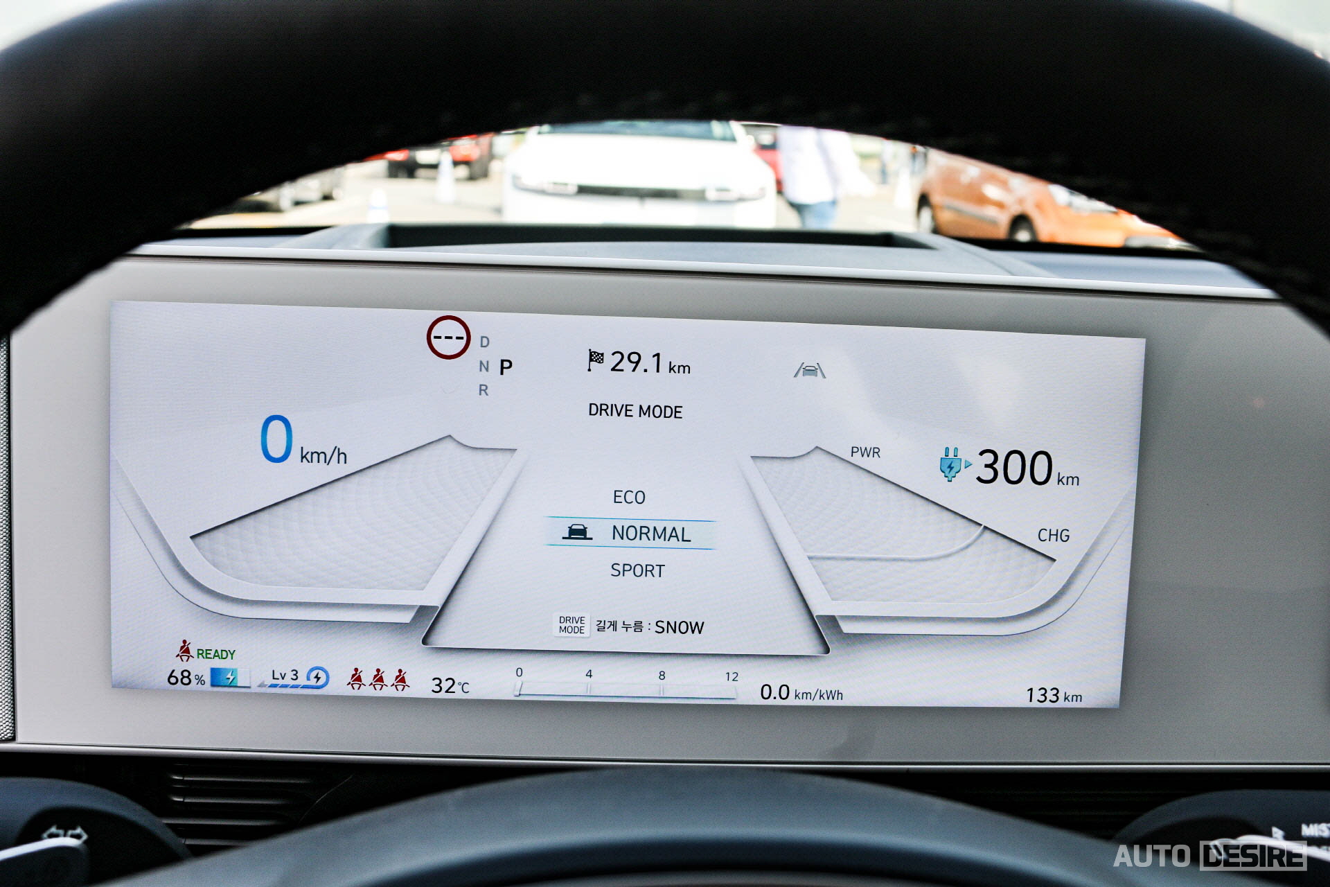 싱글모터 롱레인지 모델 시승차의 출발 할 당시 충전 상태는 68%, 에어컨을 켠 상태에서 주행 가능 거리는 에코 모드에서 309km, 노멀 모드에서 300km, 스포츠 모드에서 291km였고,