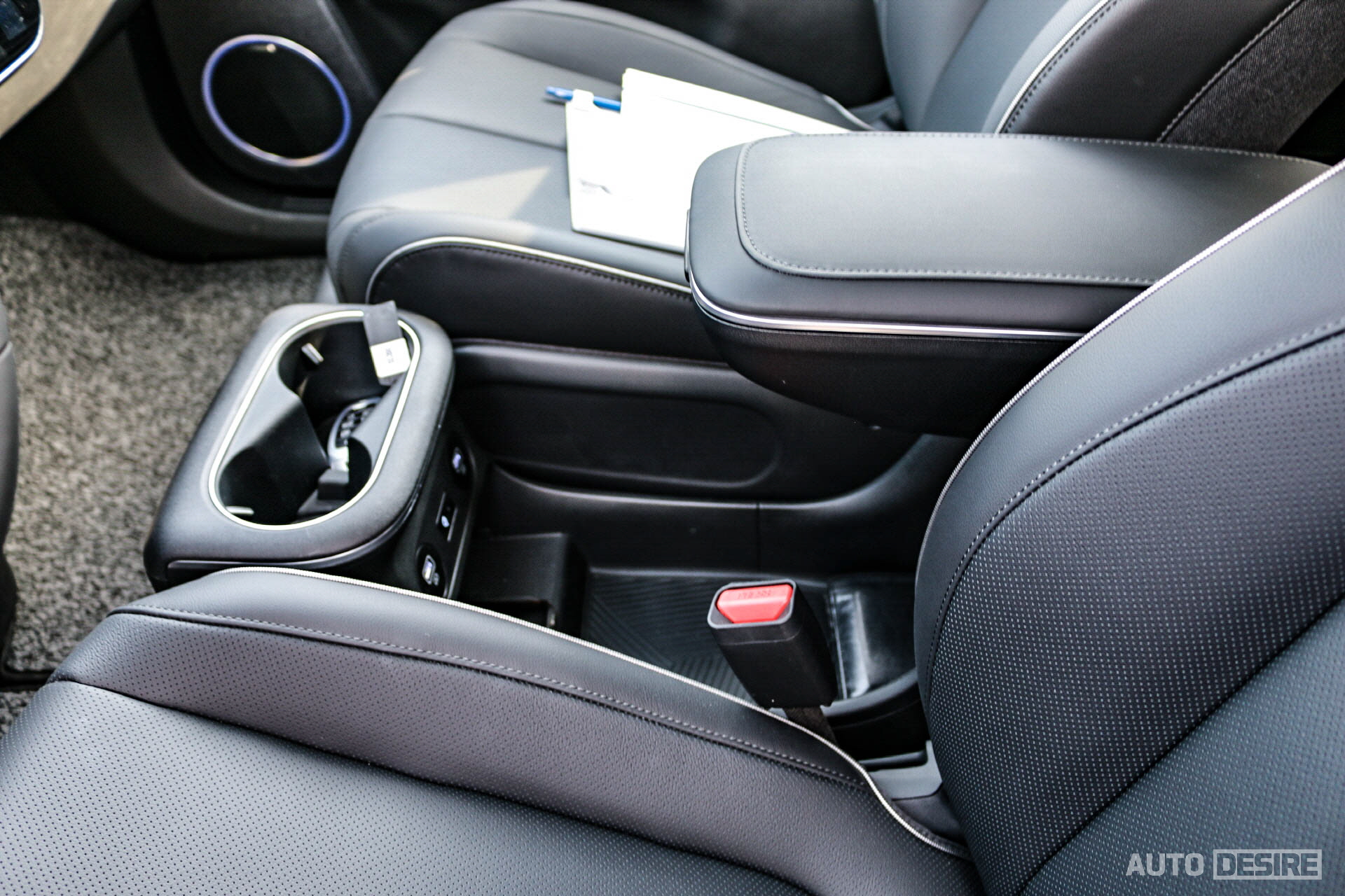 센터콘솔로 막혀있지 않고 조수석과 운전석이 뻥 뚫려있는 덕에 개방감도 좋지만, 좌석 간 이동하기에도 굉장히 편리하고, 넓은 수납공간을 제공하는 유니버셜 아일랜드도 제법 사이즈가 있는 가방이나, 다른 물건들을 놓기에도 불편하지 않다. 승객 편의를 위해서 앞뒤로 위치 조정이 가능한 부분도 현대 브랜드 내 차량 중에서는 최초인데, 실 사용 시에는 크게 이동하면서 사용할 일이 많지는 않을 것 같다. 내부에는 무선 충전 시스템과 USB 충전 포트, 제일 앞 상단에 컵홀더가 마련되어 있다.