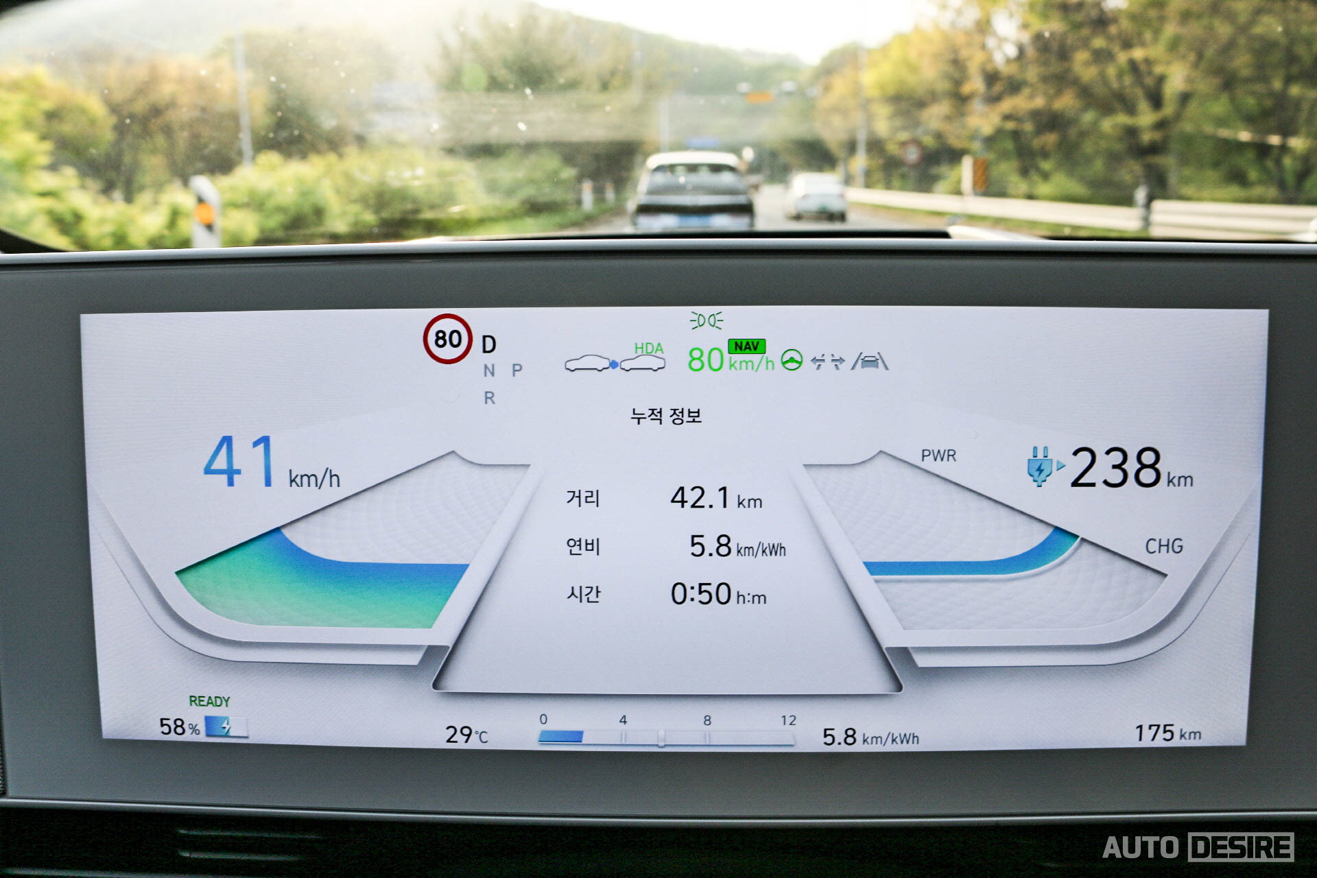 하남 스타필드에서 고속도로를 타고 남양주 조안면을 들러 다시 국도를 이용해 41.1km를 주행한 시점에서 배터리 잔량은 58%, 주행 가능 거리는 238km가 남아 출발할 때 표기된 주행 가능 거리에 비해 조금 더 많이 소진된 모습. 평균 연비는 고속도로와 도심을 복합적으로 다닐 때 5kWh 대, 도심 주행에서는 6~7kWh 사이.