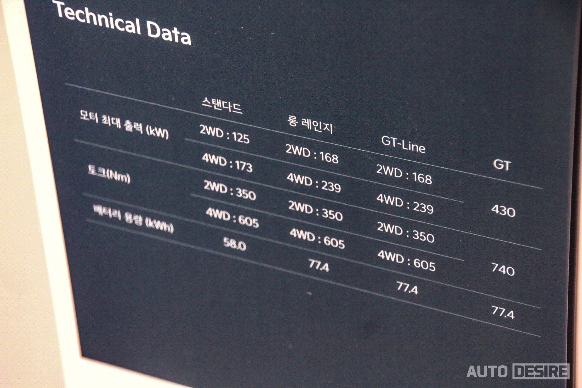 일반 모델은 배터리 용량에 따라 58kWh의 스탠다드 모델, 77.4kWh의 롱레인지 모델로 구분되며 모터 출력은 스탠다드 2WD 125kW, 토크 350Nm, 4WD 모델이 173kW, 토크 605Nm, 롱레인지 2WD이 168kW, 토크 350Nm, 4WD 모델이 239kW, 토크 605Nm을 발휘하며 GT line 모델은 롱레인지 4WD 모델과 동일하다. 최대 주행 가능 거리는 롱레인지 기준 450km 이상으로 국내에서는 장거리 주행을 하기에도 큰 무리가 없는 수준.