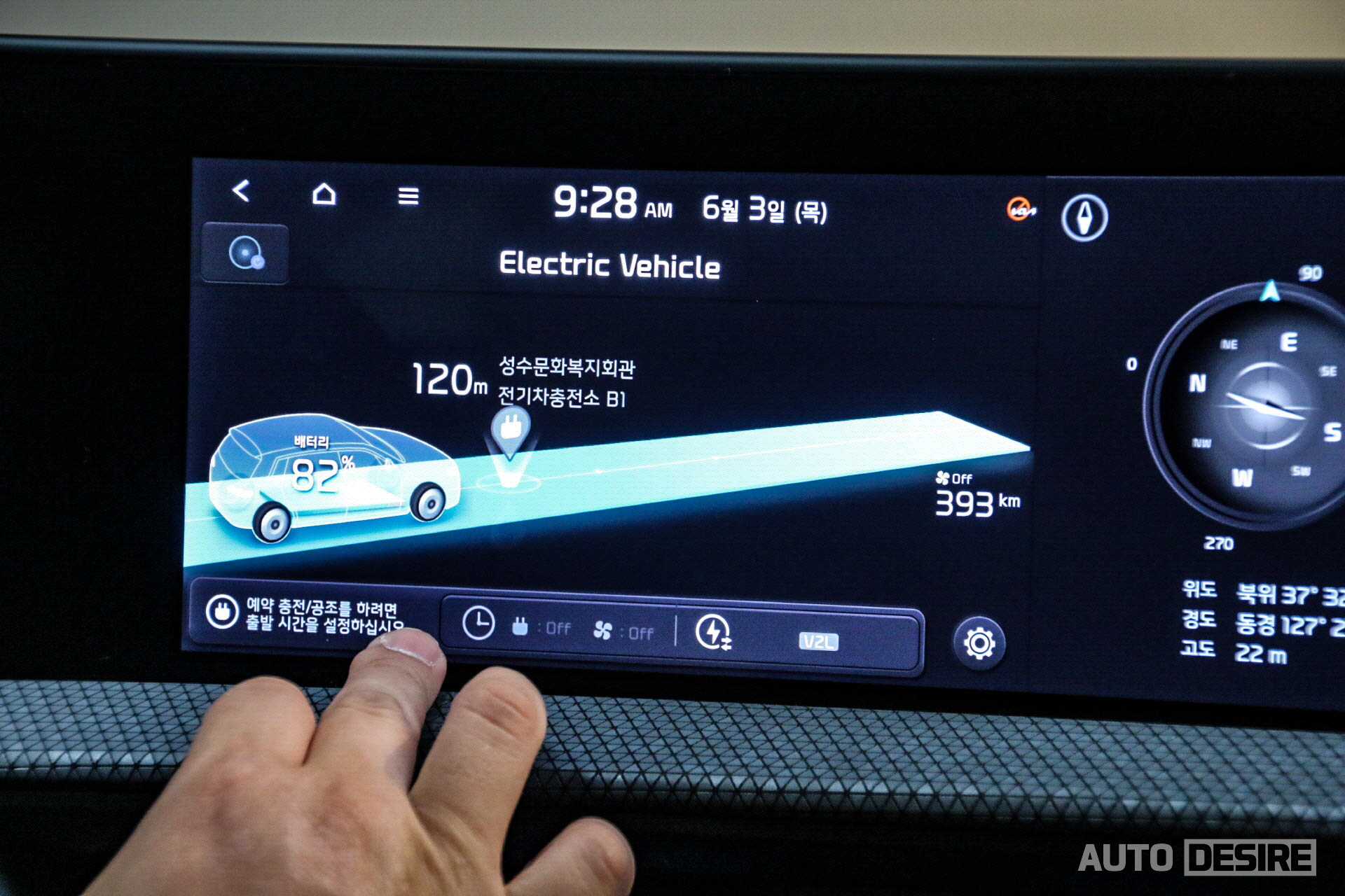 인포테인먼트 시스템이 인터페이스는 색상의 차이를 빼면 빌트인 캠, 발레 모드, 기아 페이 등 편의 사양에서도 다른 기아 차량들의 구성과 거의 흡사하지만, 전기차 전용 콘텐츠가 추가되는 것과 함께, 운전자 보조 설정 메뉴의 그래픽 구성도 새롭게 변경되었고, 엔진이 없는 전기차에서도 고객의 취향에 맞게 주행 중 다이내믹한 느낌을 살릴 수 있도록 액티브 사운드 디자인을 스타일리시, 다이내믹, 사이버와 함께 사용자가 원하는 음색으로 설정도 가능하게 해준다. 송풍구 하단에는 공조 컨트롤러 - 멀티미디어 전환 조작계가 적용된다.