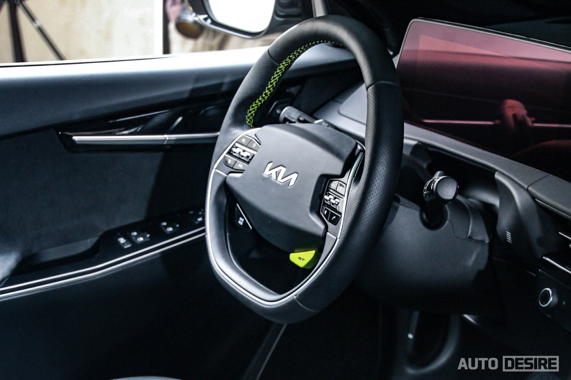 EV6 GT 라인 모델에는 D컷 스티어링 휠과 시트 및 도어 트림 등 실내 내장재에 스웨이드 소재를 적용하고, 블랙 인테리어에 화이트 포인트를 넣어 스포티한 감각을 더 높였다.