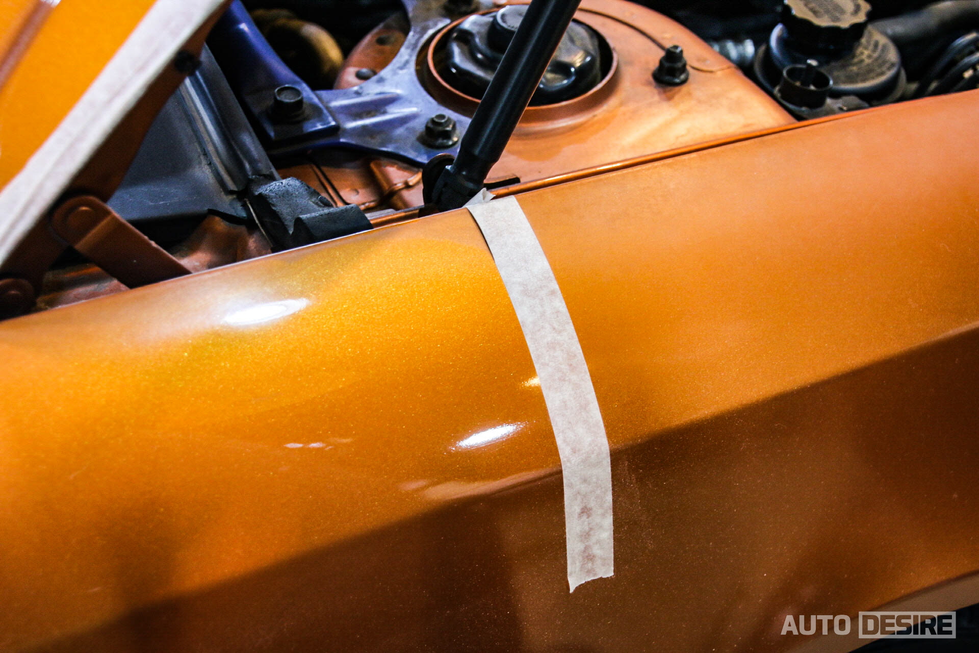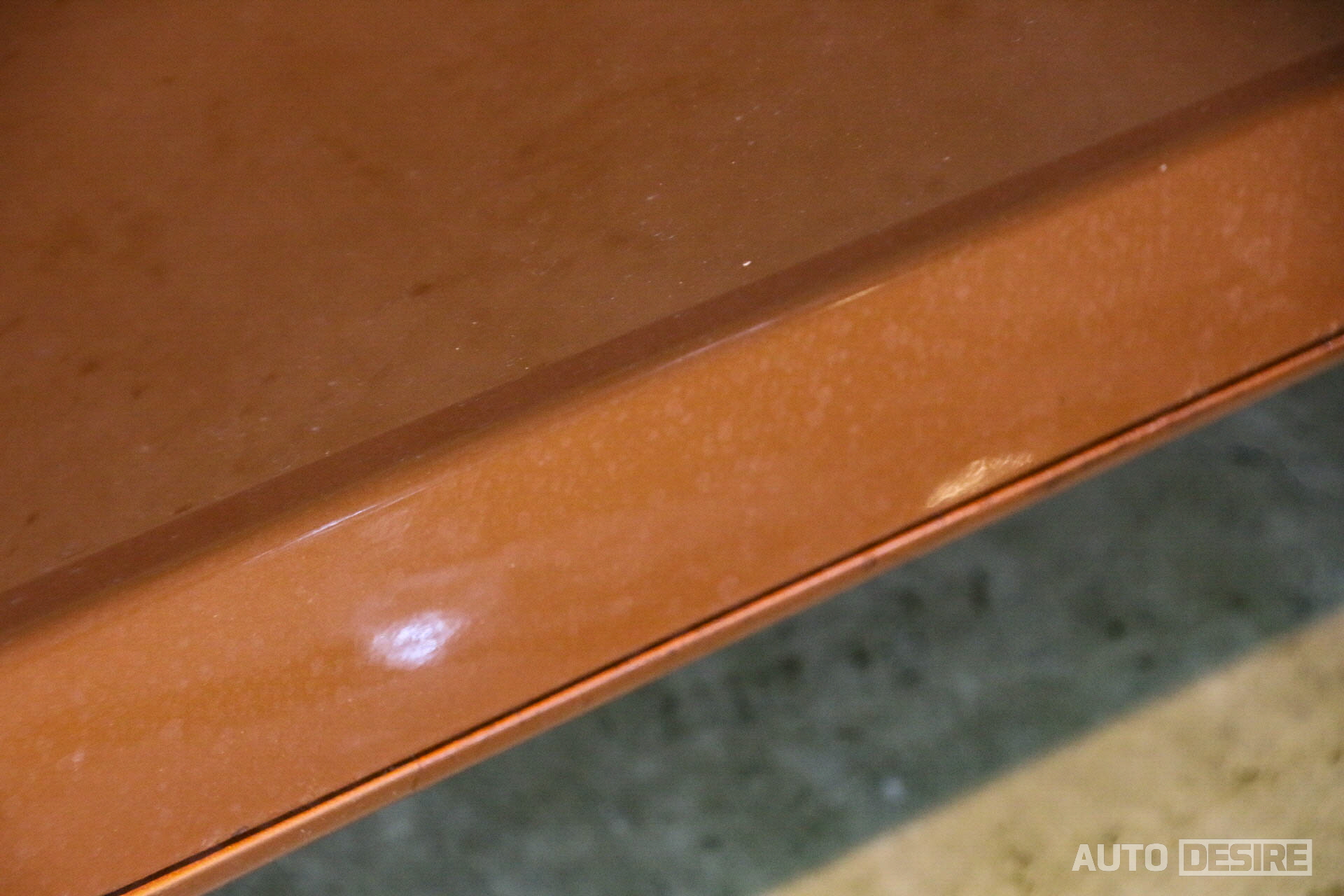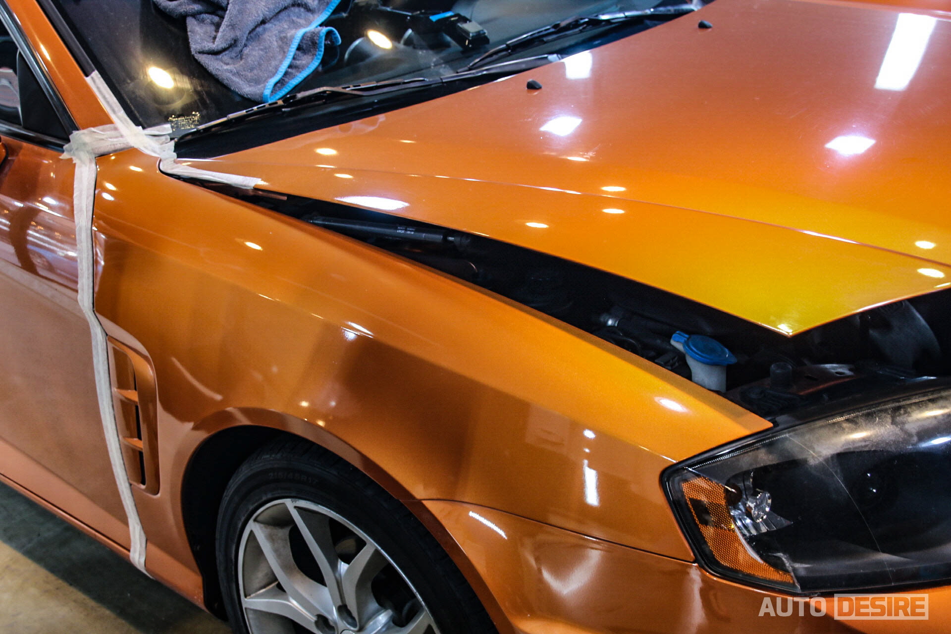 확실히 많은 광택 작업을 해온 전문 시공점이라 그런지 사장님이 한번 보시더니 살리는데 문제가 없을 거라 판단, 일단 주변 테두리 마스킹을 하고 표면을 닦아준 다음 약재를 바르고 광택 작업을 시작했다. 그리고 역시나는 역시나! 다행히 클리어층이 살아있는 상태였고, 폴리싱을 하고 나니 반짝반짝하게 투스카니의 기존 색상과 광택이 살아나는 모습! 하단 사진에 마스킹 테이프를 중심으로 비교해보면 확연하게 차이가 난다.