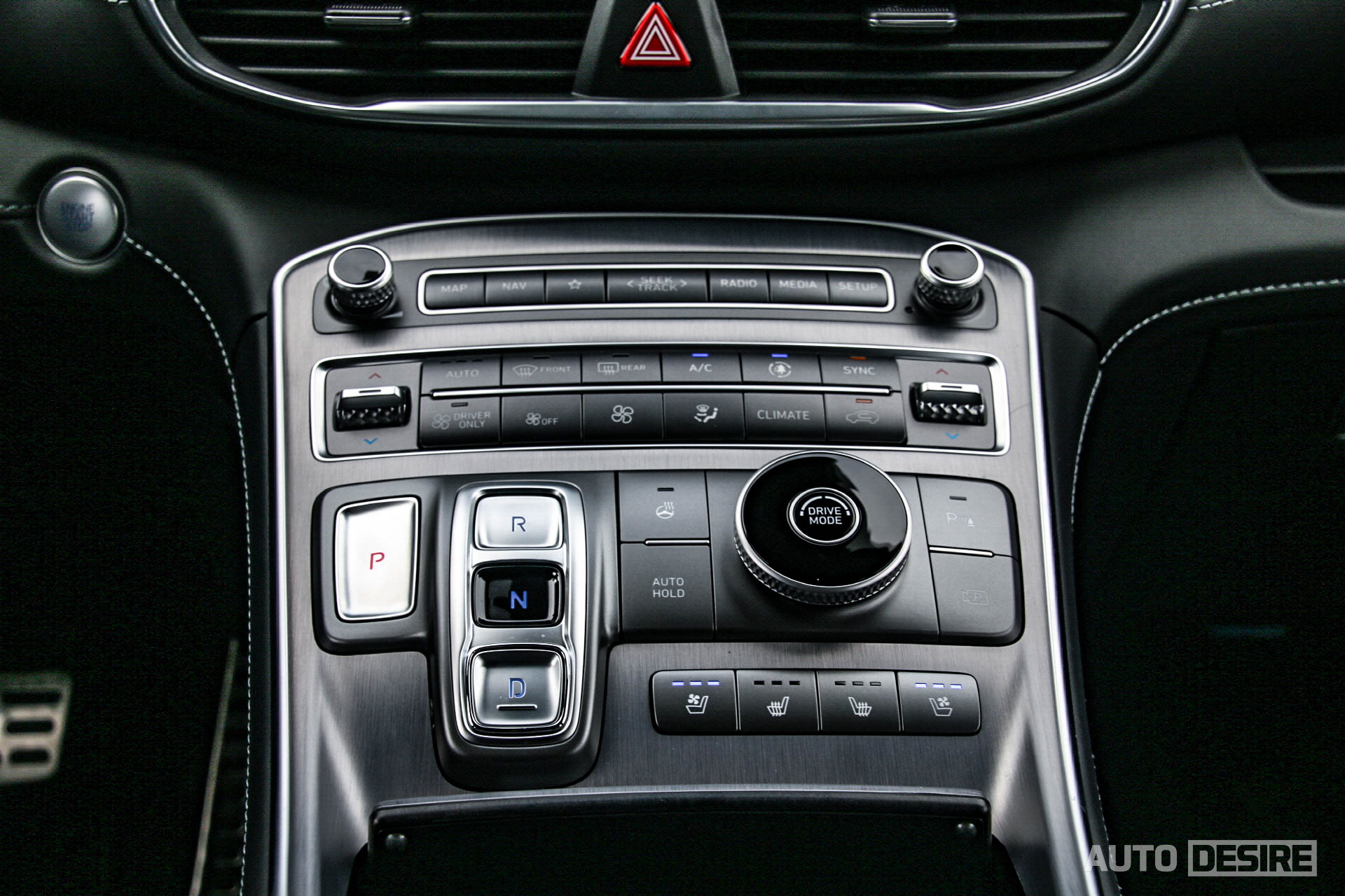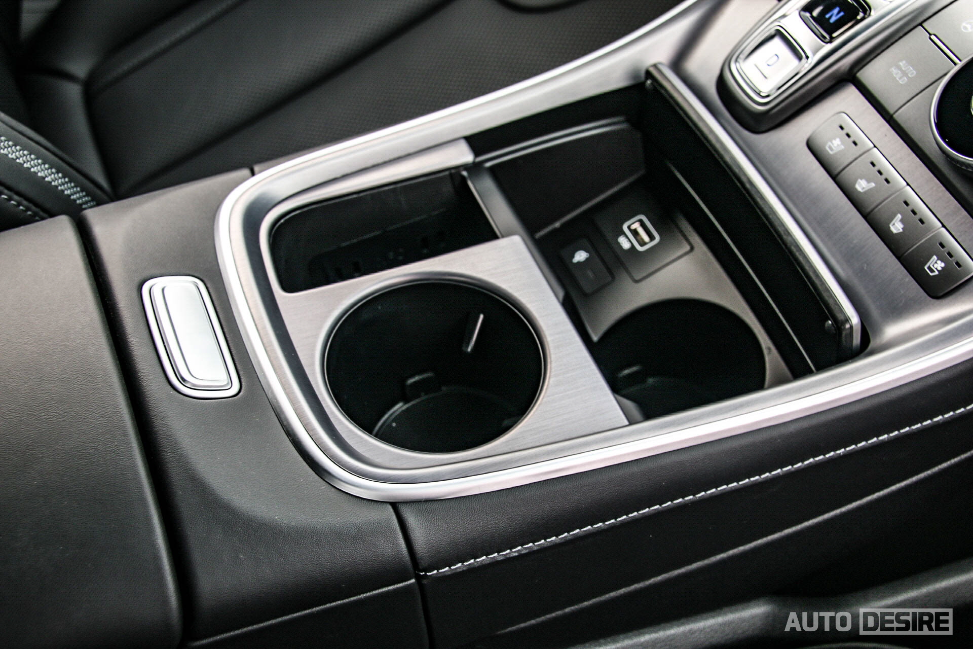 실내 역시 전체적인 디자인과 함께 캘리그래피 트림에 적용되는 나파가죽 시트와 스웨이드 헤드라이너 마감재, 편의 사양 등 다른 싼타페 모델들과 동일하게 제공된다. 센터패시아 상단의 10.25인치 디스플레이와 끊김 없이 높게 이어지는 센터 콘솔 구조와 수평형, 직관적으로 구성된 멀티미디어/공조장치 버튼, 전자식 변속 버튼과 주행 모드 변경 다이얼 등이 적용된 모습. 하단으로는 수납공간과 함께 USB 충전 포트, 12V 파워 아웃렛이 적용되고, 스마트폰 무선 충전이 도크 타입으로 적용된 건 좋지만, 상하단으로 분할된 컵홀더는 미묘하게 사용하기 불편한 경우가 좀 있다.