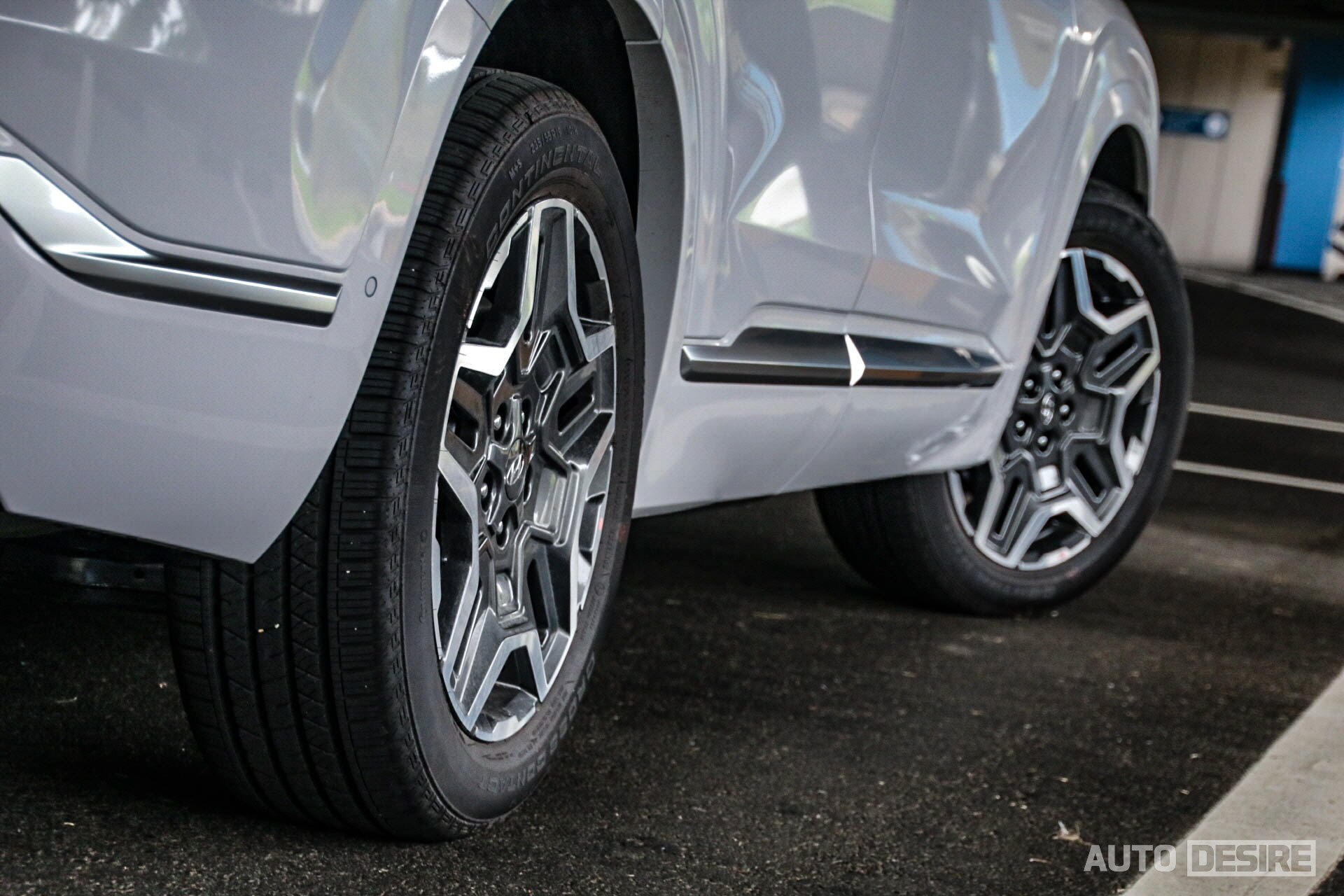 현대의 다른 하이브리드 차량들처럼 타이어도 가솔린/디젤과 특별히 차이를 두지는 않아, 먼저 탔던 2.5 가솔린 터보 모델과 동일하게 콘티넨탈 크로스콘택트 LX 스포츠 타이어가 235/55/R19 사이즈로 사이즈만 다르게 순정 출고 타이어로 장착된다. 공력 성능에서는 효율성을 높이기 위해 하이브리드 전용 디자인의 19인치 휠을 적용했는데, 스타일에선 아쉬움이 좀 남는다. 개인적으로 가솔린/디젤 캘리그래피 모델의 휠이 나은 것 같다.