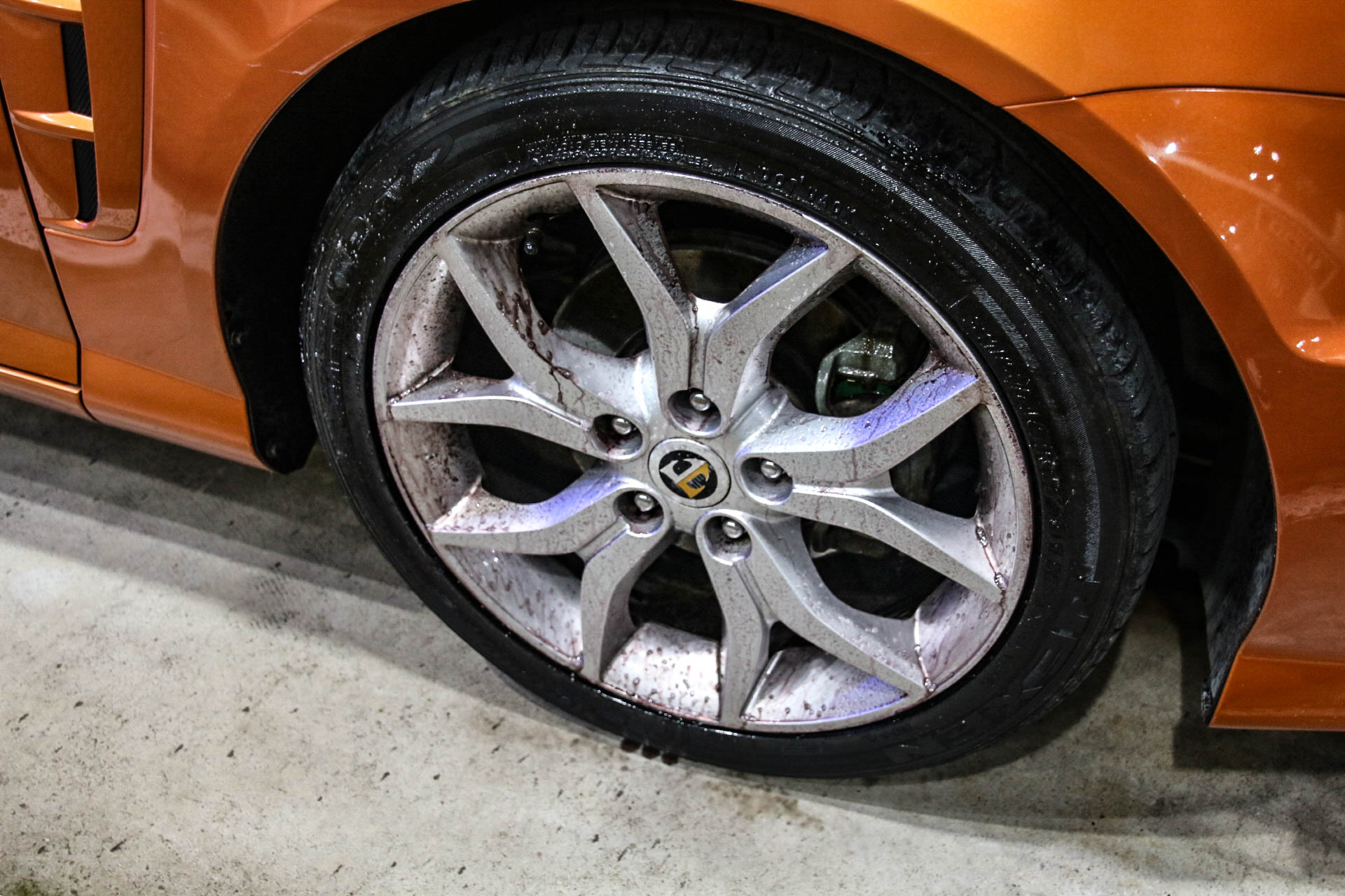그나마 차체 외장은 심하게 더러워지는 편이 아니기는 한데.. 흠. 어째서인지 차체보다 유독 더 많이 더러워지는 곳이 있으니 바로 휠이다. 순정 브레이크 패드를 사용 중이라 분진이 생각보다 안 나올 줄 알았는데, 투스카니 순정 패드도 은근히 분진은 많이 나오는 편. 때문에 휠, 특히나 앞 바퀴 휠은 조금만 지나도 요렇게 시커멓게 지저분한 때가 금방 쌓여있는 걸 볼 수 있다.