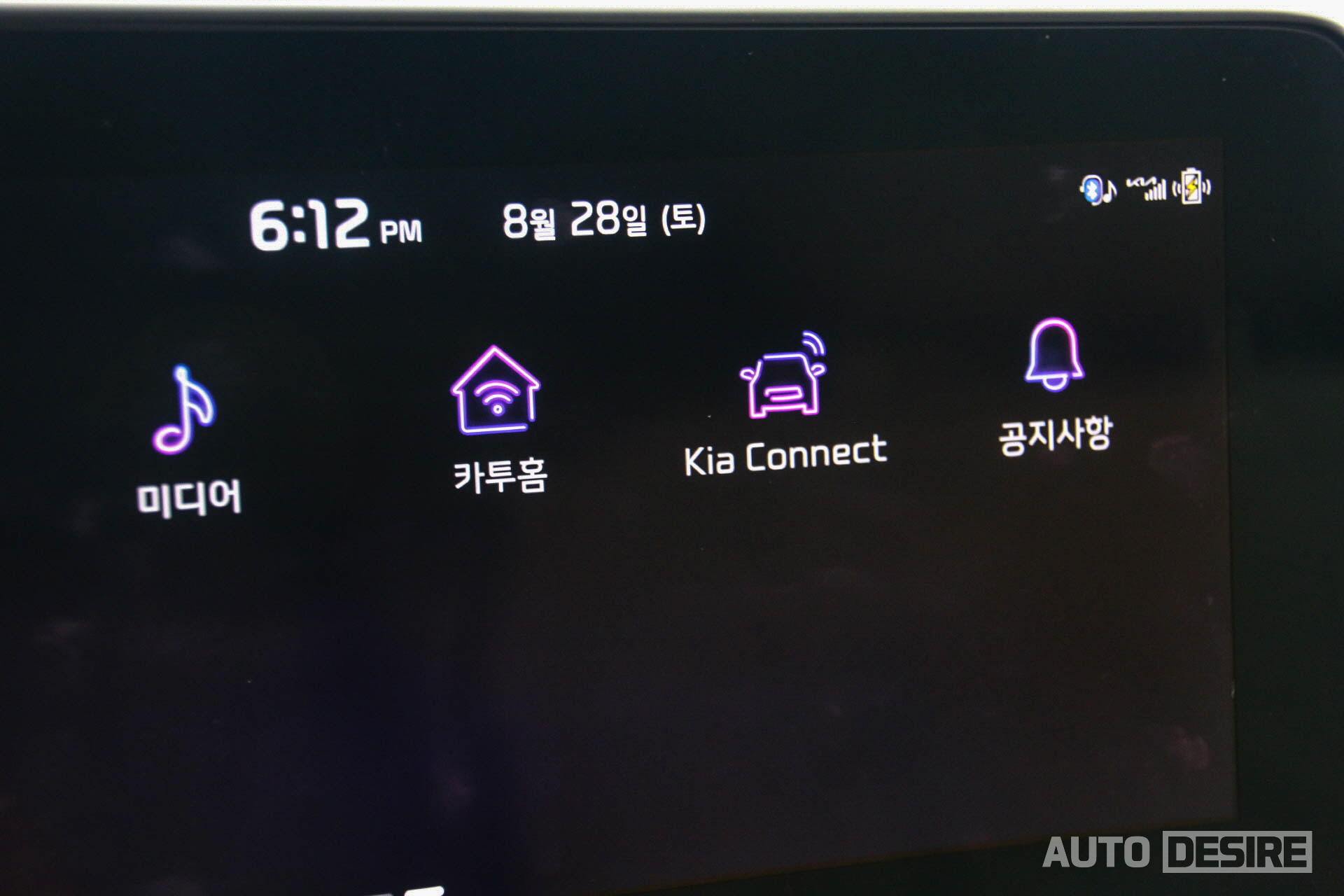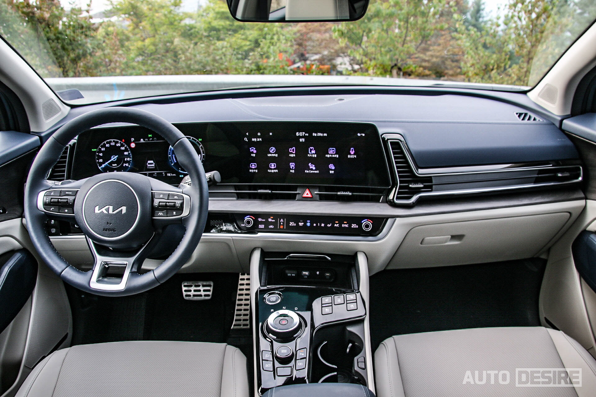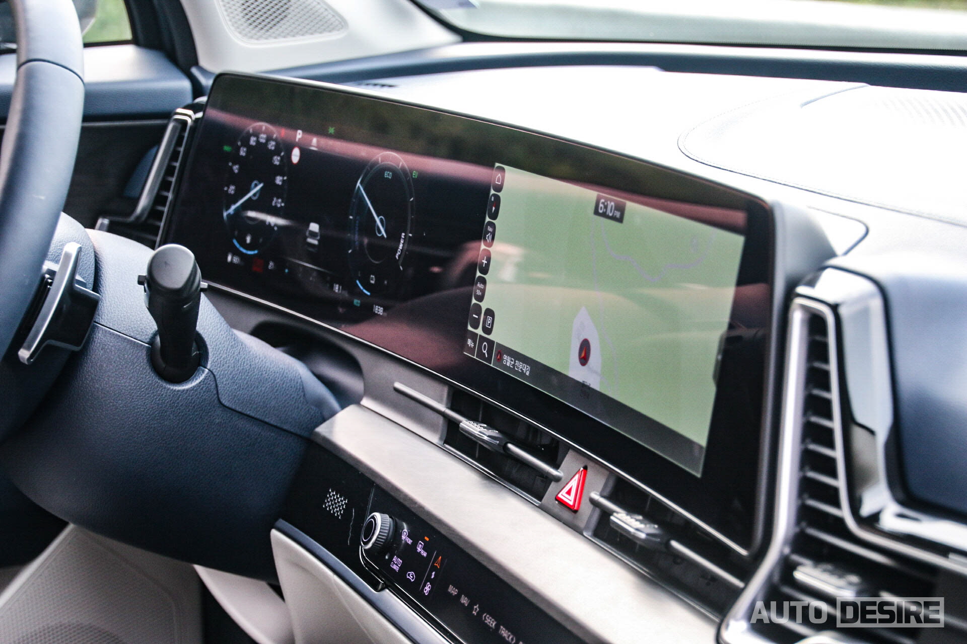 12.3인치 디지털 클러스터와 12.3인치 내비게이션이 쭉 이어지는 파노라믹 디스플레이와 공조장치/멀티미디어 터치 전환 조작계는 준대형 세단인 K8, 전기차 EV6와도 공유하는 부분으로 기본 배치는 동일한 모습이며, 디스플레이의 사이즈와 깔끔함, 일체감에 있어서는 오히려 쏘렌토보다 더 우위에 있는 느낌이다. 센터 콘솔은 각 버튼들의 위치, 높이를 어색하지 않게 잘 맞춰두었고 센터 콘솔로 이동한 시동 버튼과 변속 다이얼, 그 외 버튼들과 개방형 컵홀더까지 사용하는데 편리하게 배치되었다. 먼지, 지문, 흠집에 취약한 블랙 하이그로시 재질이라는 것이 필자의 개인적인 아쉬움. 대신 변속 다이얼과 센터 콘솔을 감고 도는 실내 무드램프는 야간에 굉장히 예쁜 편.