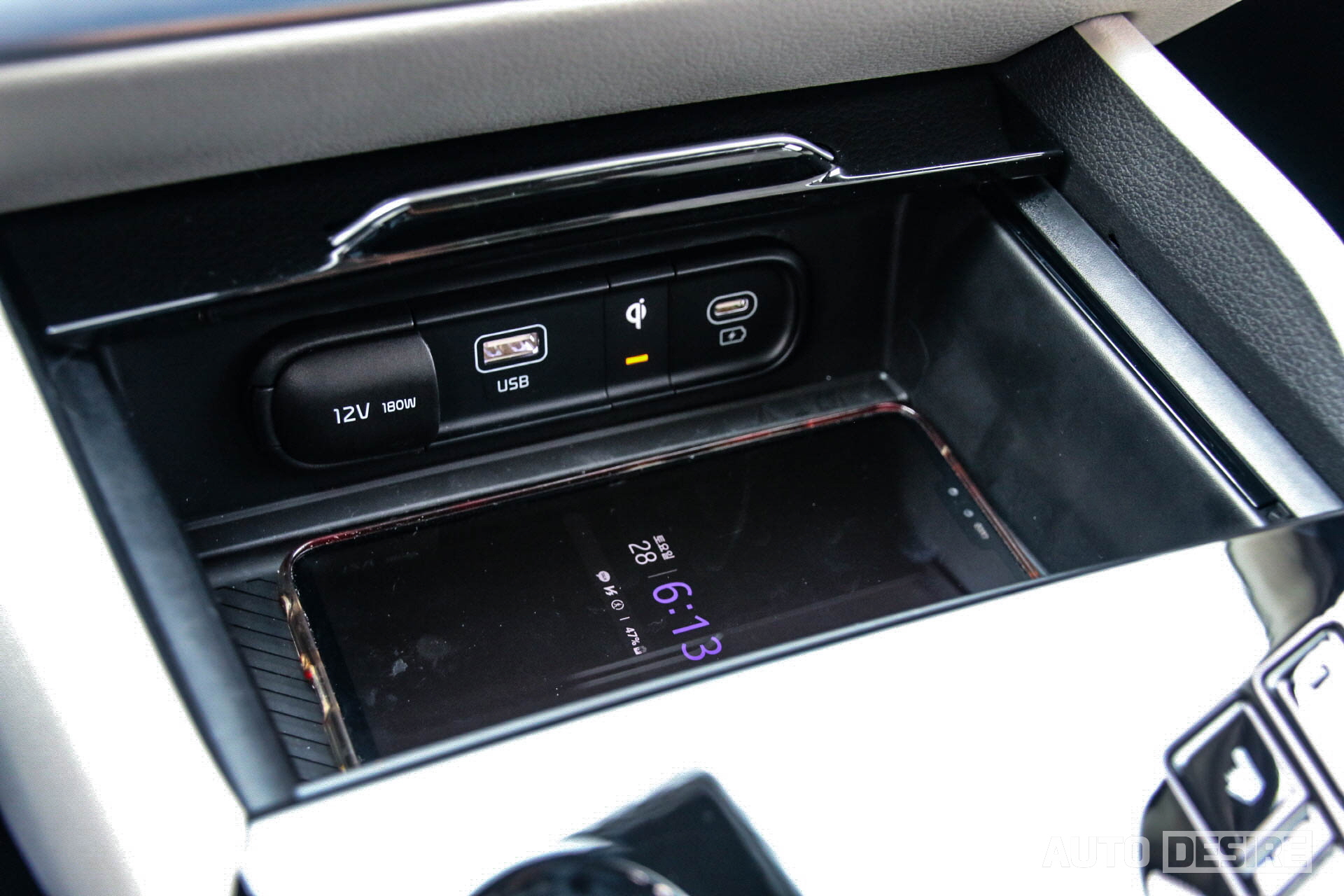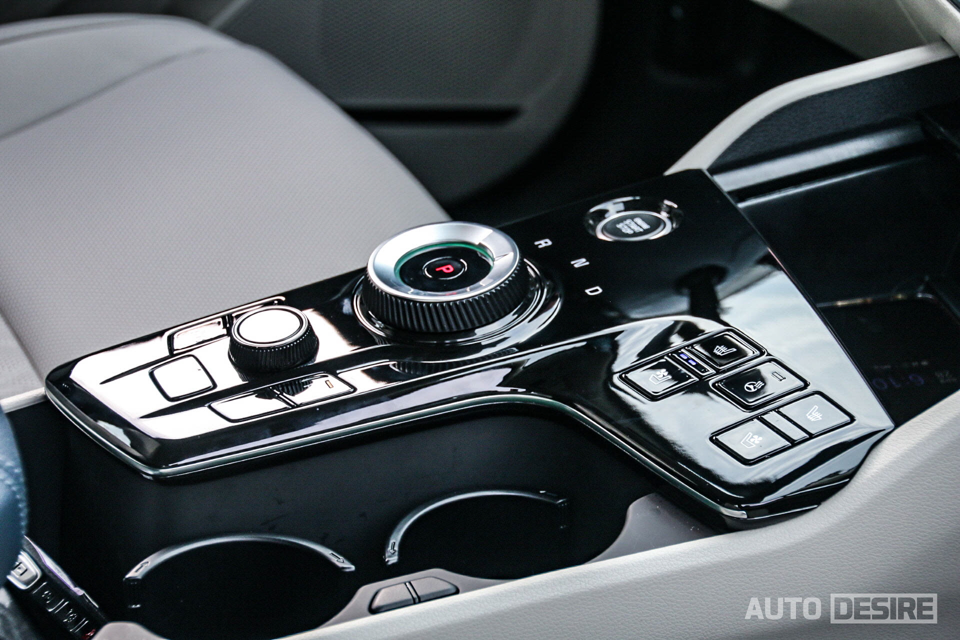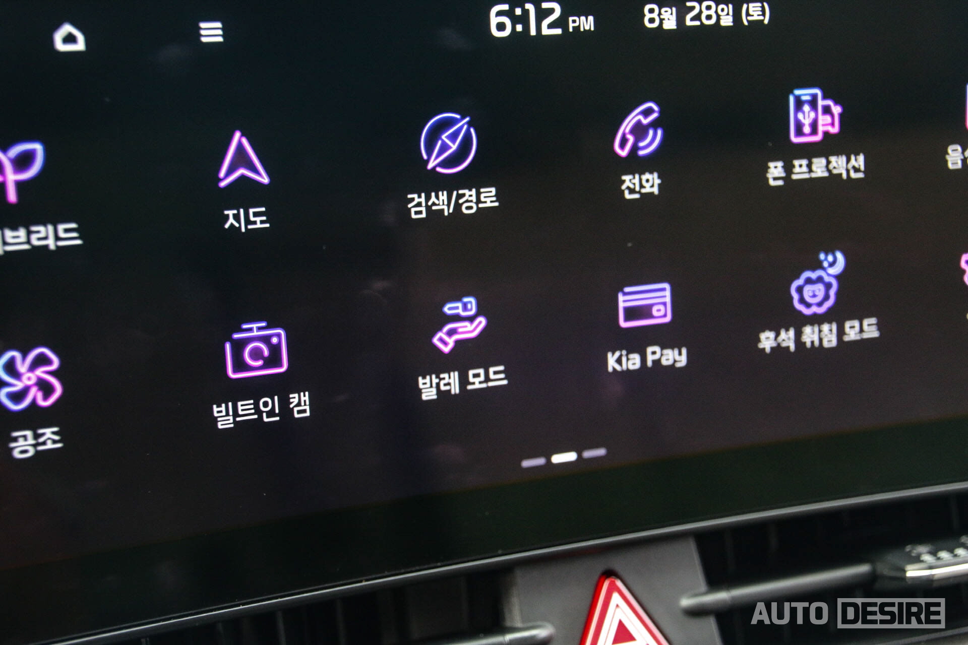 12.3인치 디지털 클러스터와 12.3인치 내비게이션이 쭉 이어지는 파노라믹 디스플레이와 공조장치/멀티미디어 터치 전환 조작계는 준대형 세단인 K8, 전기차 EV6와도 공유하는 부분으로 기본 배치는 동일한 모습이며, 디스플레이의 사이즈와 깔끔함, 일체감에 있어서는 오히려 쏘렌토보다 더 우위에 있는 느낌이다. 센터 콘솔은 각 버튼들의 위치, 높이를 어색하지 않게 잘 맞춰두었고 센터 콘솔로 이동한 시동 버튼과 변속 다이얼, 그 외 버튼들과 개방형 컵홀더까지 사용하는데 편리하게 배치되었다. 먼지, 지문, 흠집에 취약한 블랙 하이그로시 재질이라는 것이 필자의 개인적인 아쉬움. 대신 변속 다이얼과 센터 콘솔을 감고 도는 실내 무드램프는 야간에 굉장히 예쁜 편.