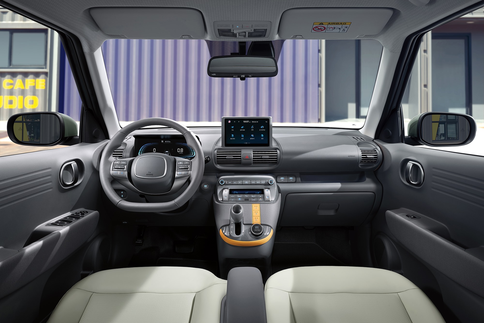 1열 시트는 벤치타입으로 적용, 운전석과 동승석 이동이 용이하게 만들었고, 중앙에 컵홀더와 암레스트를 적용, 기본적인 편의성도 챙겼다. 또 투톤 컬러를 적용해 고객의 취향에 맞게, 젊은 감각으로 선택할 수 있게 했고 모던 트림에는 보라색 단색 실내 무드램프를 적용하고 인스퍼레이션에서는 하운스 투스(새발 격자 무늬) 패턴 헤드라이너를 적용해 캐스퍼만의 감성을 담았다고 한다.