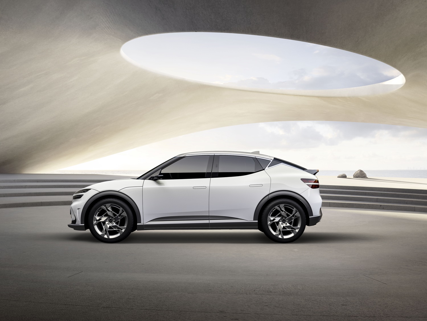 측면부는 짧은 오버행에 2,900mm의 긴 휠베이스와 함께 후드부터 루프라인, 리어 스포일러까지 쭉 이어지는 쿠페 스타일로 역동적인 느낌을 전한다. C 필러에는 번개 모양을 형상화한 '볼트 DLO' 장식을 넣어 전기차로서의 특별한 이미지를 담았다. 후면에서도 전면부와 통일되는 투 라인 테일램프를 적용하고, 루프 끝단-리어 글라스 하단 끝부분에 고정형 리어 윙 스포일러를 장착해 고성능 EV 이미지를 강조하고, 공력 성능에도 도움이 될 것으로 보인다.