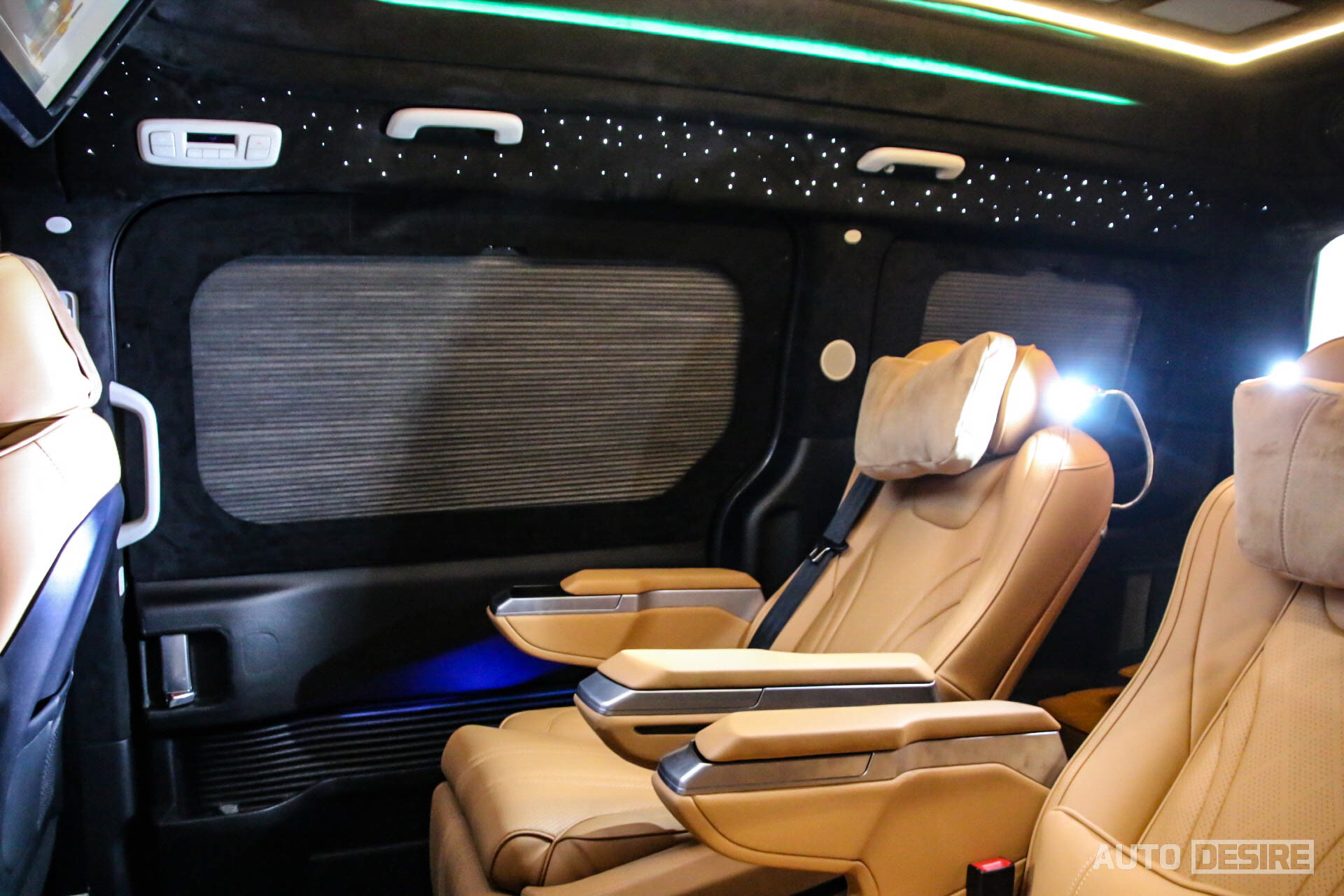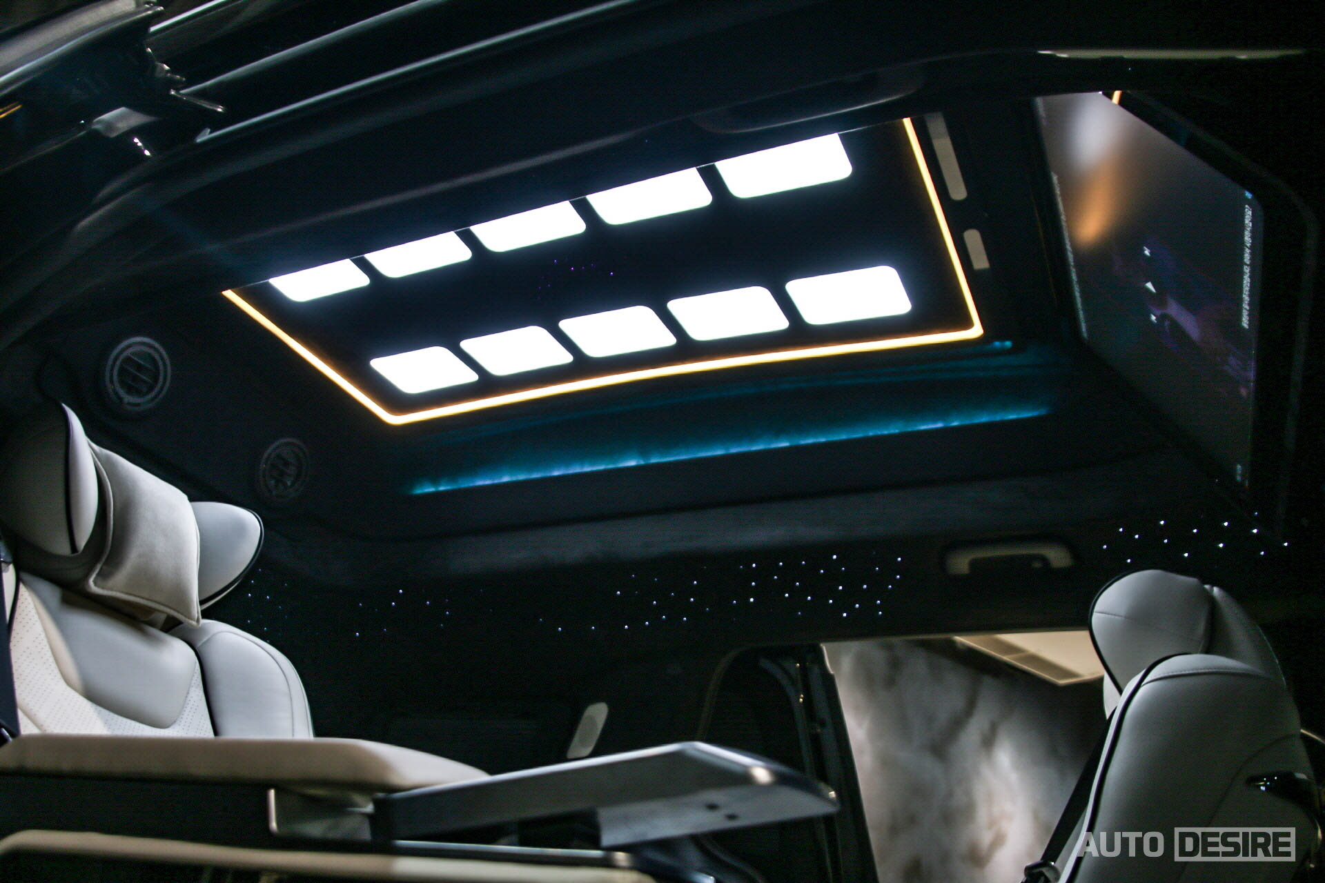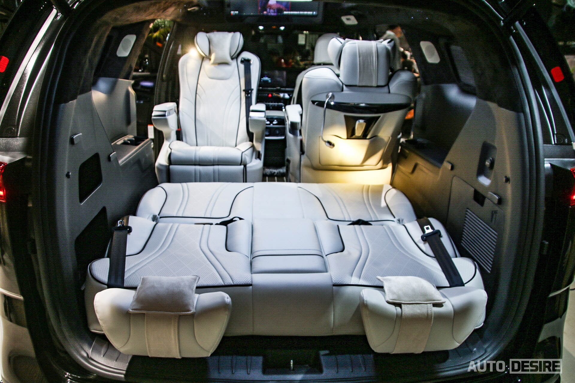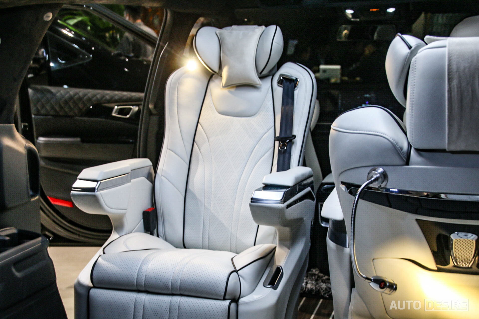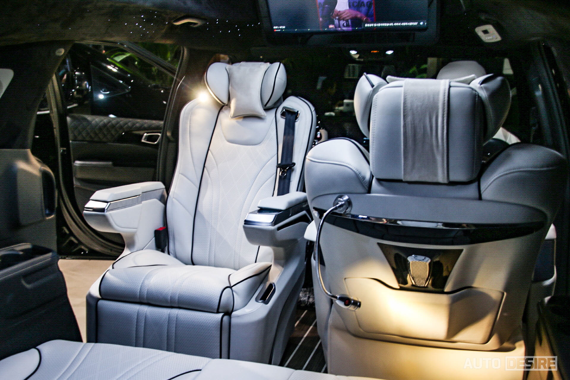 이 외에 승객의 프라이버시 보호를 위해 2열과 3열, 리어 윈도우에 블라인드를 장착하고 블라인드 프레임도 스웨이드 재질로 마감되어 있으며, 시트 뒤쪽으로 조절 가능한 독서등을 마련해, 이동 중에 독서를 하거나 서류 확인, 업무 등을 볼 때에 편하게 이용할 수 있어 보인다.