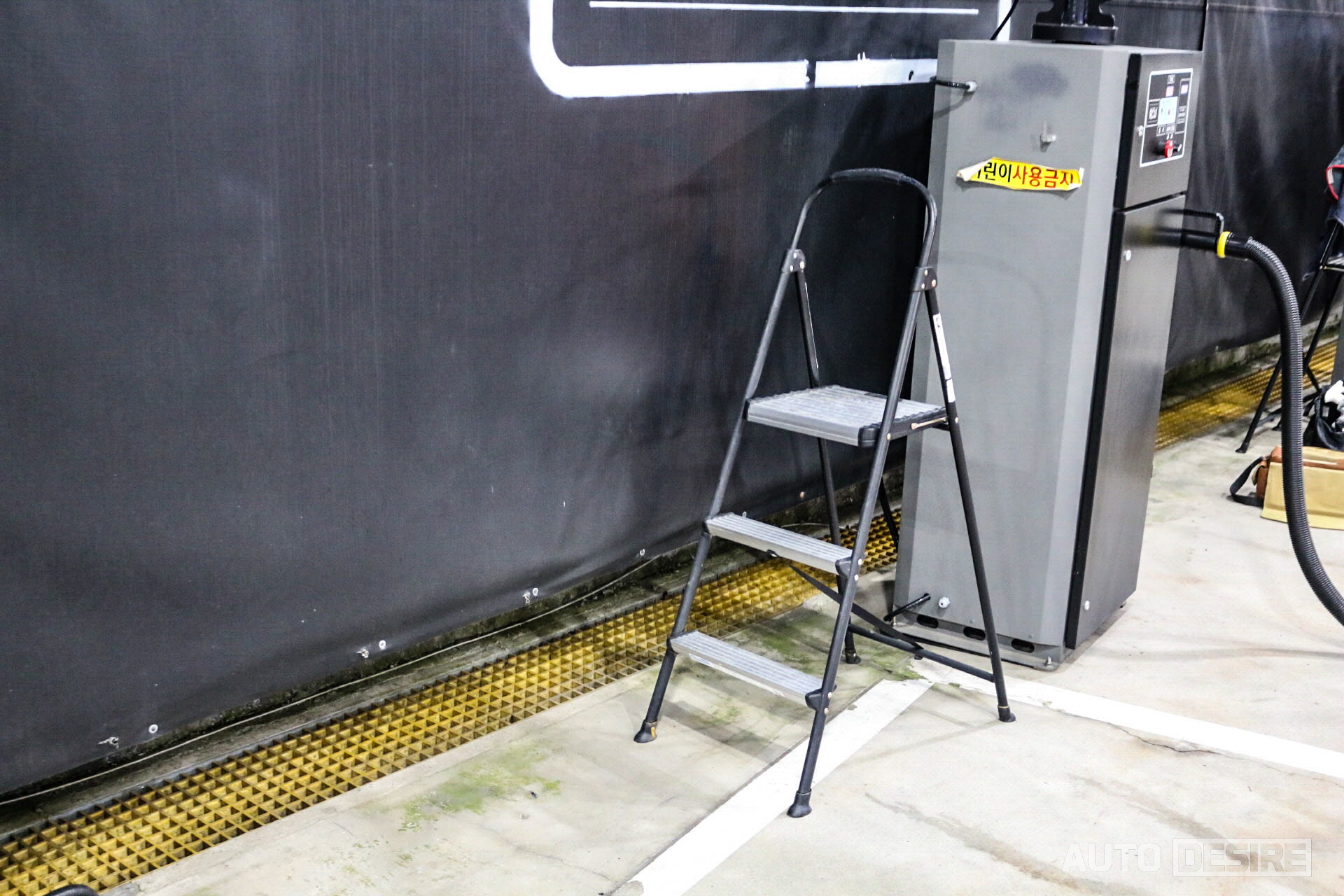 타월과 매트를 세척할 수 있는 세척장은 동파 방지 목적도 있겠지만 폴딩 도어가 장착되어 있어 겨울에도 따뜻하게 이용할 수 있고, 개수대도 넉넉한 편. 드라잉존에는 청소기마다 바로 옆에 A형 사다리가 있어서 SUV나 밴처럼 높은 차량 고객들도 드라잉을 편하게 할 수 있게 준비되어 있다.